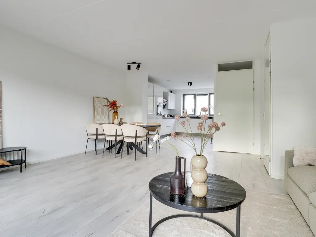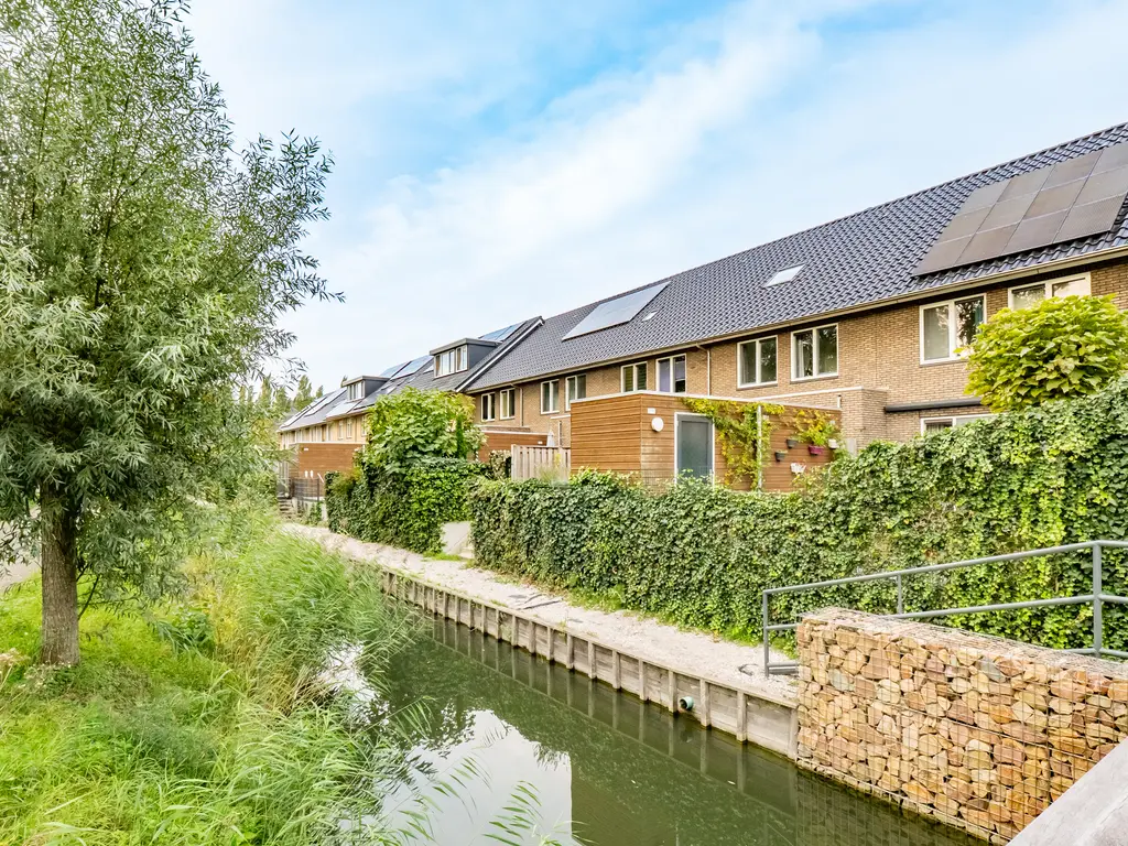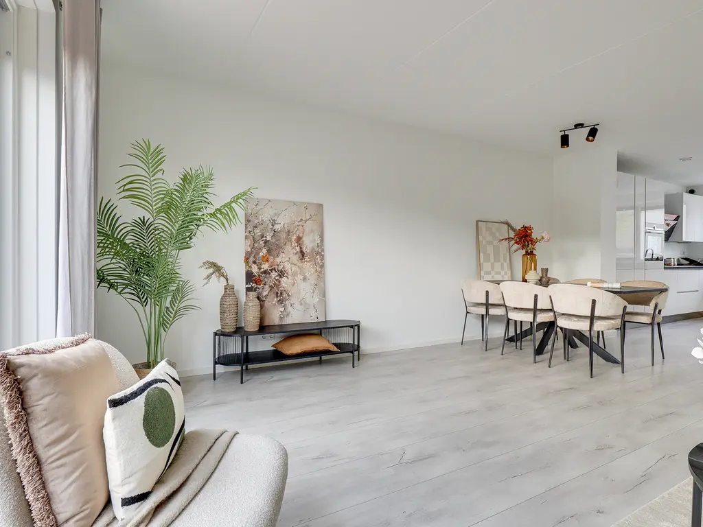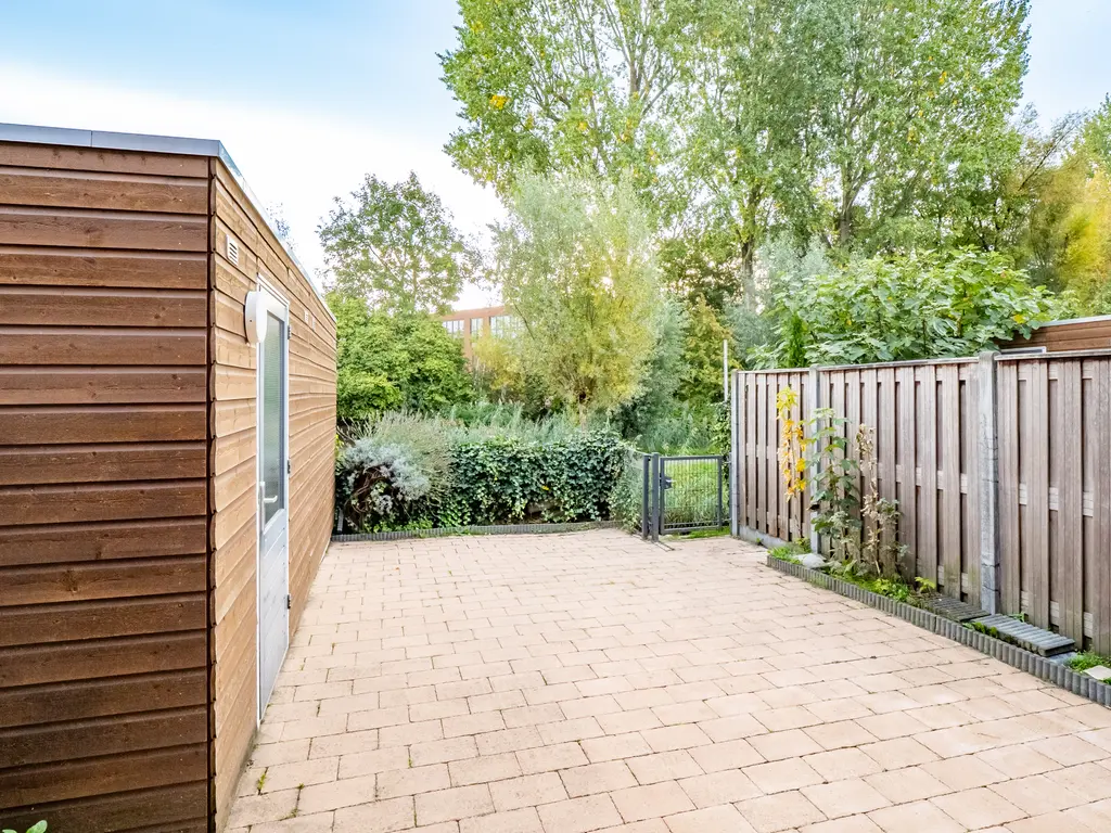 De uitgebouwde woonkamer is heerlijk licht en biedt volop ruimte voor een fijne zithoek en grote eettafel. Via de schuifpui bereik je de zonnige achtertuin met vrij uitzicht over water en groen. Hier geniet je in de zomermaanden van de ochtendzon tot laat in de middag.