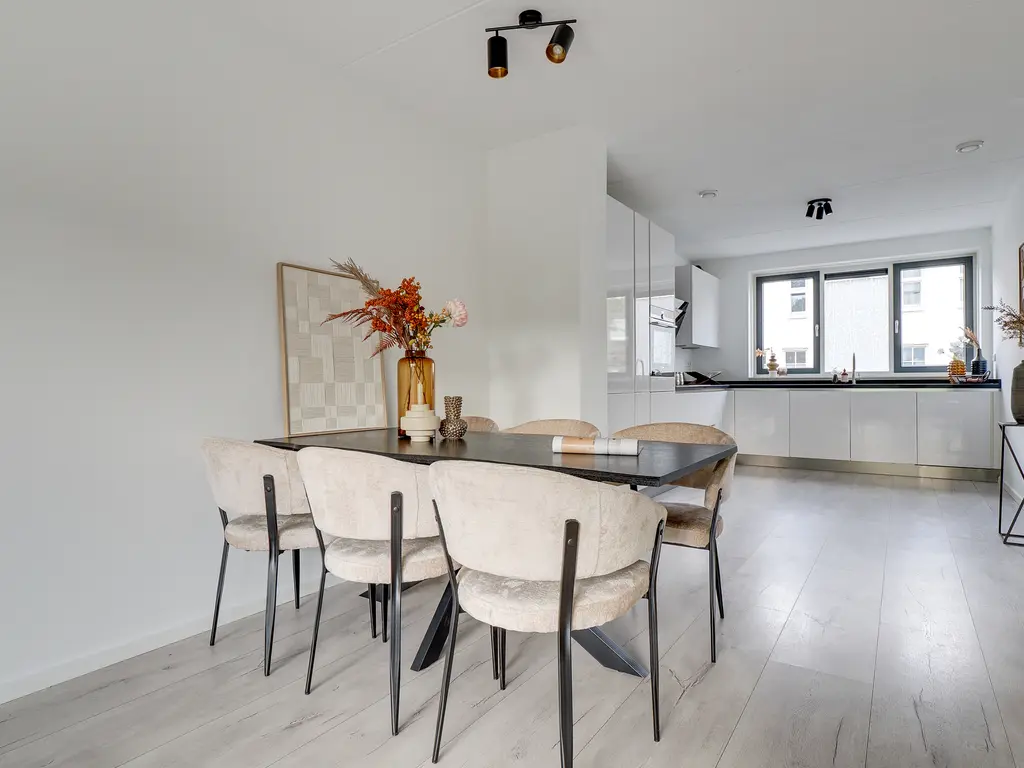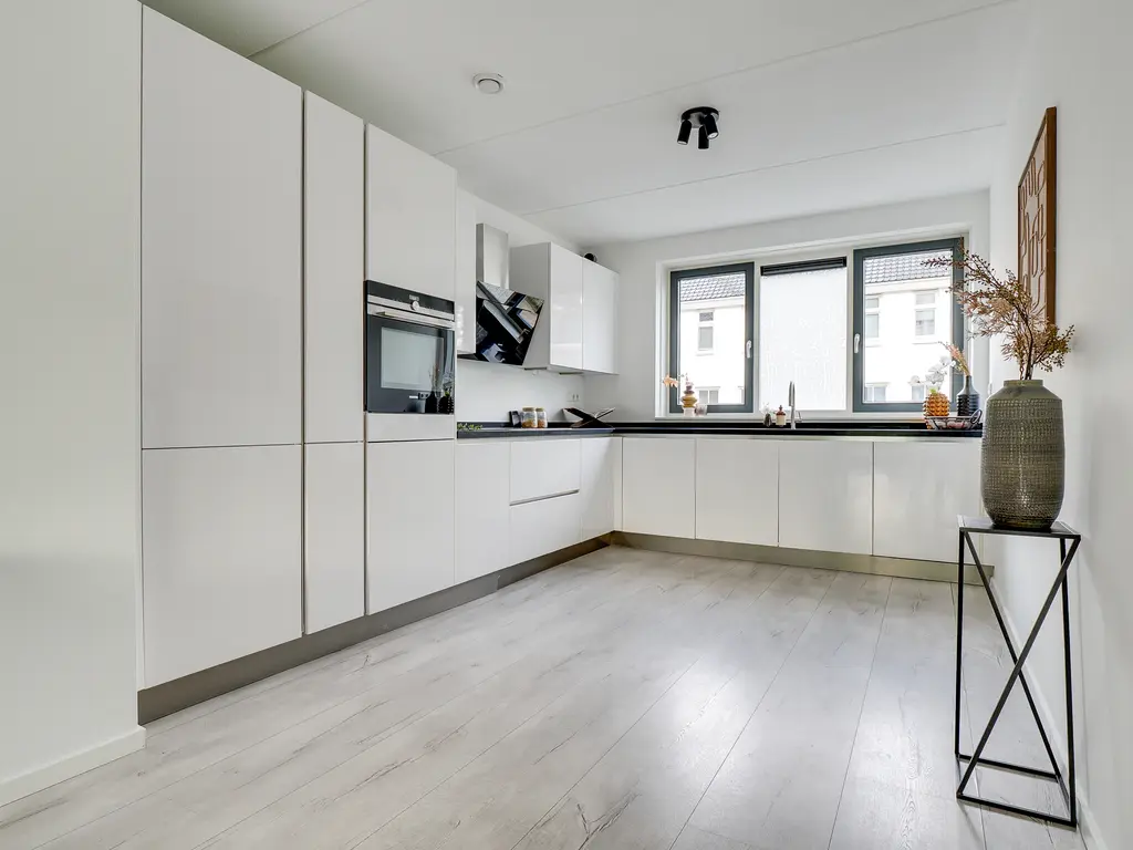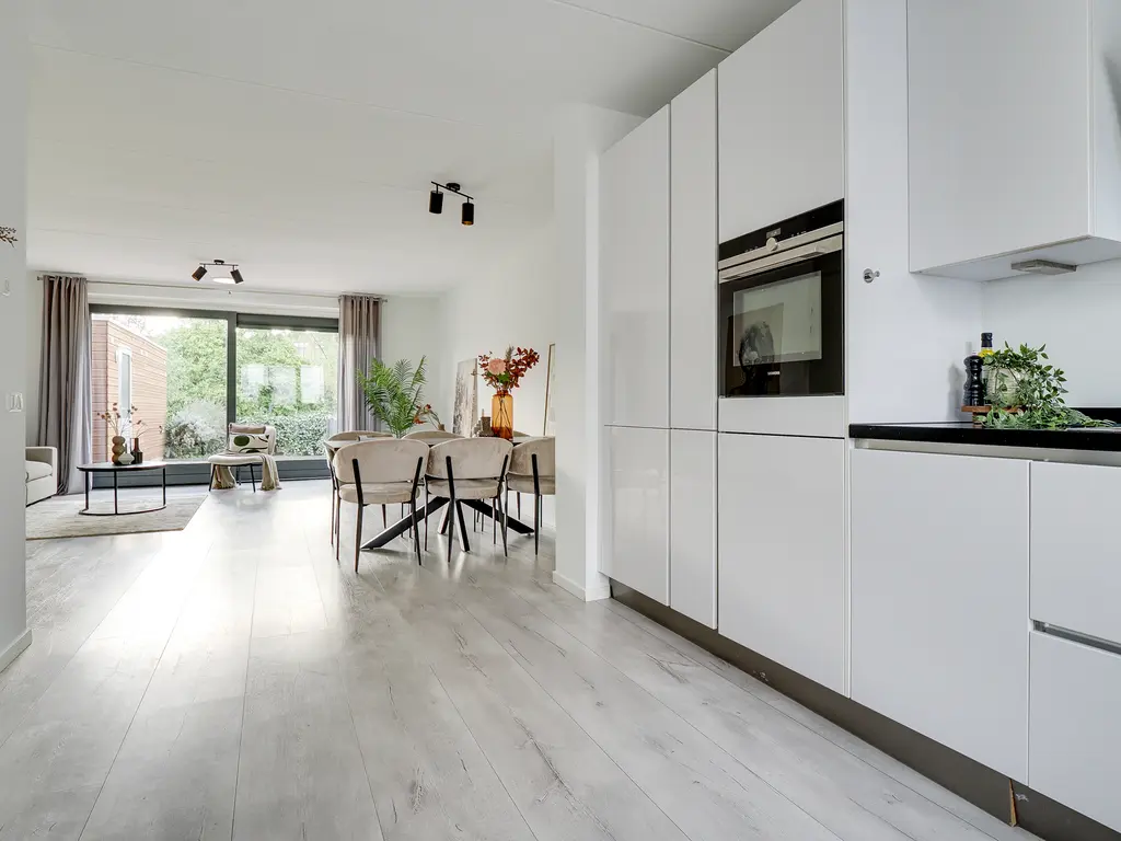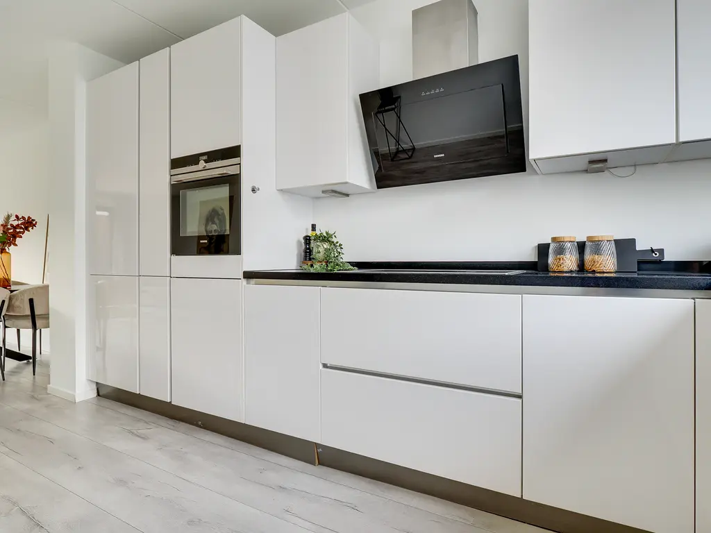 Aan de voorzijde ligt de moderne open Siemens keuken, volledig uitgerust met diverse Siemens inbouwapparatuur. De gehele begane grond is strak afgewerkt met een laminaatvloer en voorzien van vloerverwarming – comfortabel en onderhoudsvriendelijk.