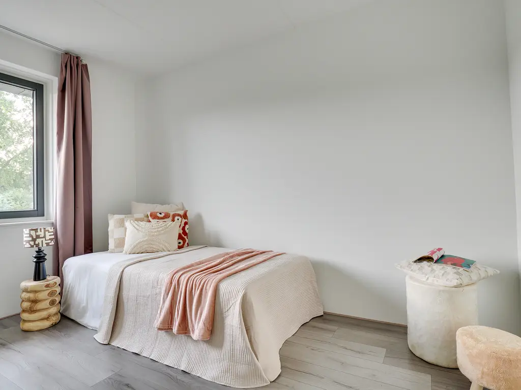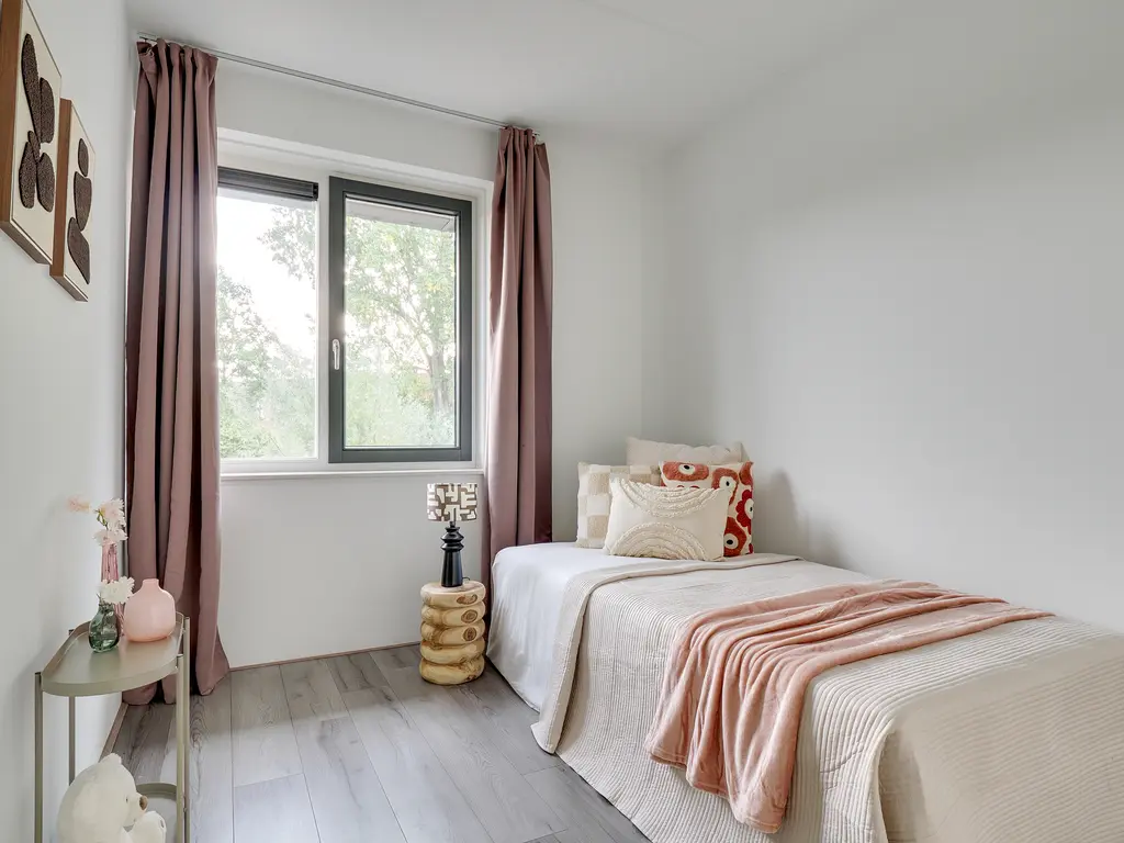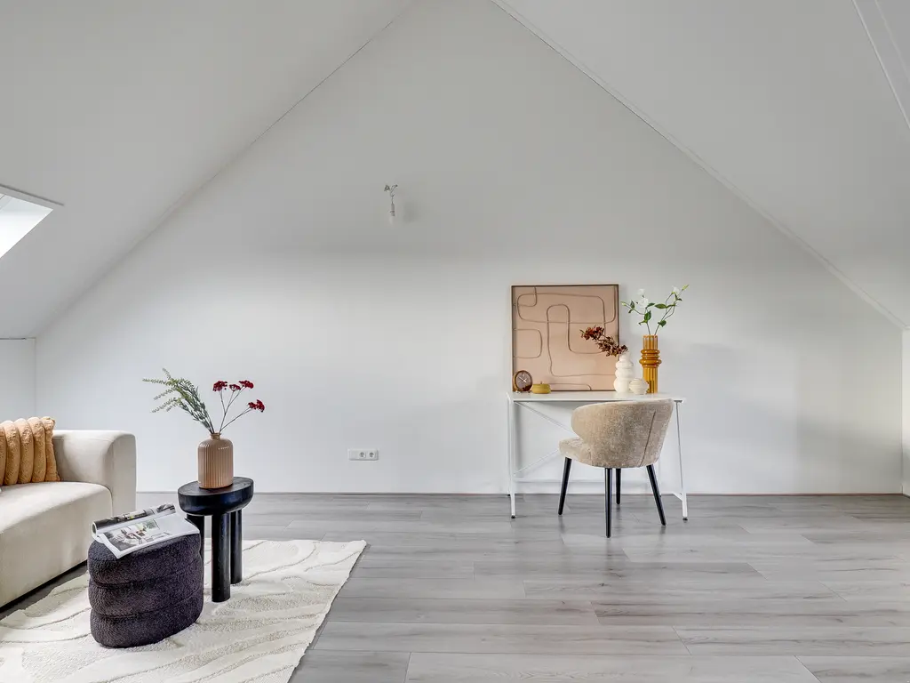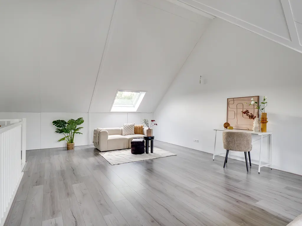 De tweede verdieping is een royale open ruimte met een hoge nok en veel lichtinval. Deze verdieping biedt volop mogelijkheden: een extra slaapkamer, een werkkamer, speelruimte of zelfs een combinatie hiervan. Ook vind je hier de aansluitingen voor de wasmachine en droger.