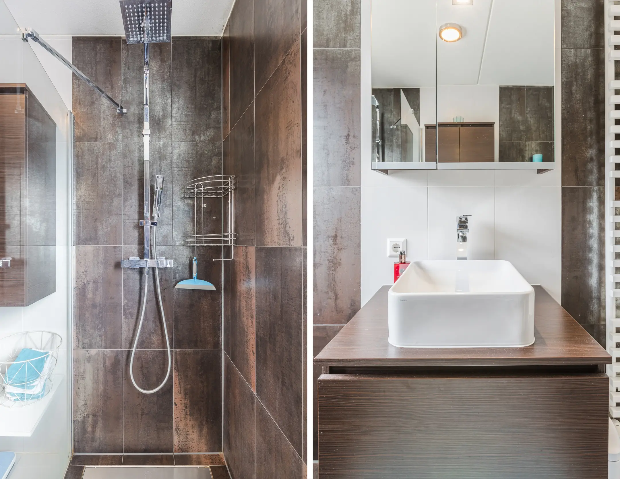 De comfortabele badkamer is uitgerust met een inloopdouche—dus geen gedoe met hoge randen—en netjes afgewerkt.