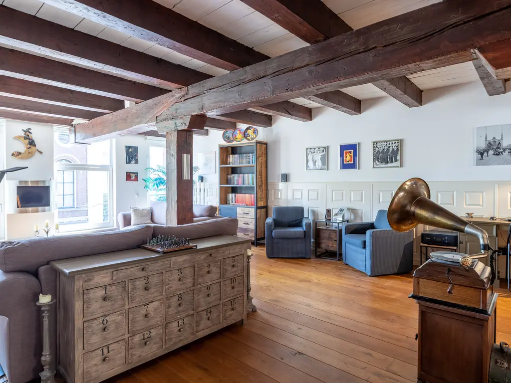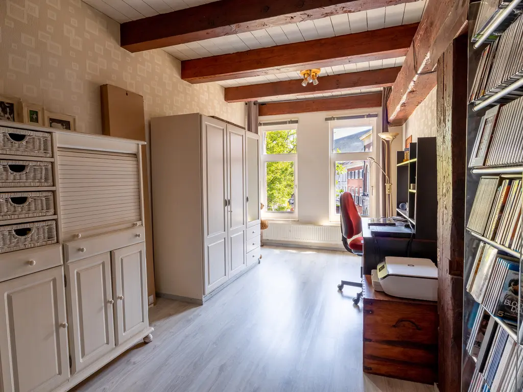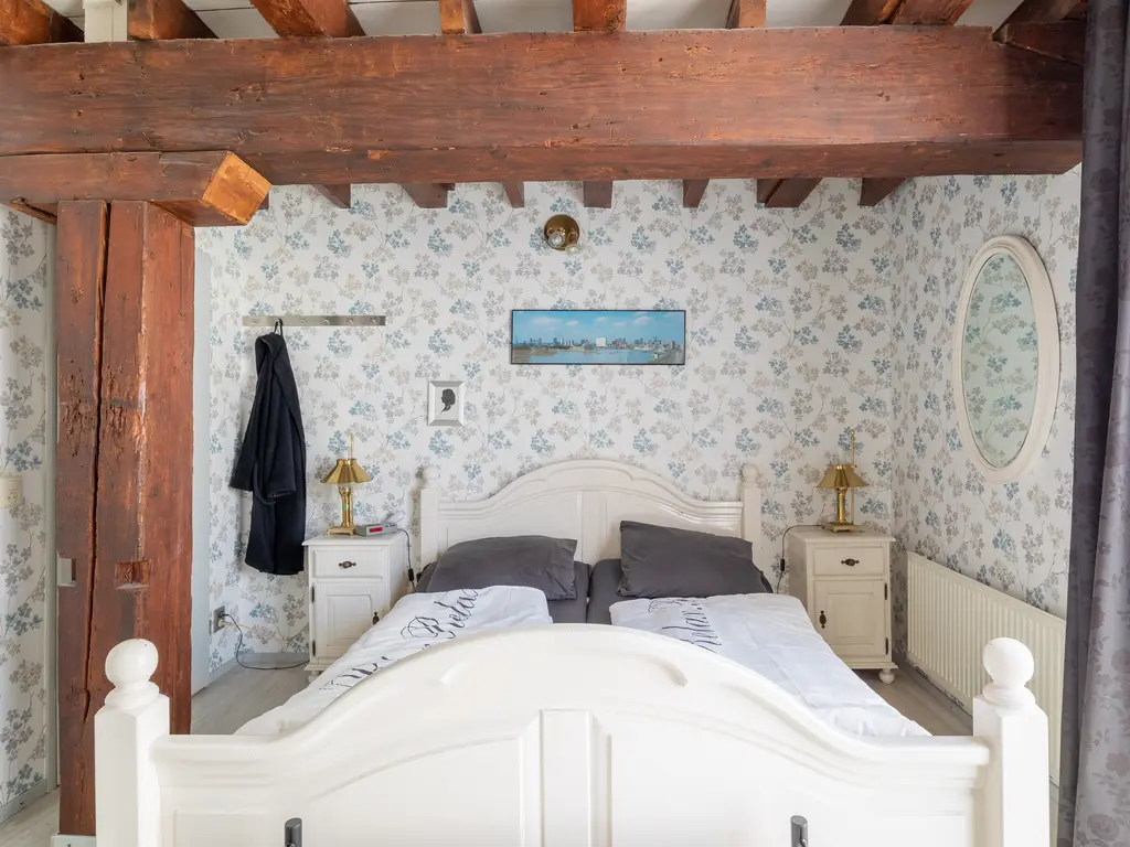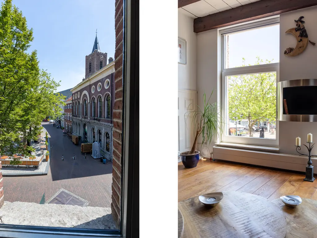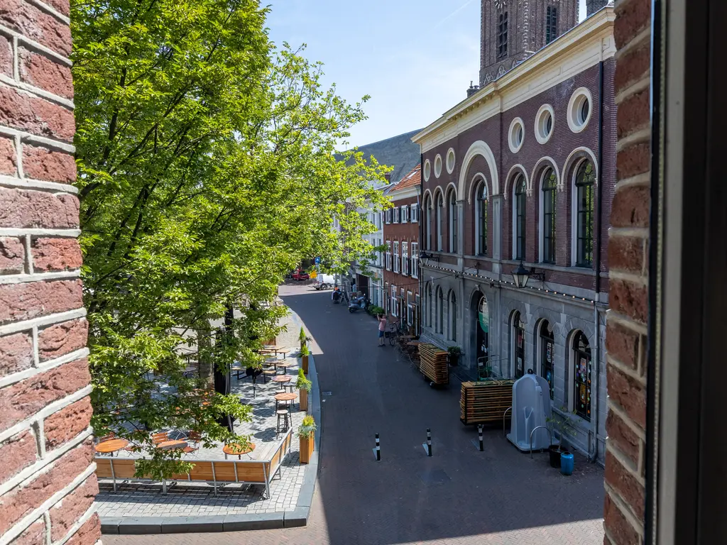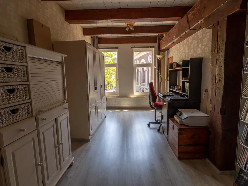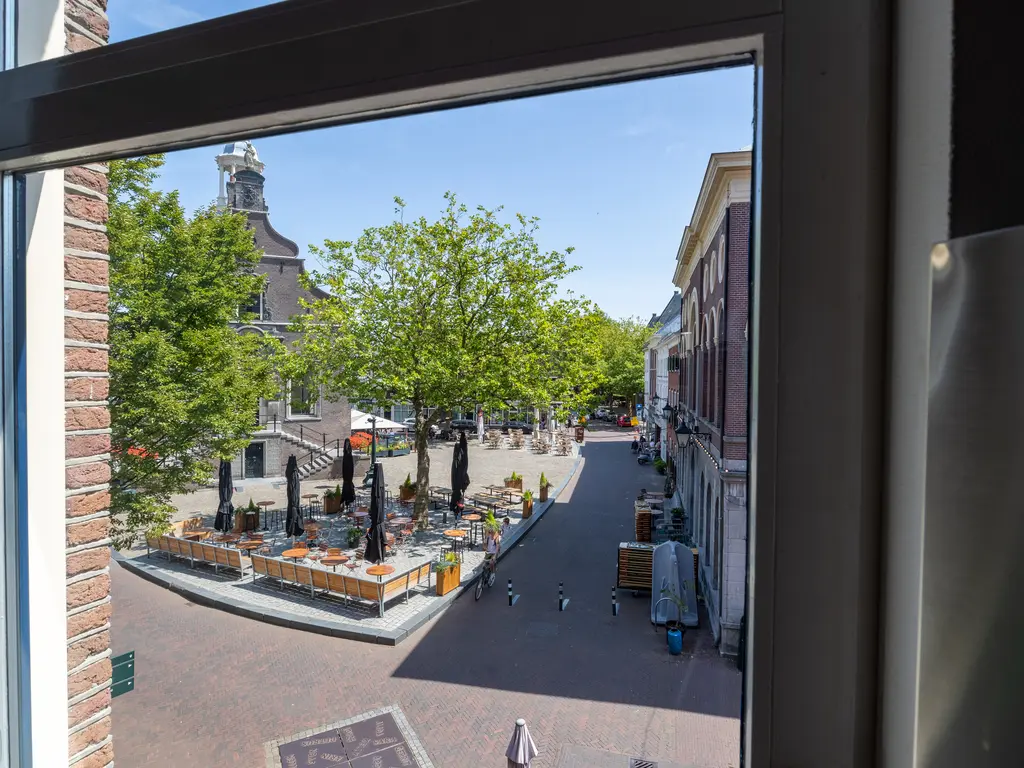 The main entrance on the Schie side gives access to the hallway, storage room, staircase, and lift. The apartment is located on the second floor. Upon entering, you will find a bedroom at the front with its own door to the bathroom, which can also be accessed via the hallway. Two additional bedrooms are located at the front. The apartment further includes a separate laundry room and a guest toilet. The spacious living room at the rear offers a beautiful view of the Grote Markt and features charming wooden beams. At the back, you’ll also find the large open kitchen.