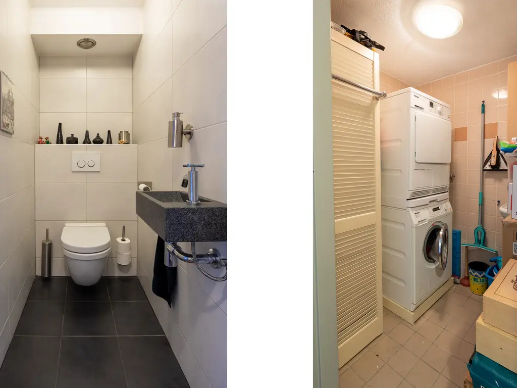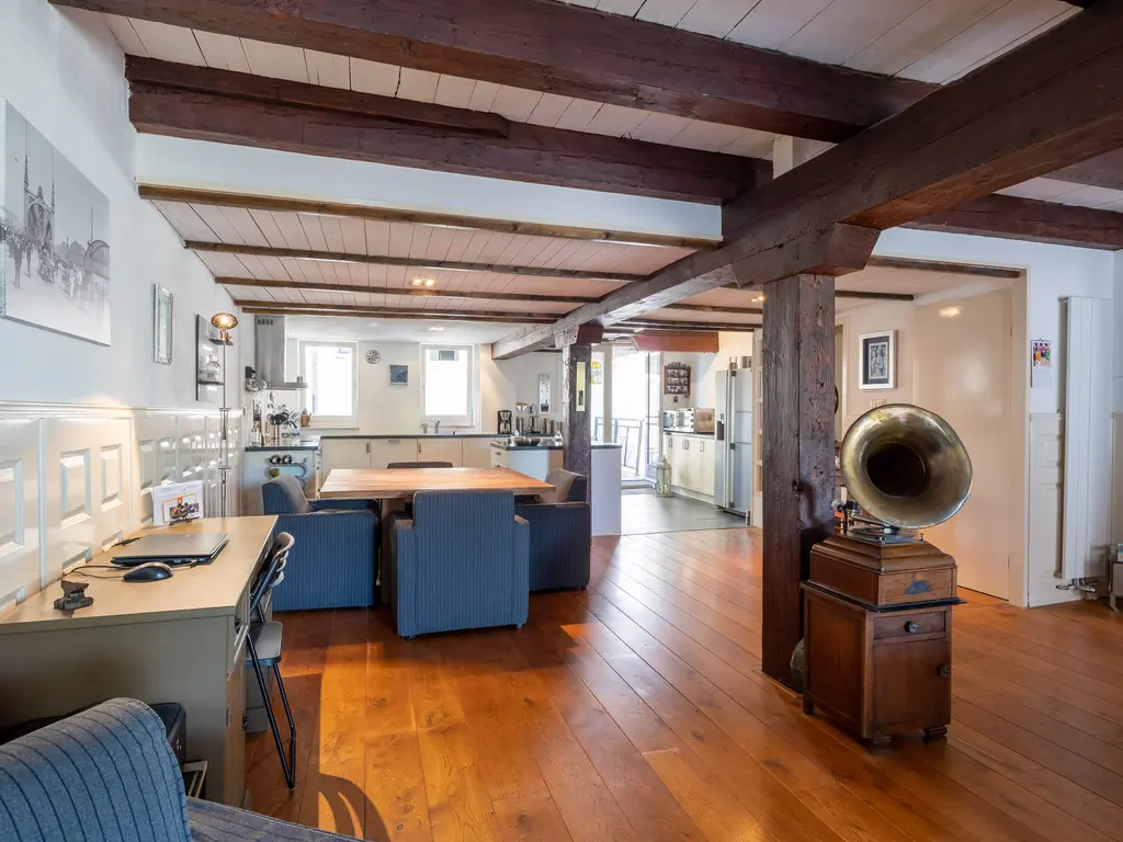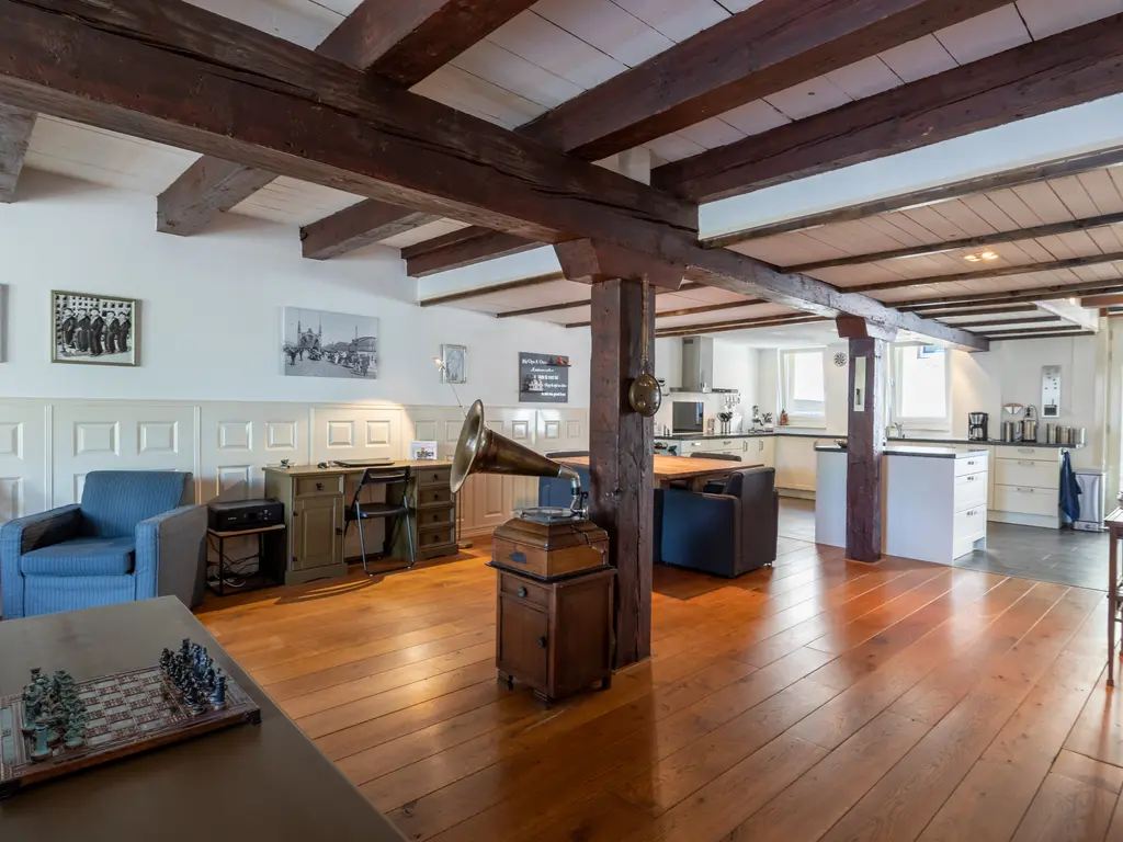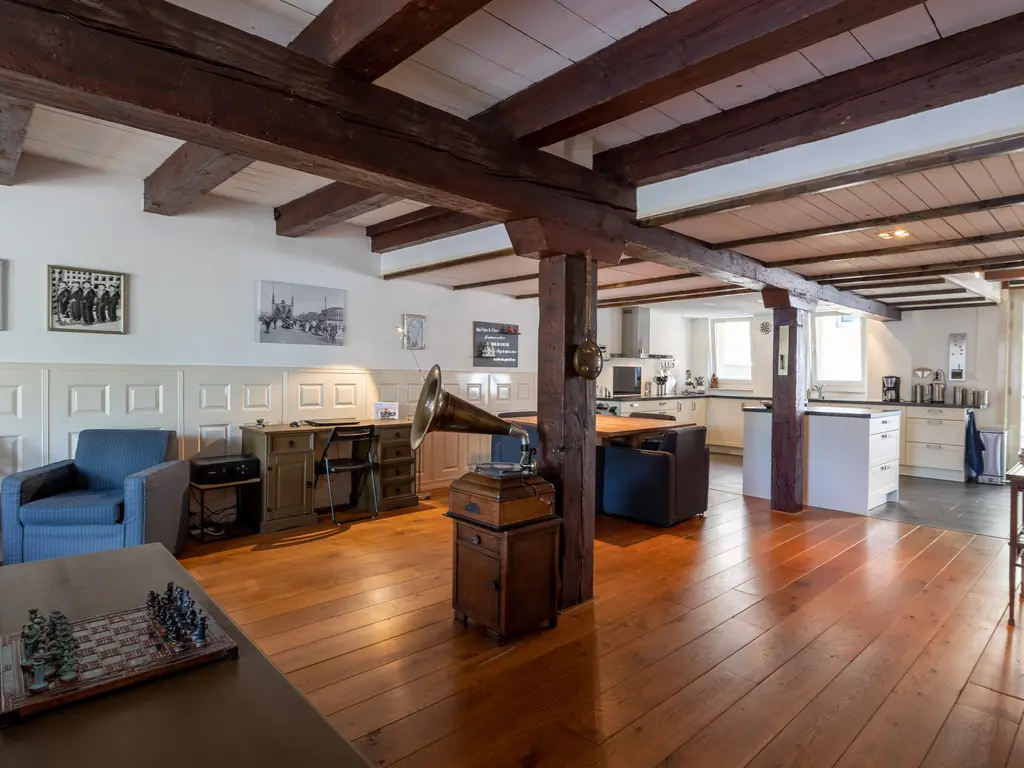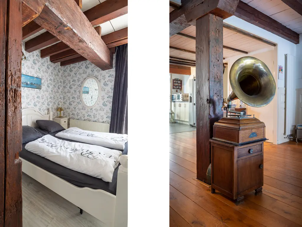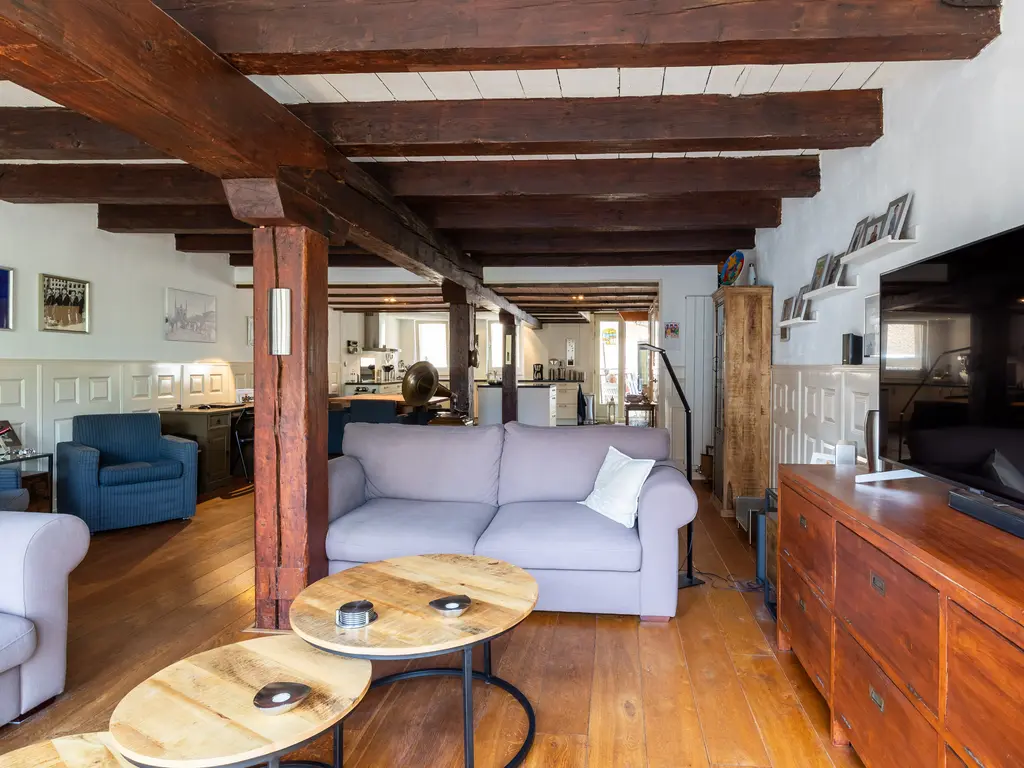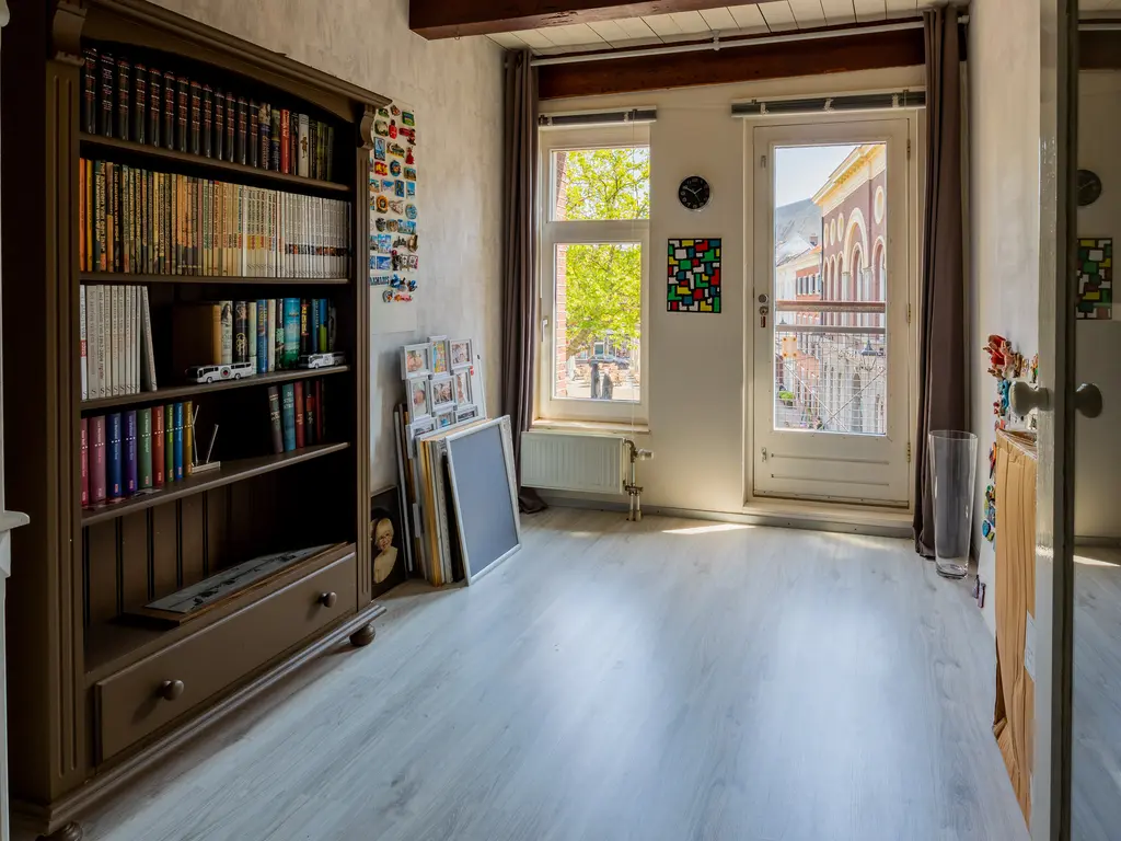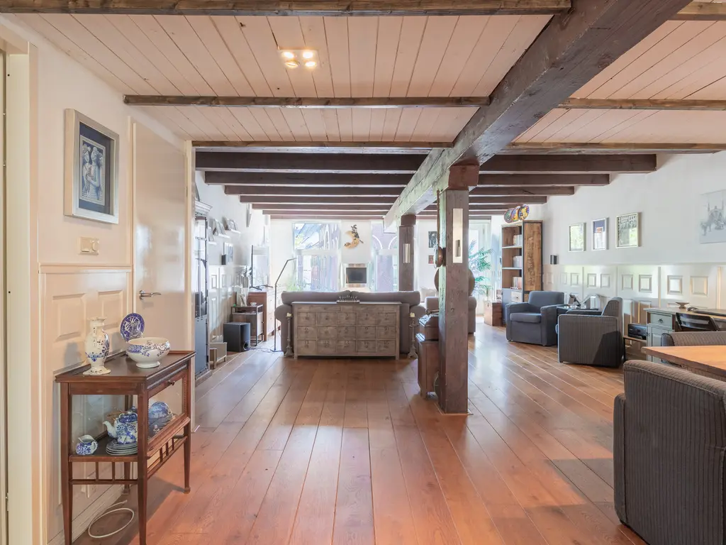 The main entrance on the Schie side gives access to the hallway, storage room, staircase, and lift. The apartment is located on the second floor. Upon entering, you will find a bedroom at the front with its own door to the bathroom, which can also be accessed via the hallway. Two additional bedrooms are located at the front. The apartment further includes a separate laundry room and a guest toilet. The spacious living room at the rear offers a beautiful view of the Grote Markt and features charming wooden beams. At the back, you’ll also find the large open kitchen.
