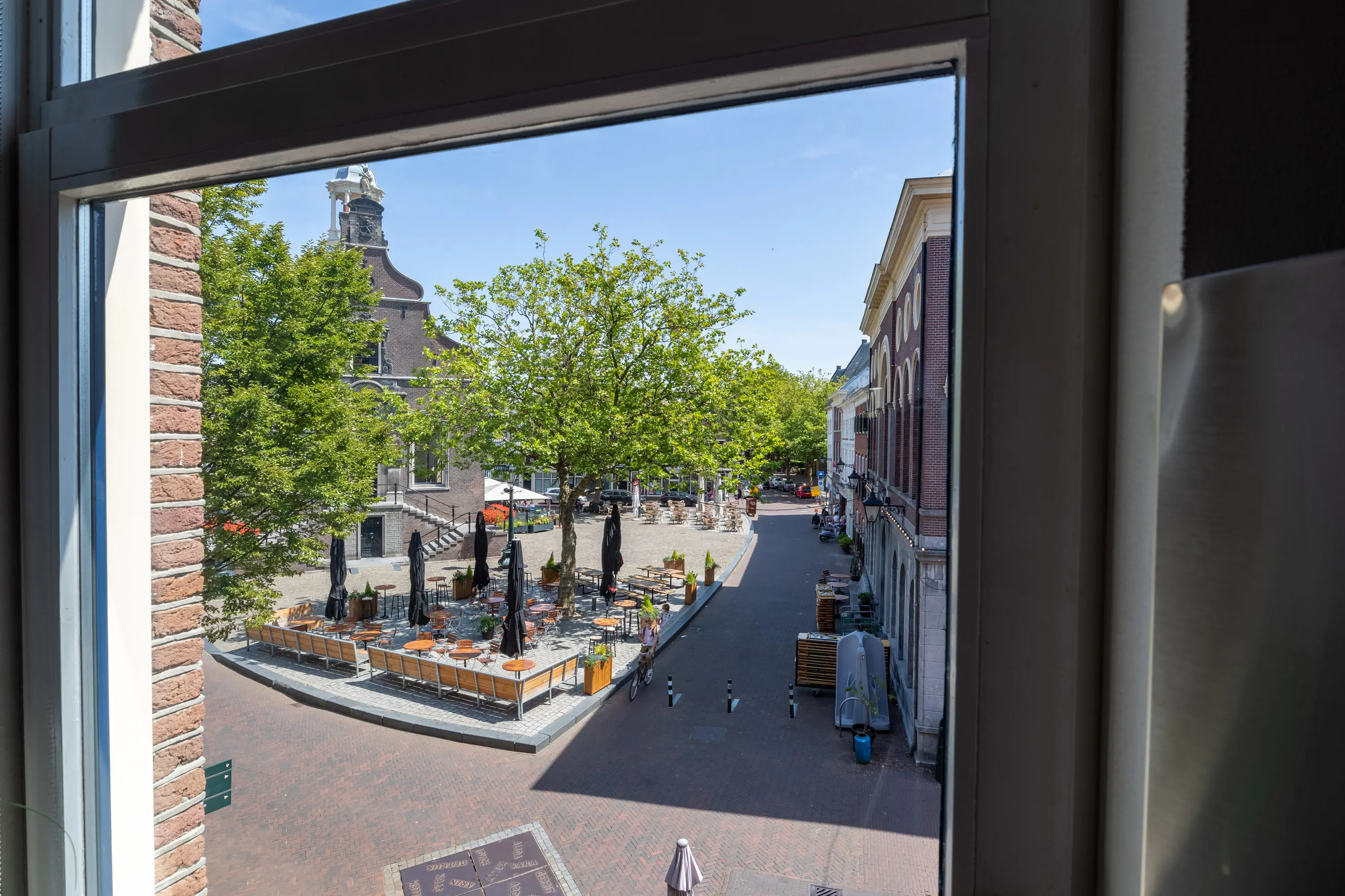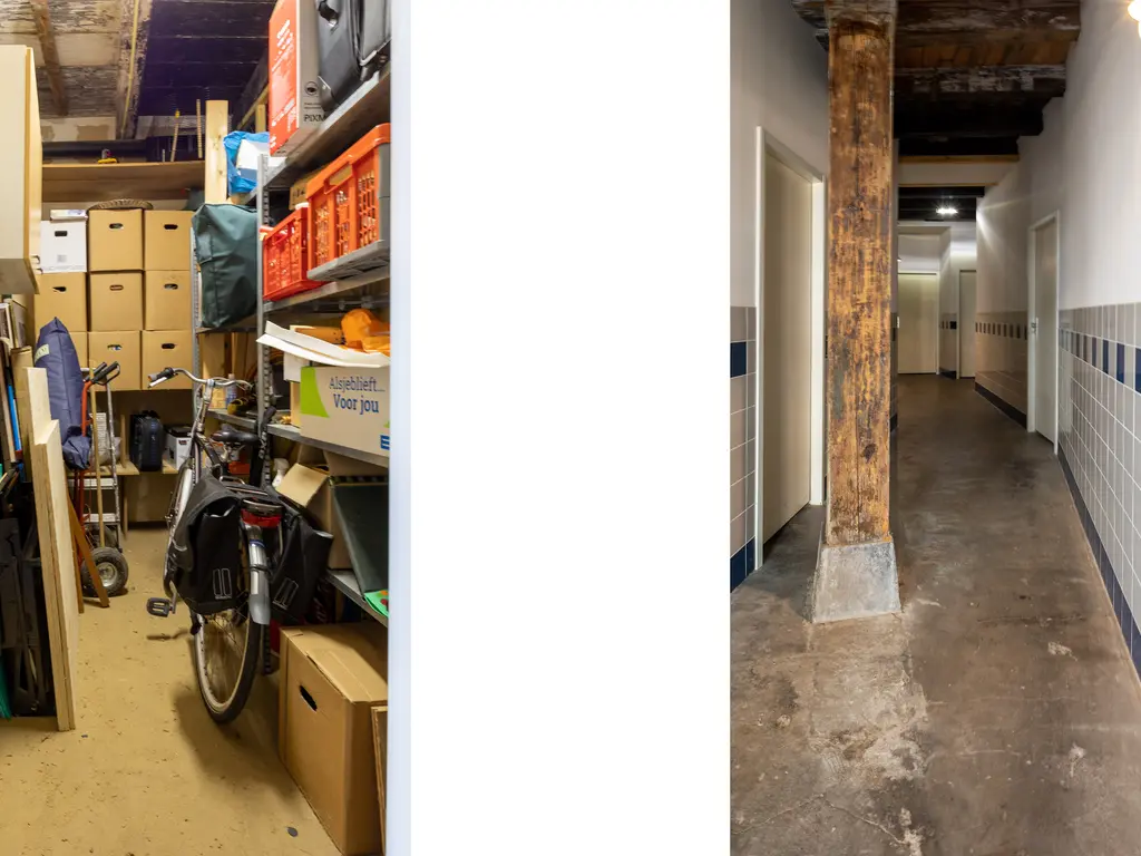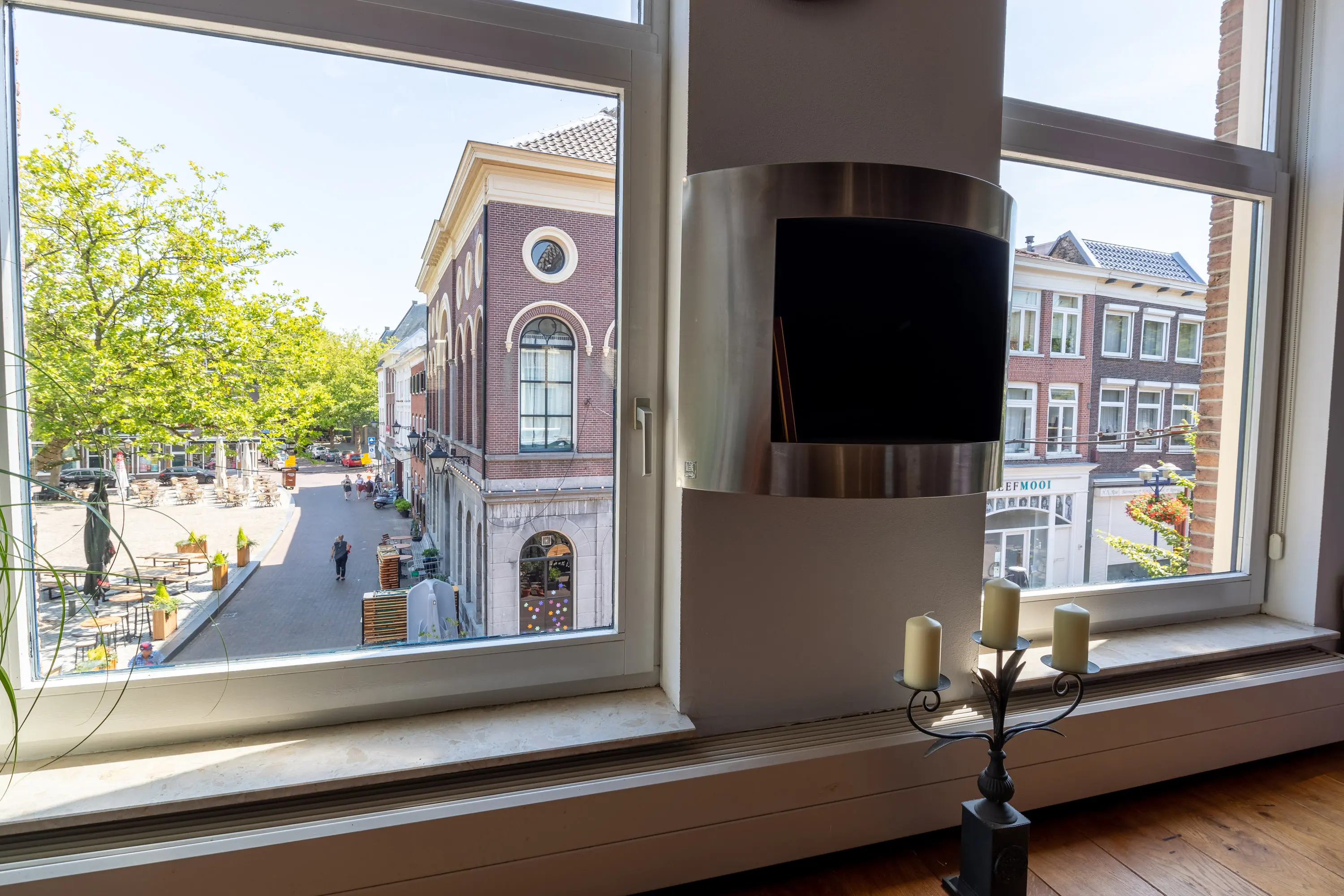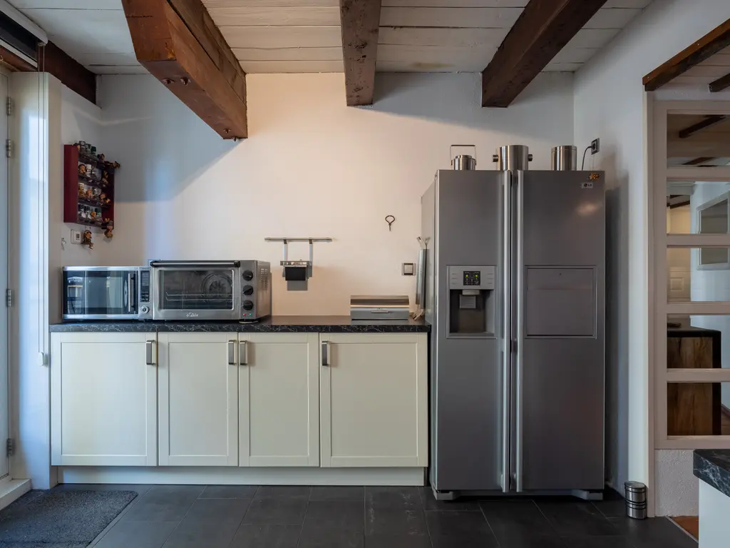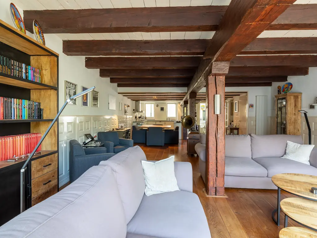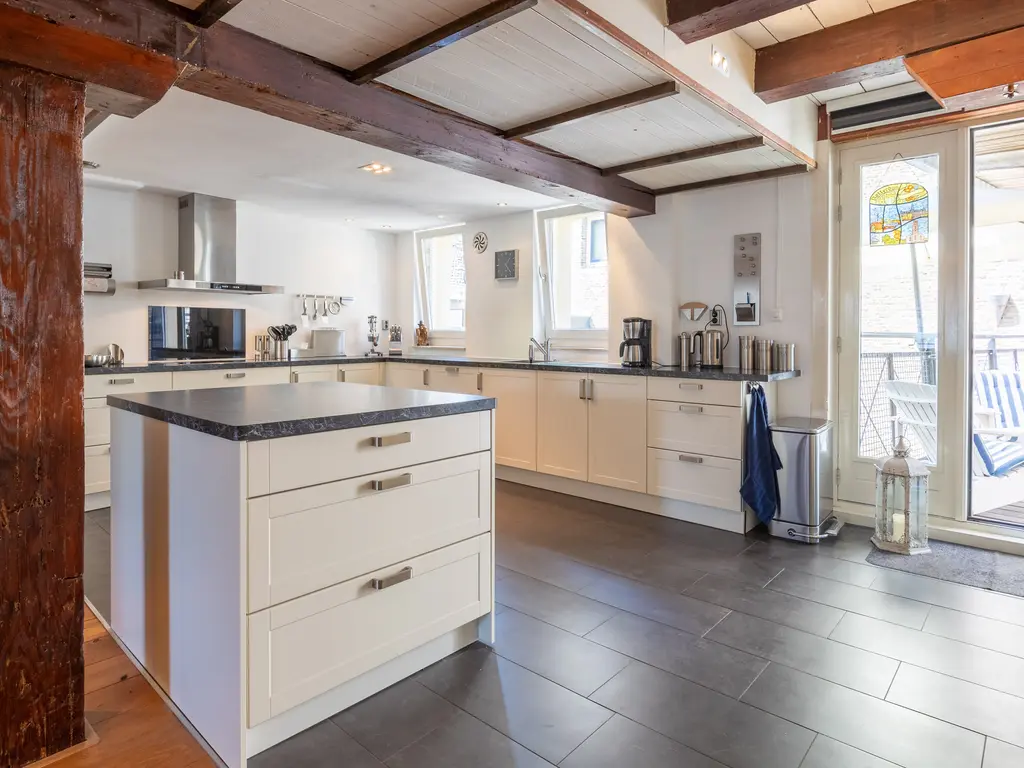 The main entrance on the Schie side gives access to the hallway, storage room, staircase, and lift. The apartment is located on the second floor. Upon entering, you will find a bedroom at the front with its own door to the bathroom, which can also be accessed via the hallway. Two additional bedrooms are located at the front. The apartment further includes a separate laundry room and a guest toilet. The spacious living room at the rear offers a beautiful view of the Grote Markt and features charming wooden beams. At the back, you’ll also find the large open kitchen.