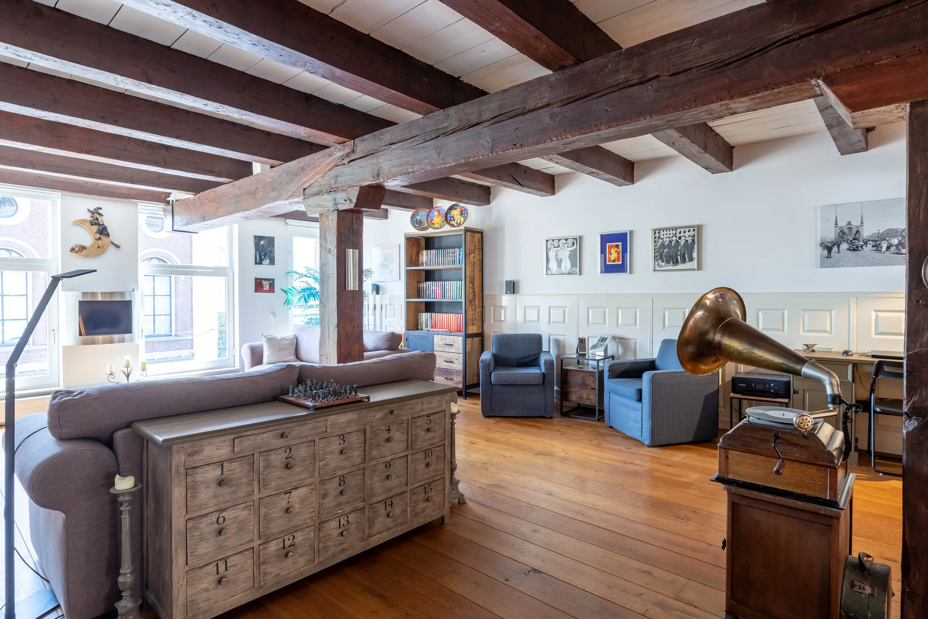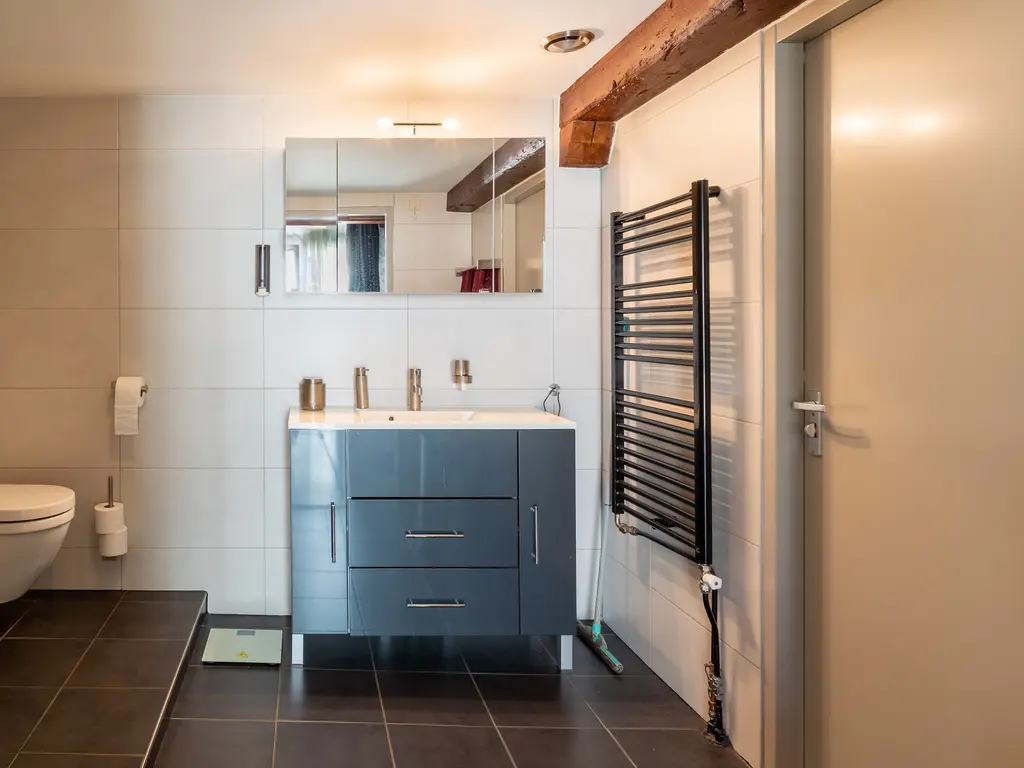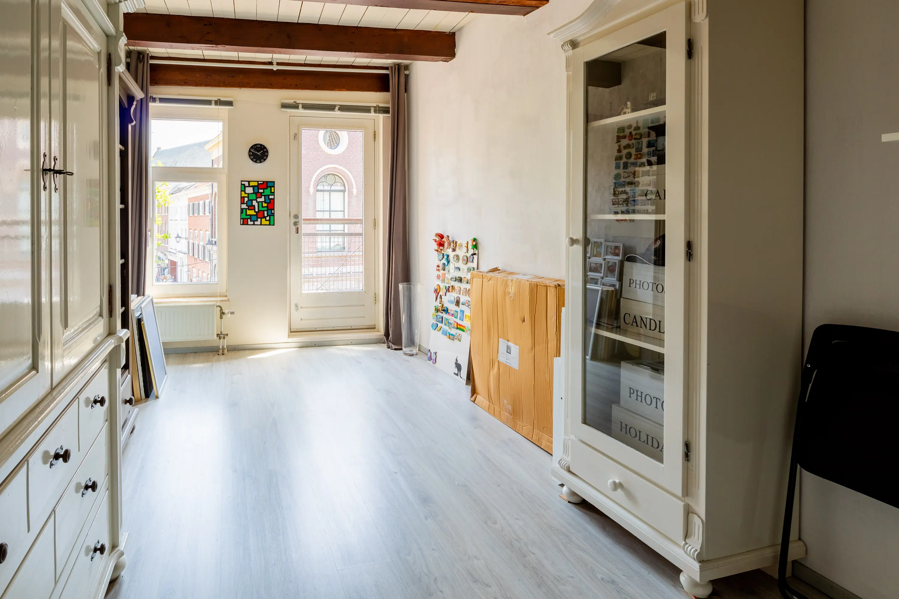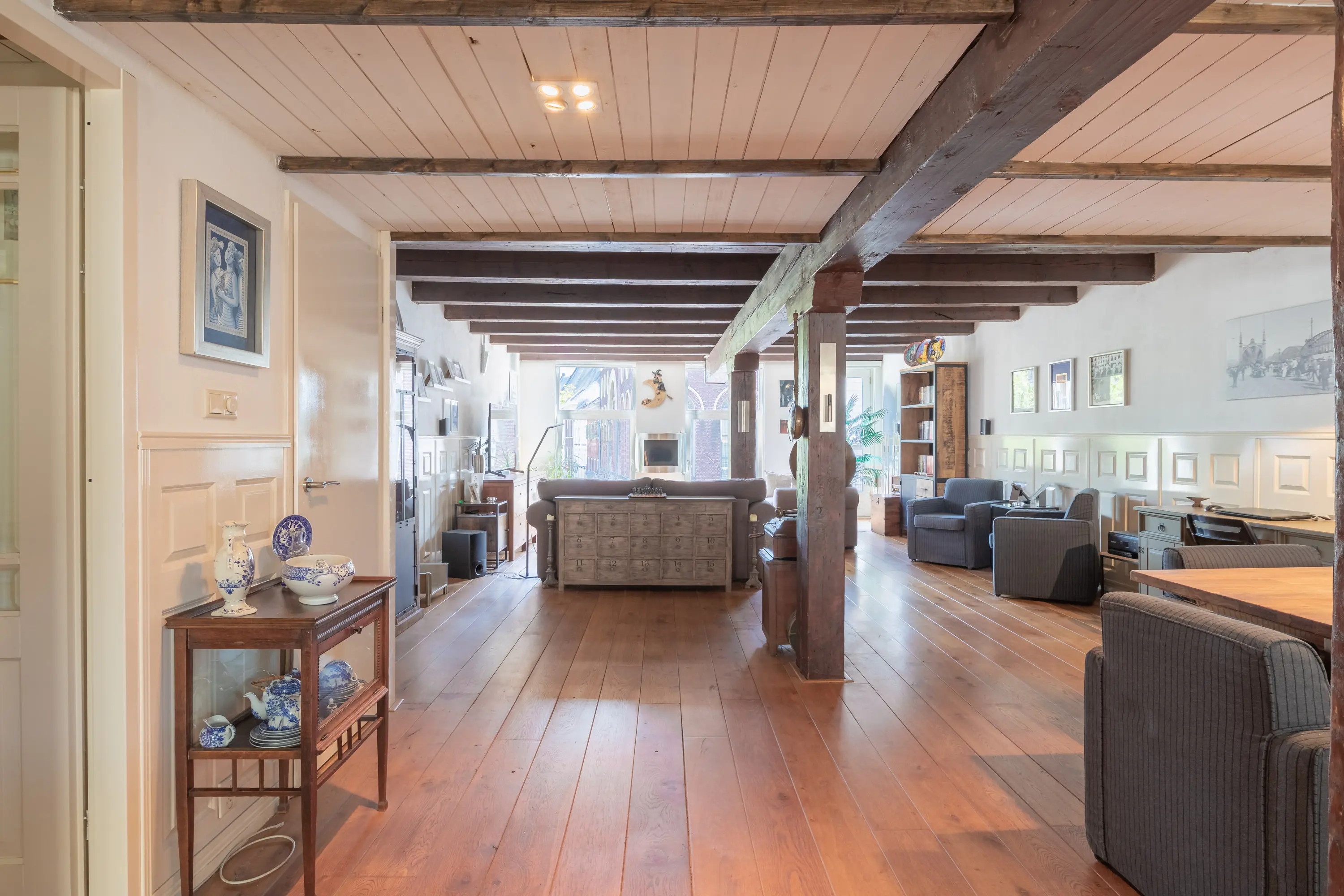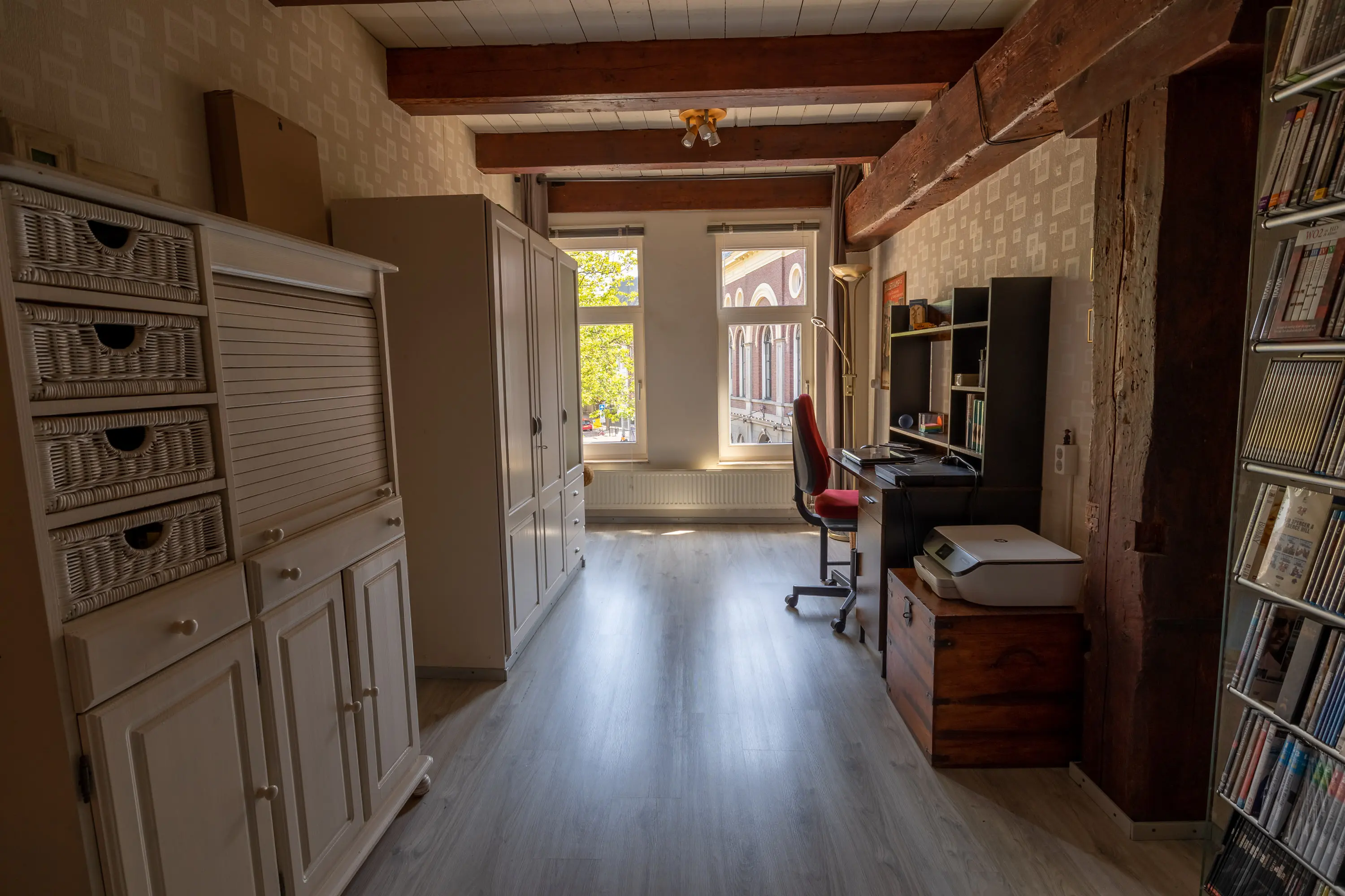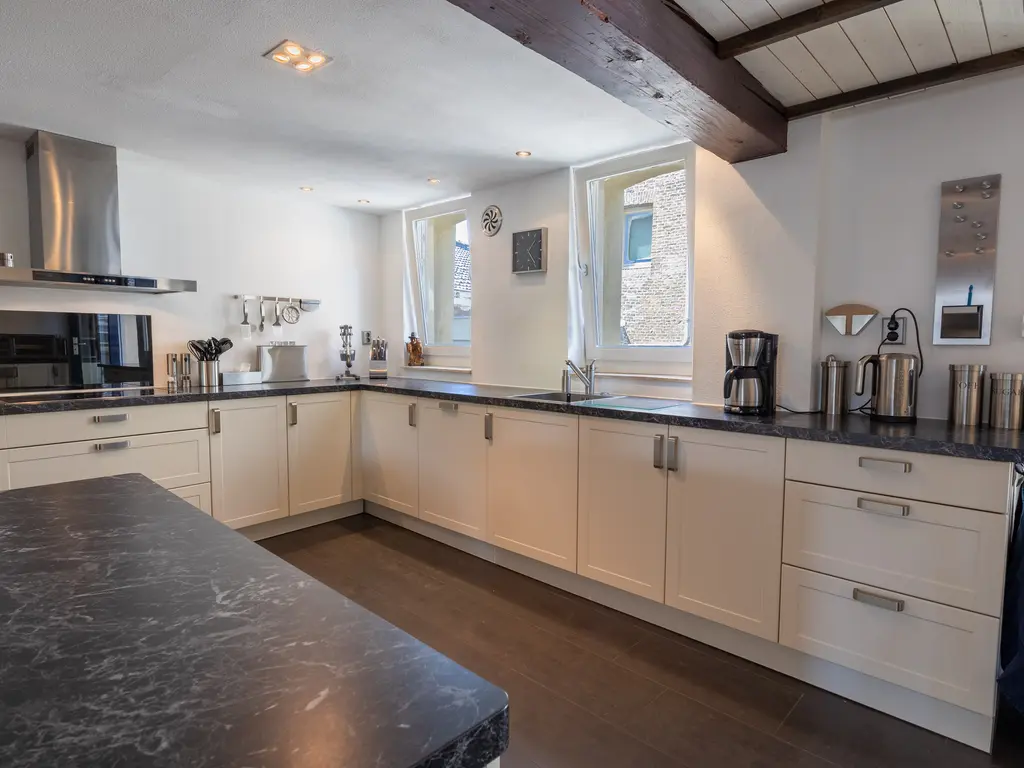 The main entrance on the Schie side gives access to the hallway, storage room, staircase, and lift. The apartment is located on the second floor. Upon entering, you will find a bedroom at the front with its own door to the bathroom, which can also be accessed via the hallway. Two additional bedrooms are located at the front. The apartment further includes a separate laundry room and a guest toilet. The spacious living room at the rear offers a beautiful view of the Grote Markt and features charming wooden beams. At the back, you’ll also find the large open kitchen.