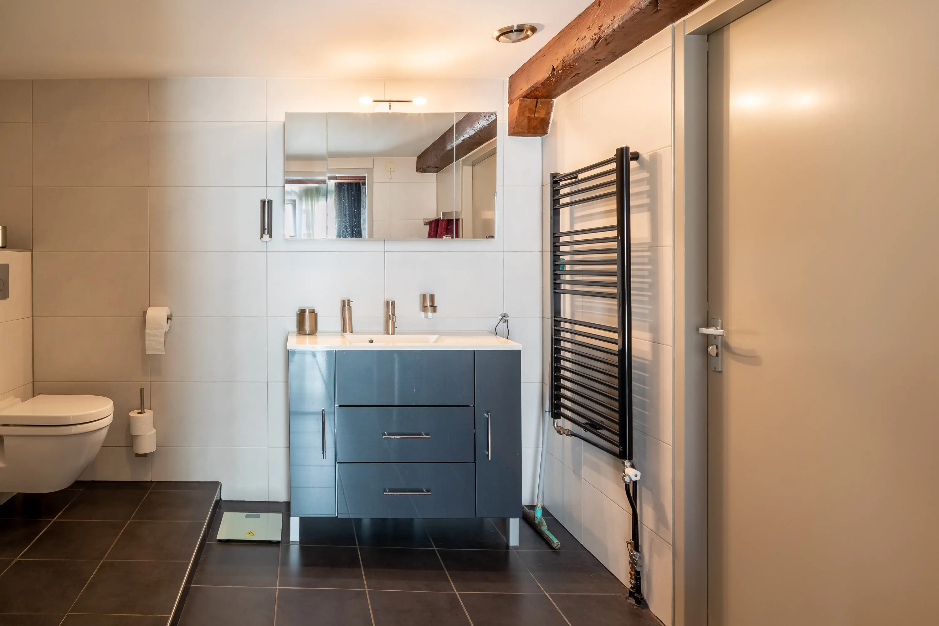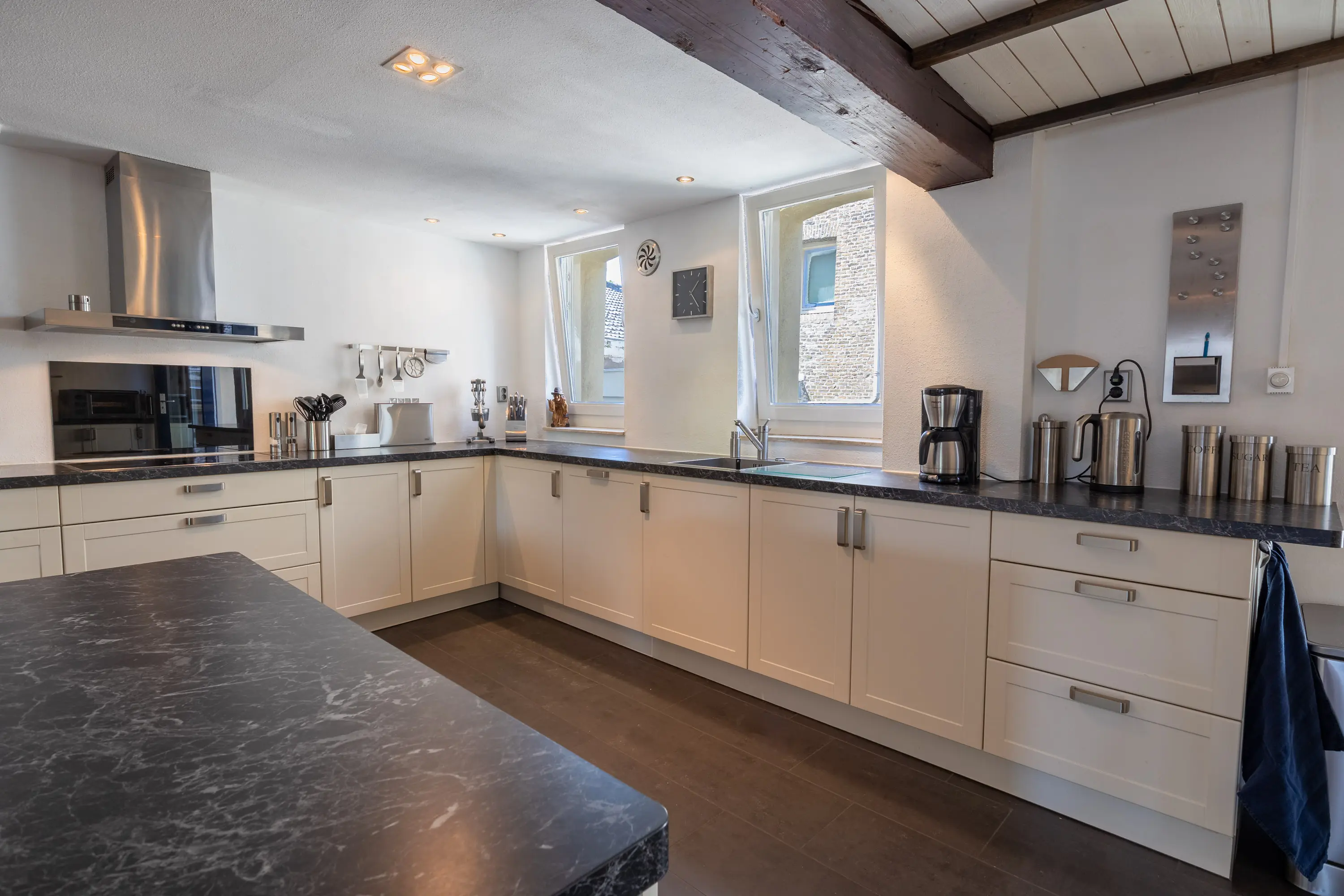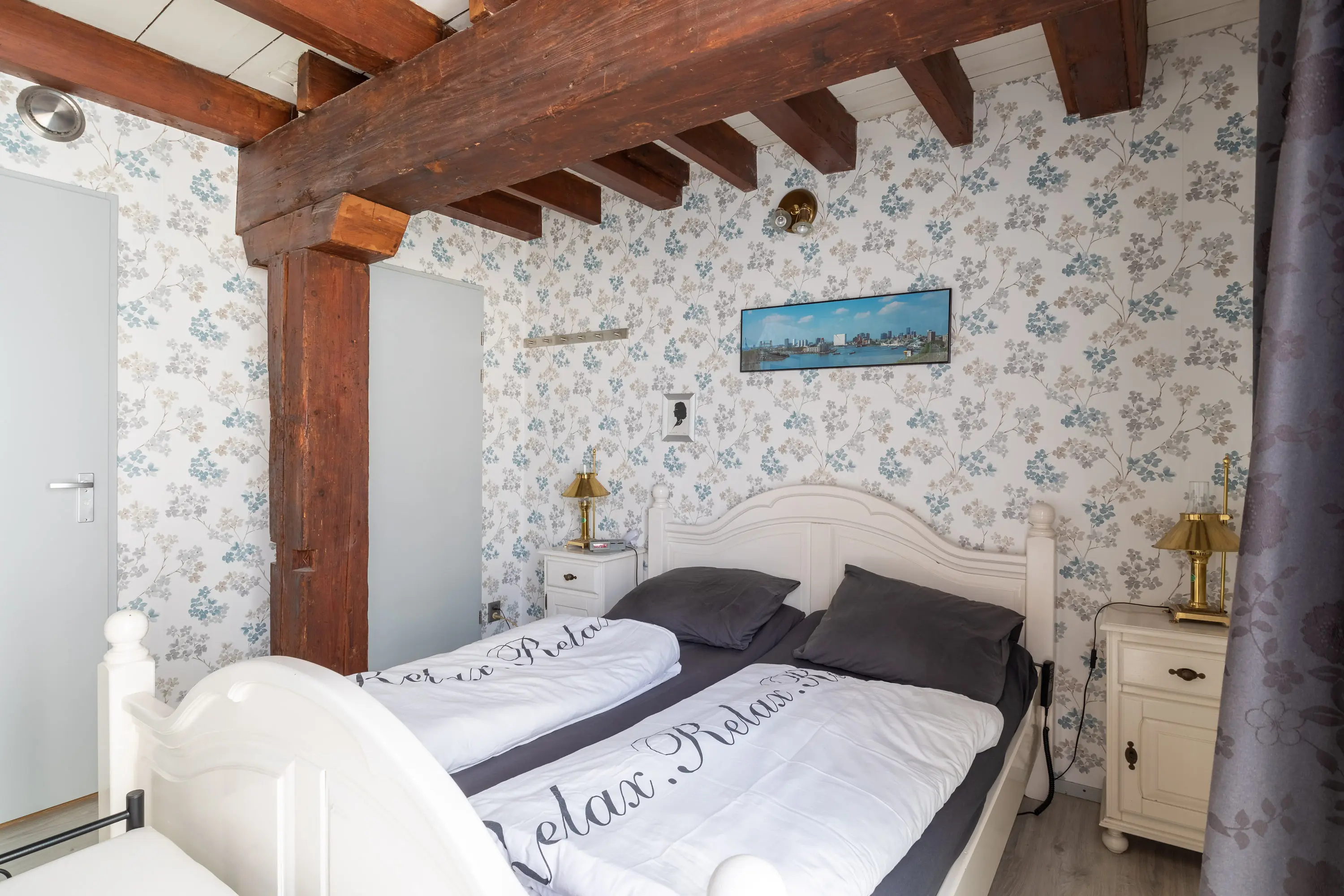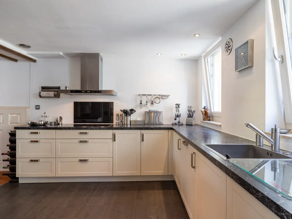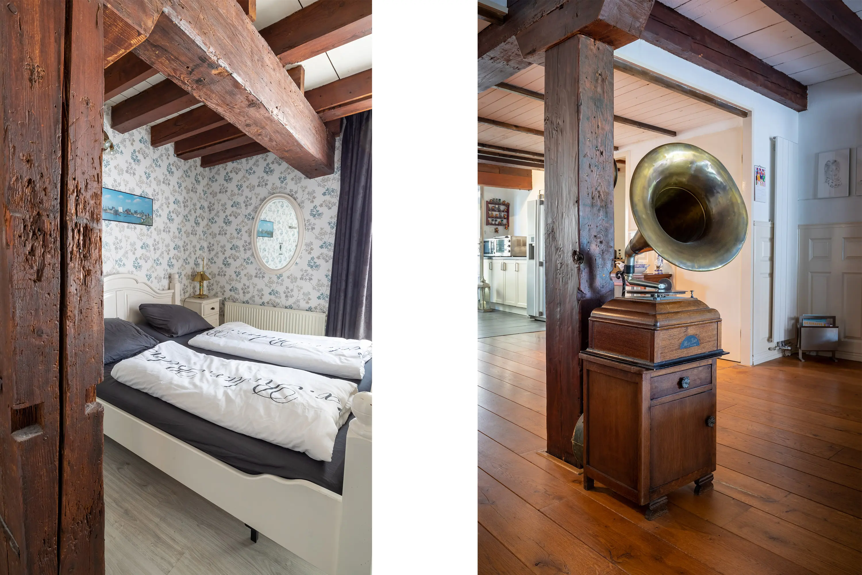 The main entrance on the Schie side gives access to the hallway, storage room, staircase, and lift. The apartment is located on the second floor. Upon entering, you will find a bedroom at the front with its own door to the bathroom, which can also be accessed via the hallway. Two additional bedrooms are located at the front. The apartment further includes a separate laundry room and a guest toilet. The spacious living room at the rear offers a beautiful view of the Grote Markt and features charming wooden beams. At the back, you’ll also find the large open kitchen.