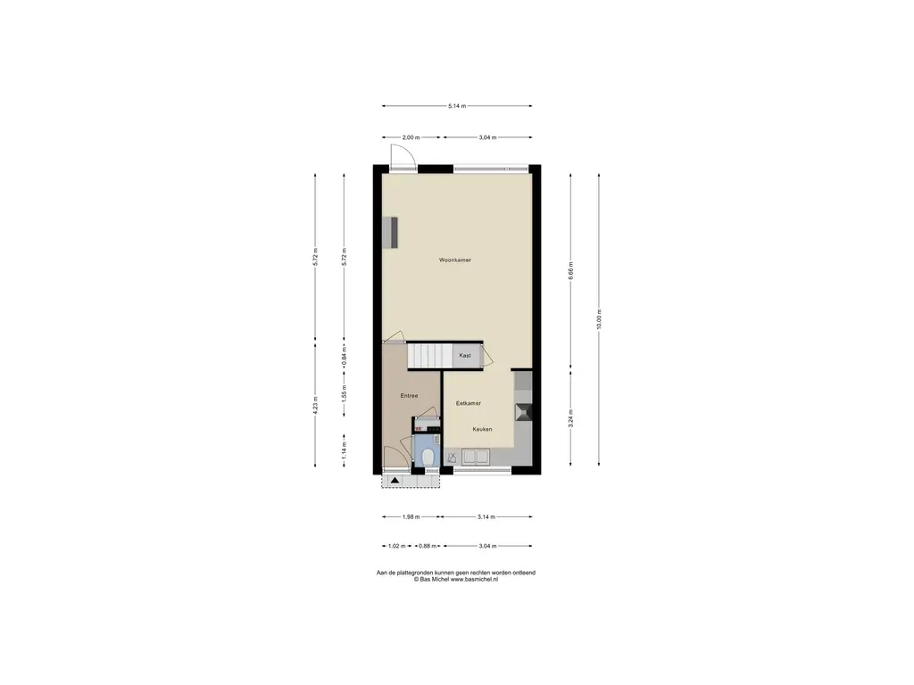 Aan de voorzijde bevindt zich de open keuken in hoekopstelling, uitgevoerd in wit met een donker aanrechtblad. De keuken is compleet uitgerust met een 4-pits gaskookplaat, RVS afzuigkap, koel-vriescombinatie, vaatwasser, oven, dubbele spoelbak en een tv-aansluiting. Vanuit de keuken heeft u toegang tot de praktische trapkast.