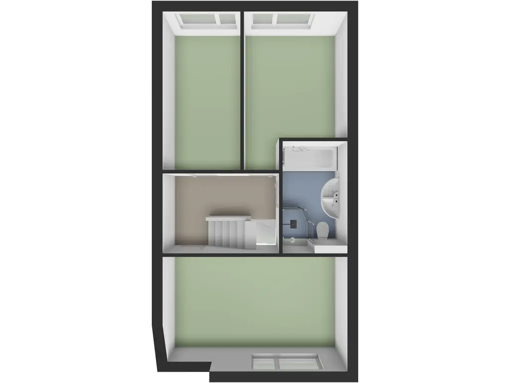 De overloop biedt toegang tot drie slaapkamers en de badkamer, evenals de open trap naar de tweede verdieping.