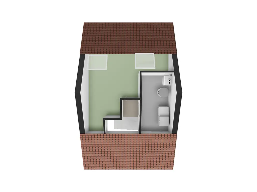 De slaapkamer is ruim en licht dankzij twee grote Velux dakramen en beschikt over een bergvliering en extra bergruimte achter de knieschotten.
