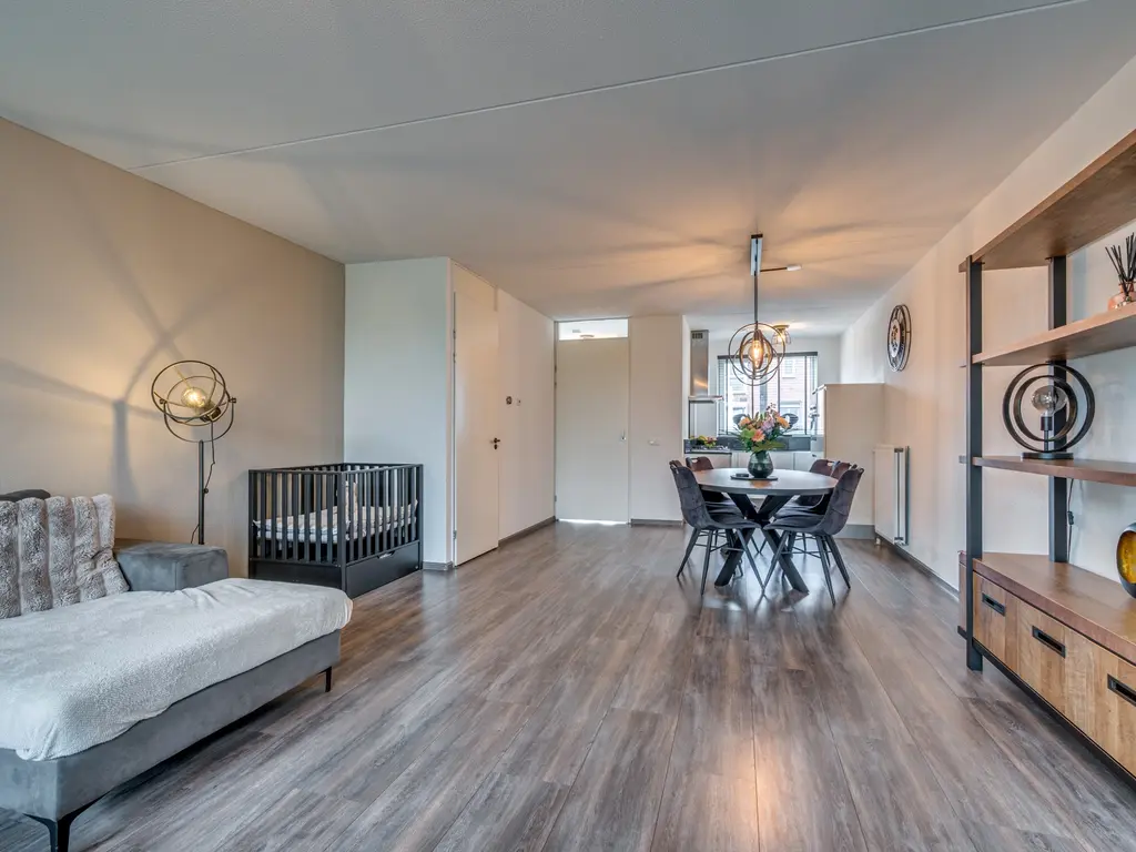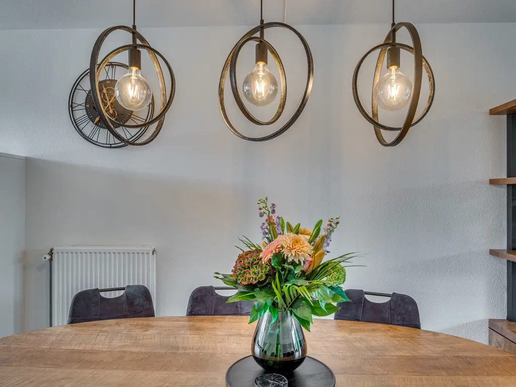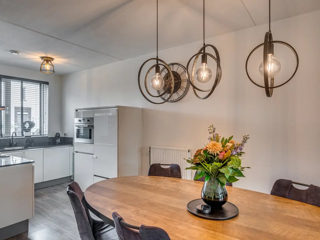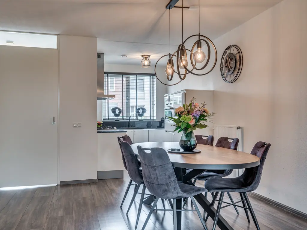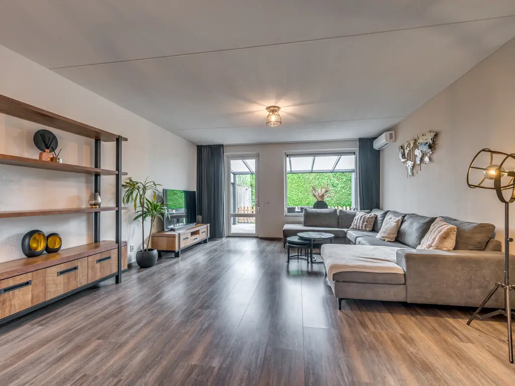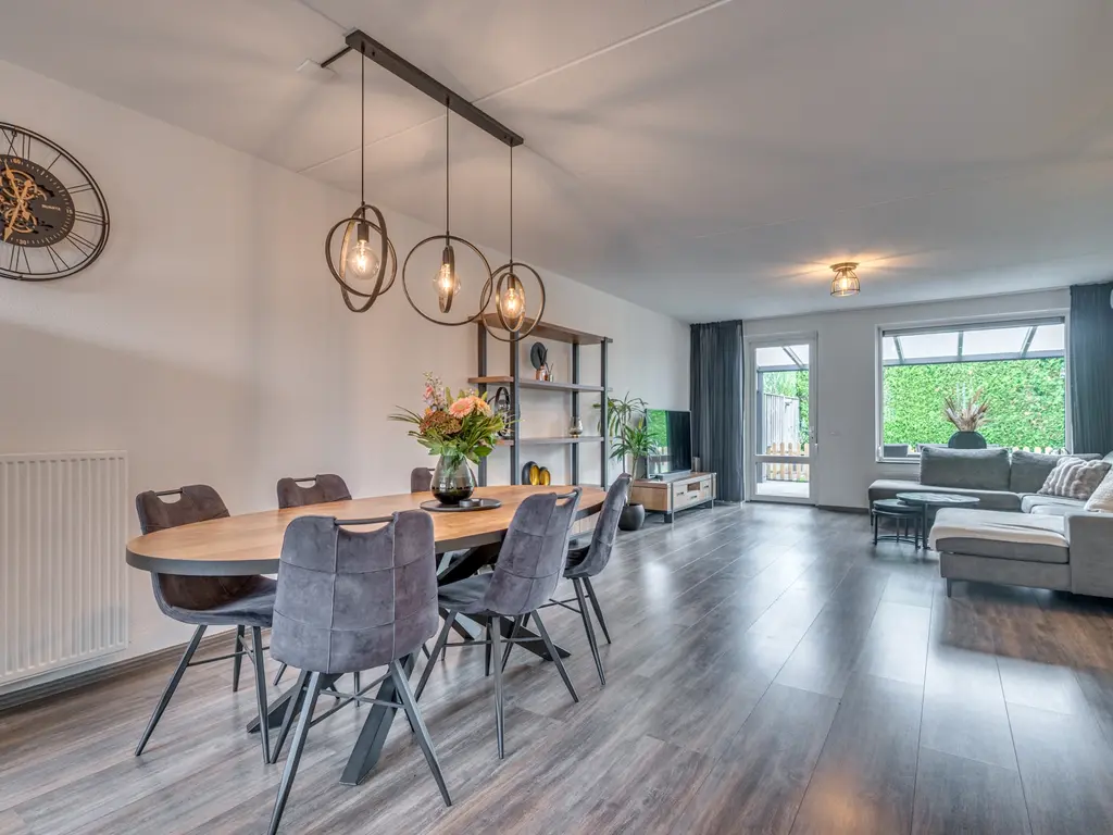 Dankzij de raampartijen aan de voor- en achterzijde en de tuindeur geniet je hier van veel natuurlijk licht en direct contact met de tuin. De strakke laminaatvloer en neutrale afwerking zorgen voor een warme, eigentijdse sfeer.