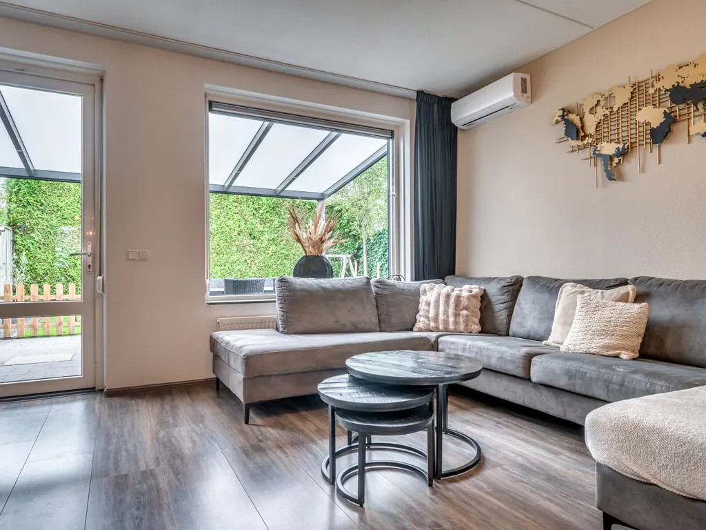 Voor extra comfort is de woonkamer voorzien van een airconditioning – ideaal op warme zomerdagen of frisse ochtenden. Onder de trap bevindt zich een handige trapkast voor extra opslagruimte.