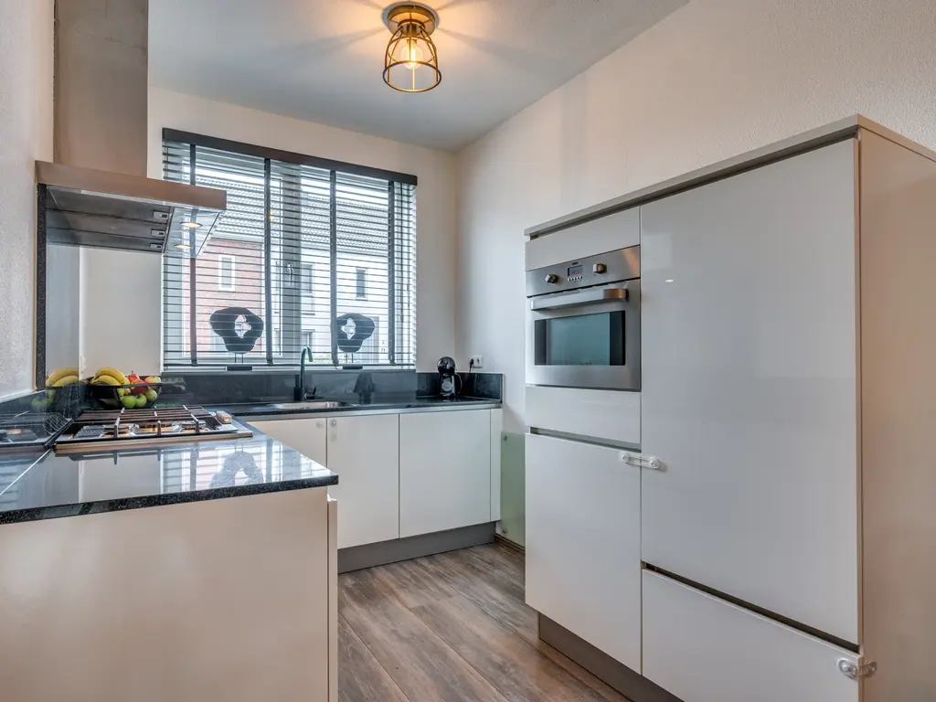 Aan de voorzijde ligt de moderne open keuken, uitgerust met witte fronten, een stijlvol antraciet granieten