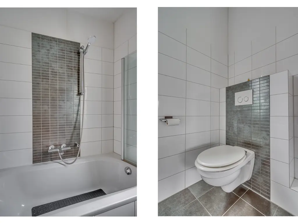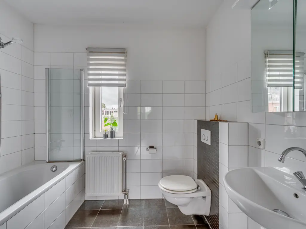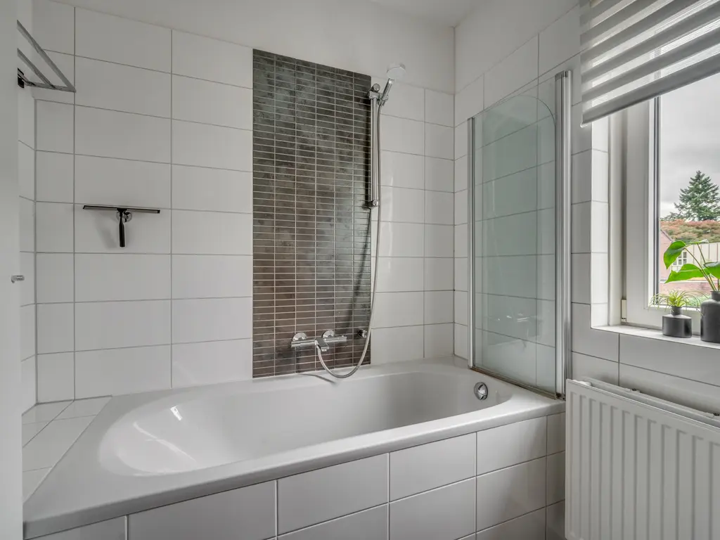 De verzorgde badkamer, met veel natuurlijk licht en grotendeels betegelde wanden, beschikt over een comfortabele ligbad/douchecombinatie, een wastafel en een tweede toilet.