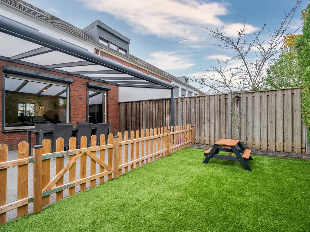 De tuin is onderhoudsvriendelijk aangelegd met een terras en een verzorgd gazon van kunstgras.