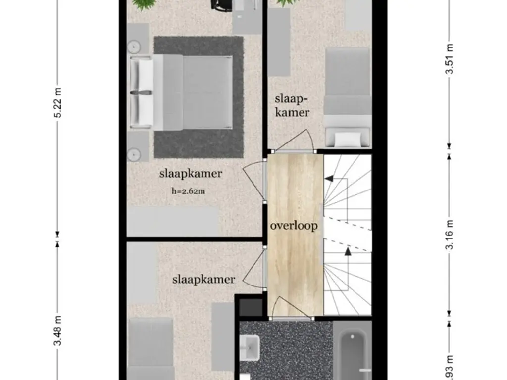 De overloop biedt toegang tot drie sfeervolle slaapkamers. De masterbedroom, met een royale oppervlakte van 14 m², ligt aan de rustige achterzijde van de woning en is bovendien uitgerust met een airconditioning voor extra comfort. Alle kamers zijn voorzien van onderhoudsvriendelijke kunststof kozijnen met HR++ glas en rolluiken, wat zorgt voor optimale isolatie en privacy.