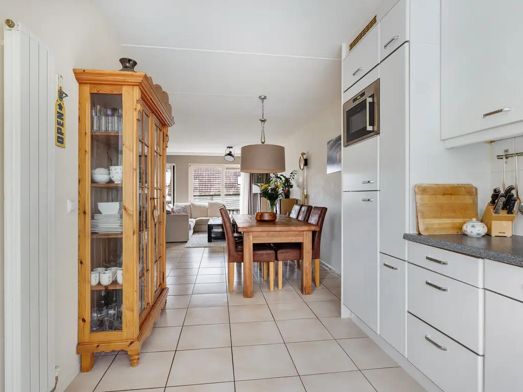 Aan de voorzijde ligt de open keuken in hoekopstelling, uitgerust met diverse inbouwapparatuur zoals een vaatwasser, afzuigkap, gaskookplaat, heteluchtoven, koelkast en magnetron. De keuken biedt vrij uitzicht aan de voorzijde en een praktische indeling.