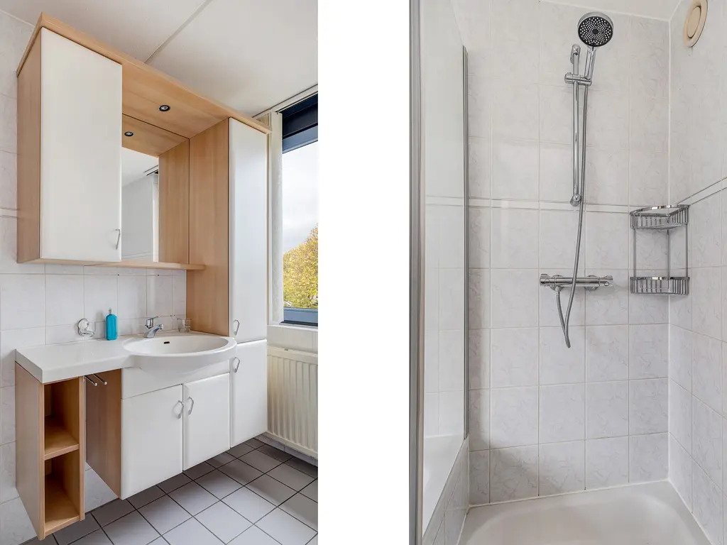 De badkamer is volledig betegeld en voorzien van een ligbad, douchecabine en wastafelmeubel met spiegel. Op de overloop bevindt zich een apart toilet (duoblok met fonteintje), eveneens wit betegeld.