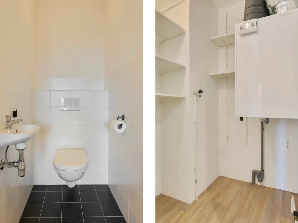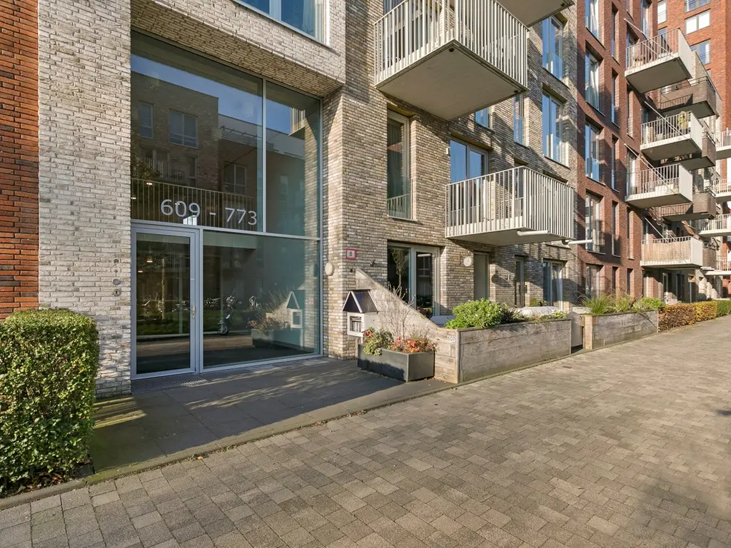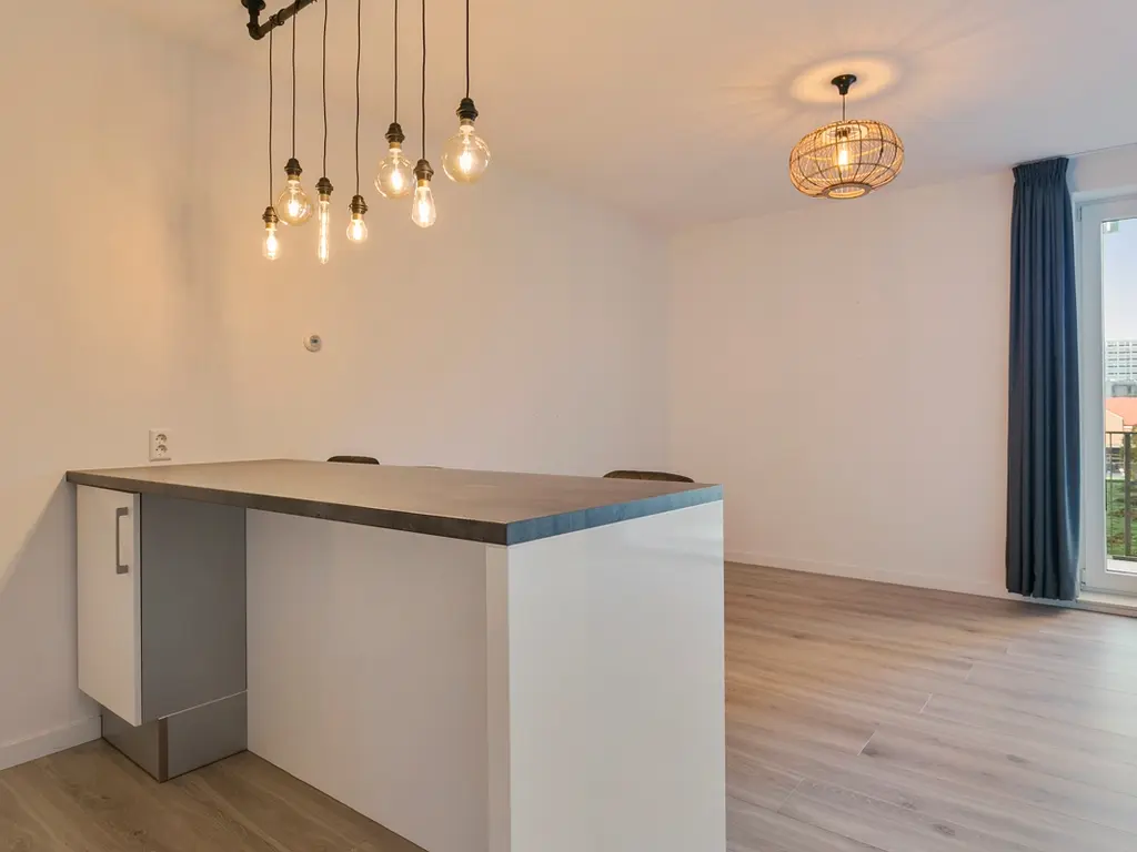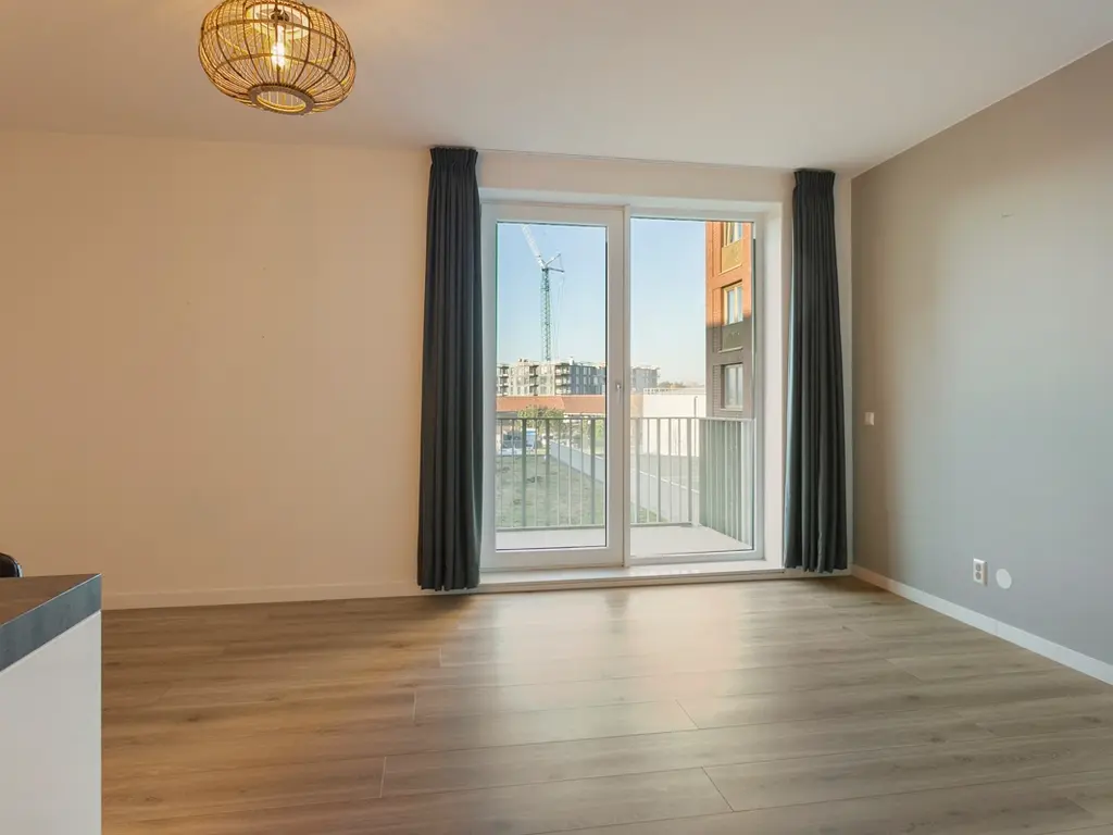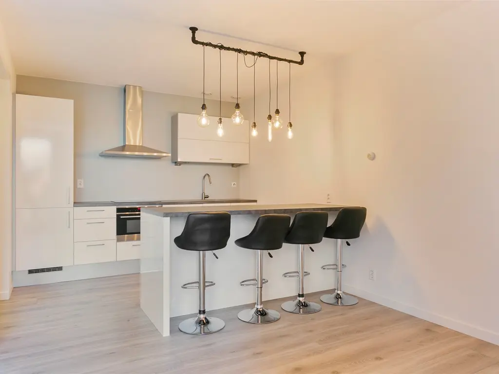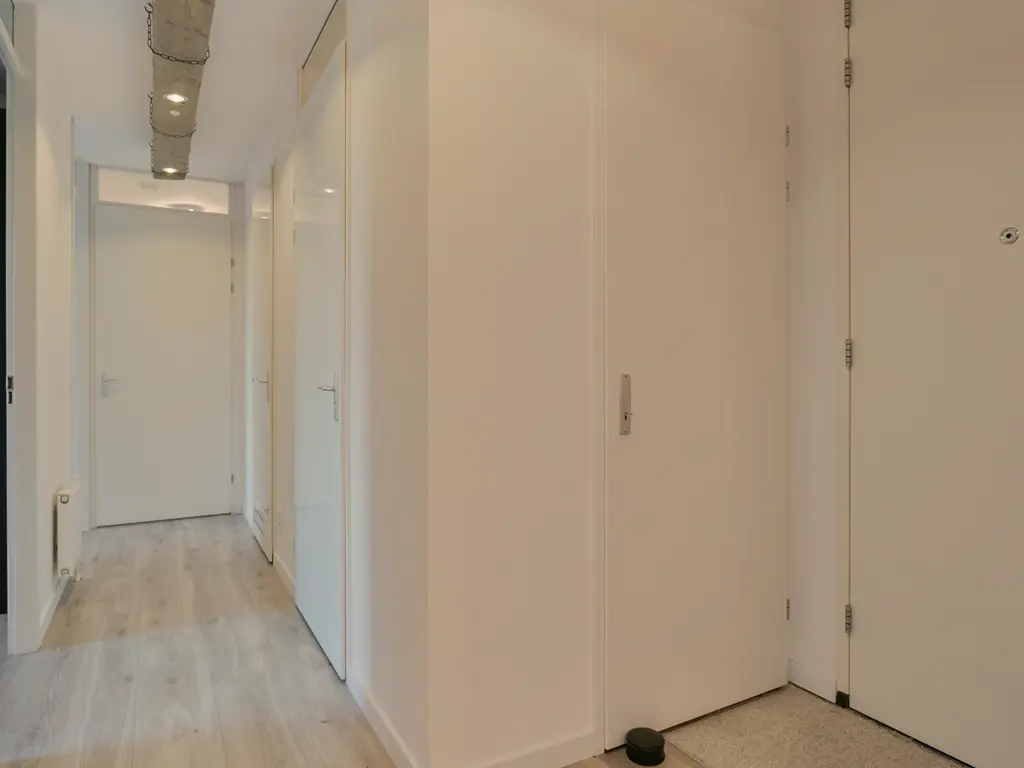 2de verdieping: Entree met hal. Twee lichte slaapkamers. Luxe badkamer met inloopdouche, glazen douchewand, designradiator, wastafel in meubel en spiegel met ingebouwde verlichting. Technische ruimte met opstelling warmte terugwininstallatie en wasmachine aansluiting. Apart toilet met fontein. Ruime en lichte woonkamer met toegang tot het zonnige balkon. Moderne open keuken voorzien van bar-opstelling, vaatwasser, keramische kookplaat, afzuigkap, koel/-vriescombinatie en een combi-oven. Het appartement is volledig voorzien van een keurige laminaatvloer.