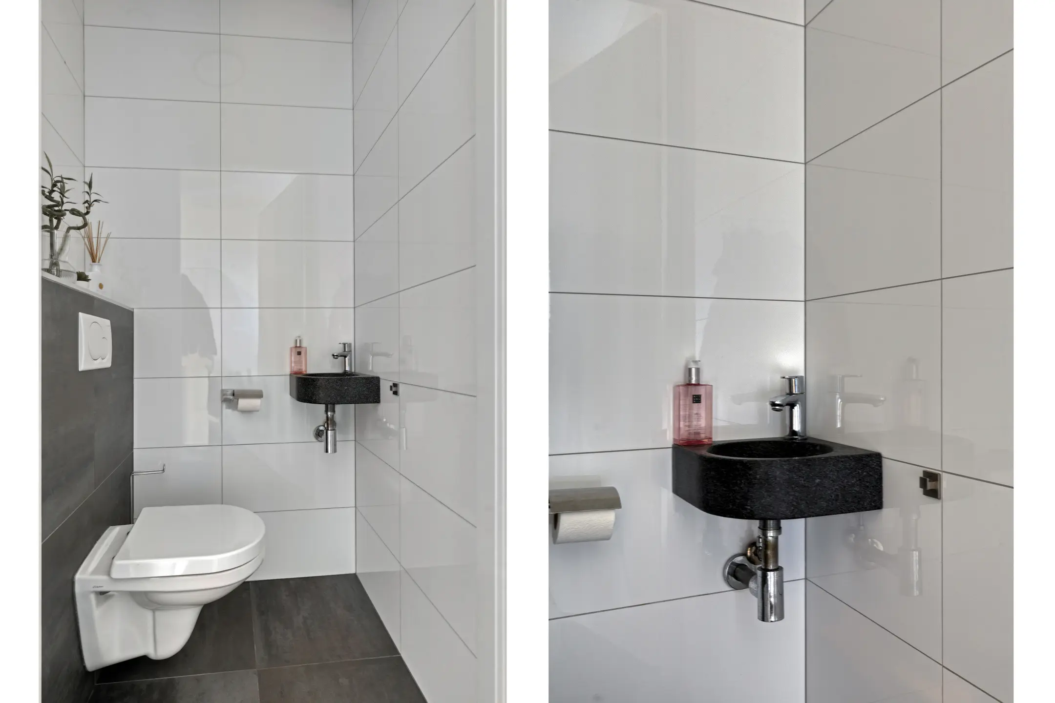 - De modern betegelde badkamer is voorzien van een ligbad, douche, toilet en wastafel.