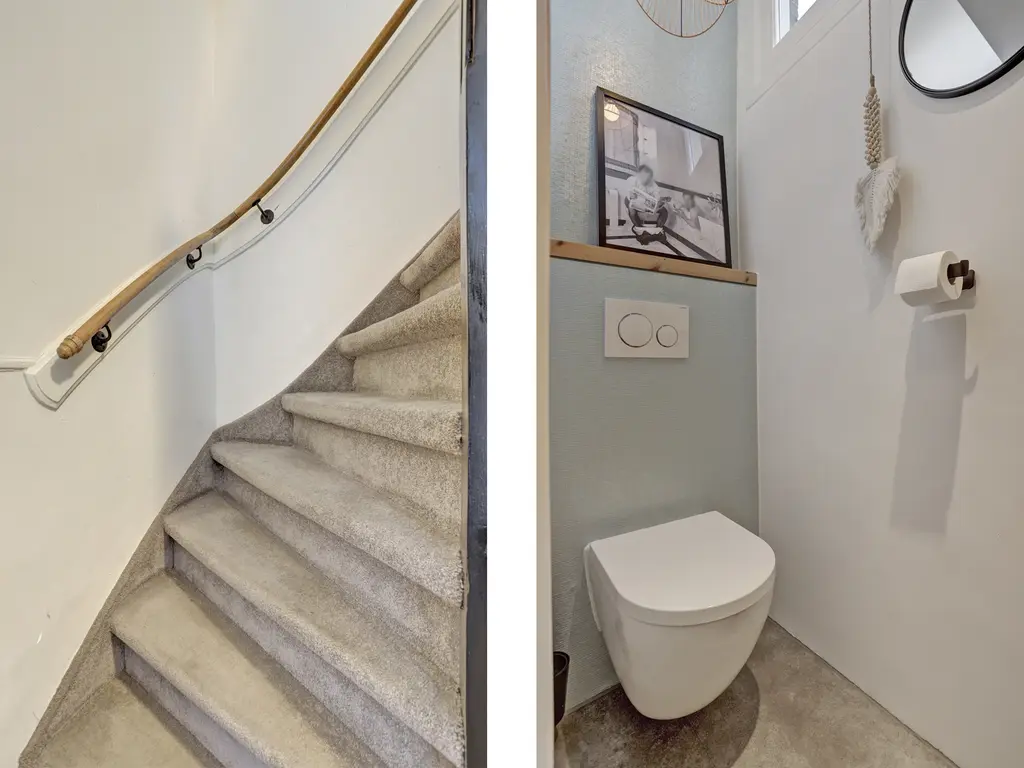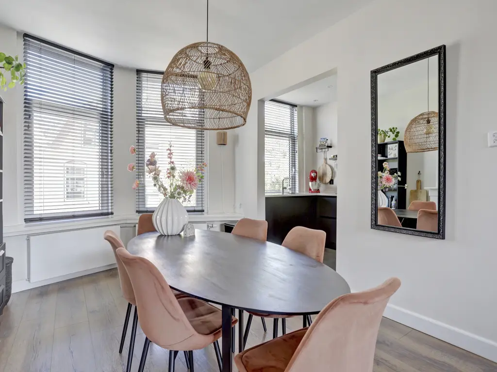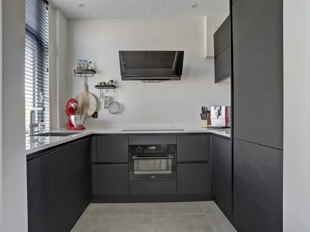 Via de overloop bereikt u de woonkamer, het toilet en de trap naar de tweede verdieping. Er is ruimte voor een garderobe en een praktische nis voor schoenen. De woonkamer is licht en sfeervol dankzij de erker aan de voorzijde en de ramen aan beide kanten. Aan de voorzijde bevindt zich de moderne zwarte U-vormige keuken met marmerlook keramiek aanrechtblad en hoogwaardige inbouwapparatuur zoals een koel-vriescombinatie, vaatwasser, combi-oven en een brede inductiekookplaat met stijlvolle afzuigkap. De Lemans carrousselkast zorgt voor slimme opbergruimte. De keuken heeft een plavuizenvloer, terwijl de rest van de verdieping is afgewerkt met laminaat. Het separate toilet is modern uitgevoerd met hangend closet, lichtgroene behang en glad stucwerk.