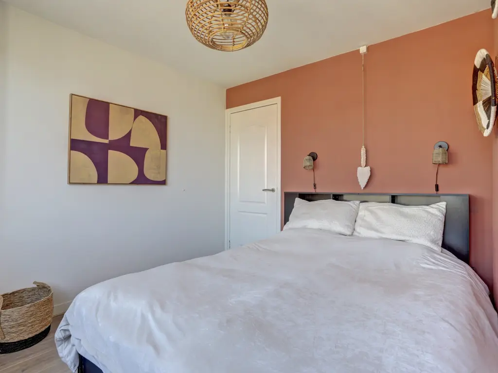 Slaapkamer 1 ligt aan de voorzijde en is strak afgewerkt met glad stucwerk en laminaat.