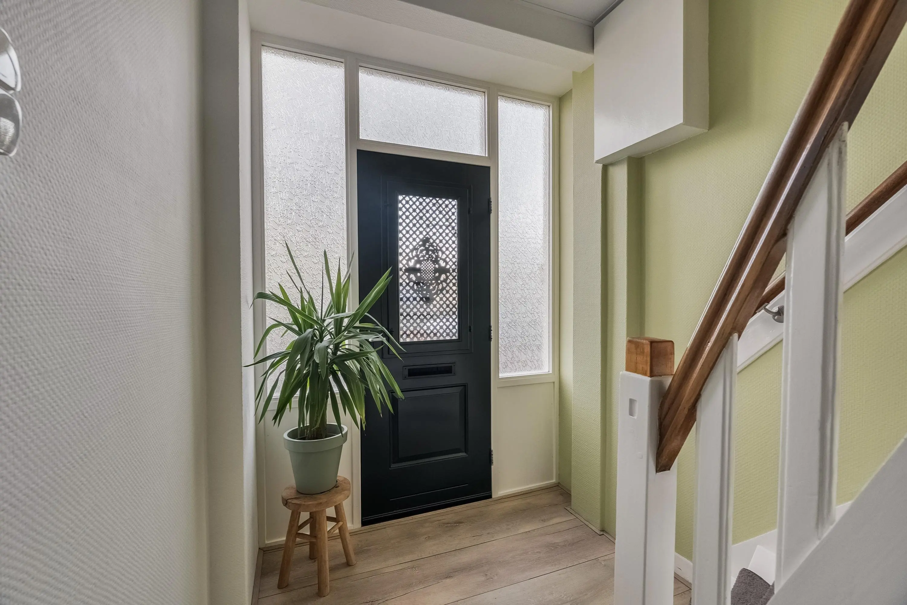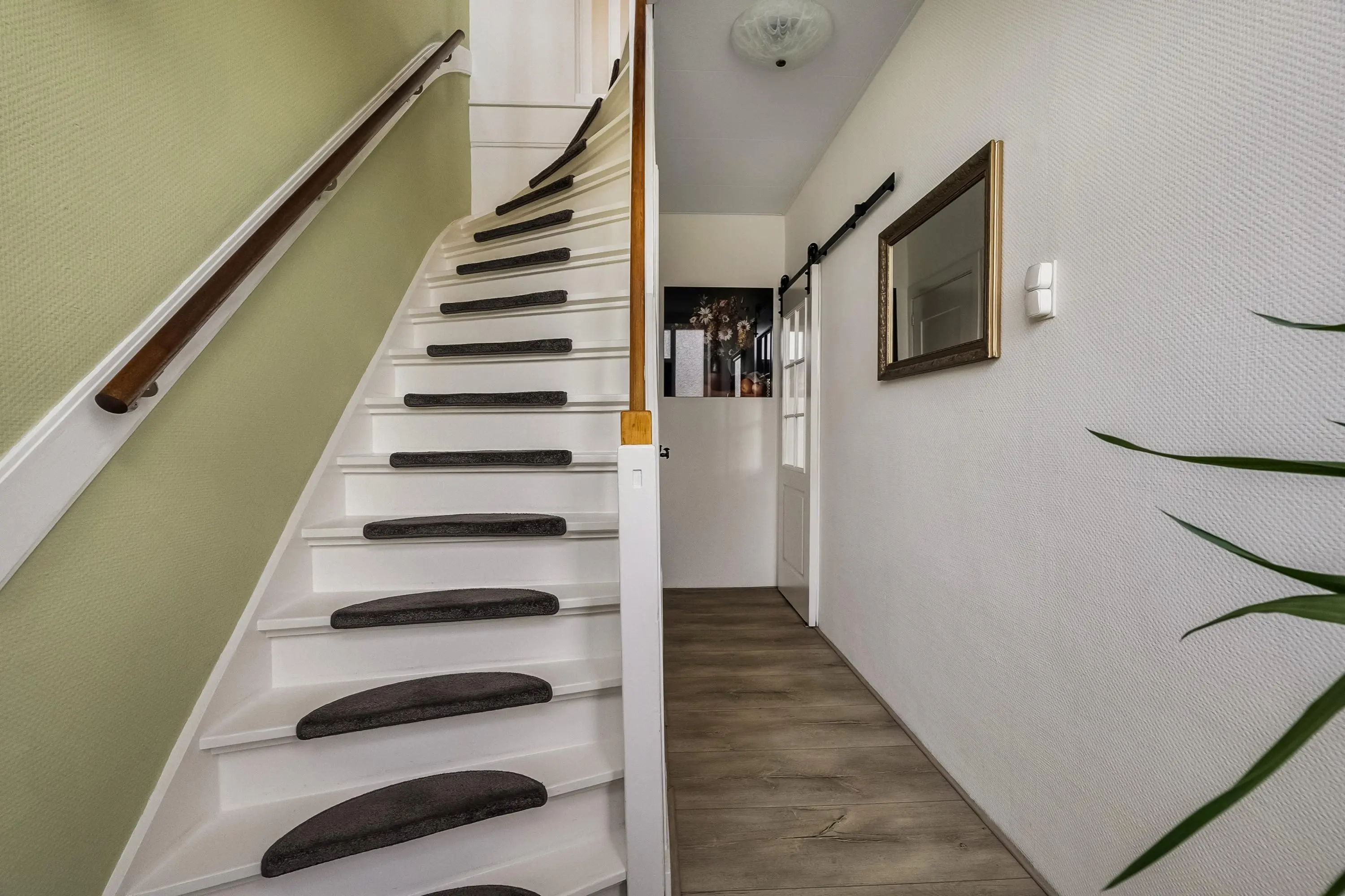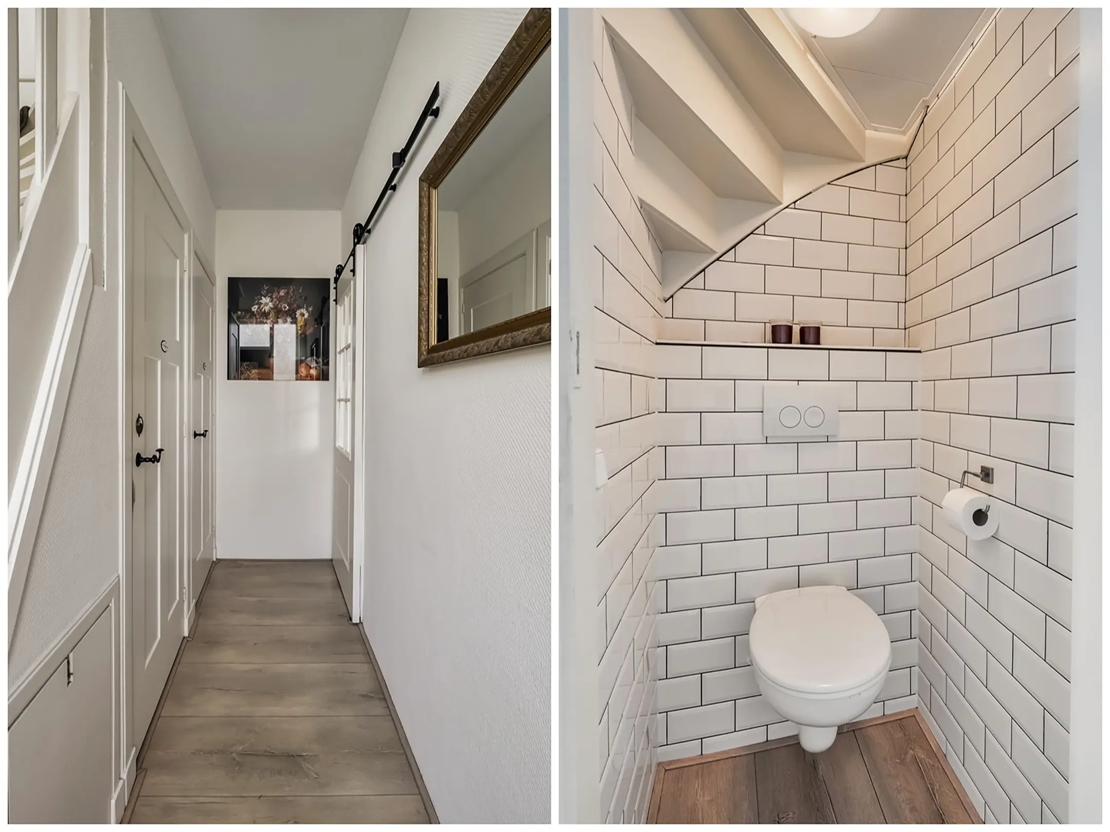 Entree, hal met meterkast en trap naar de 1e verdieping, toegang tot keldertje/voorraadkast. Toiletruimte voorzien van een hangend toilet. De toiletruimte is geheel betegeld in een wit/grijs kleurstelling en is afgewerkt met spotje en afzuigsysteem. Middels een schuifdeur heeft u toegang tot de woonkamer.
