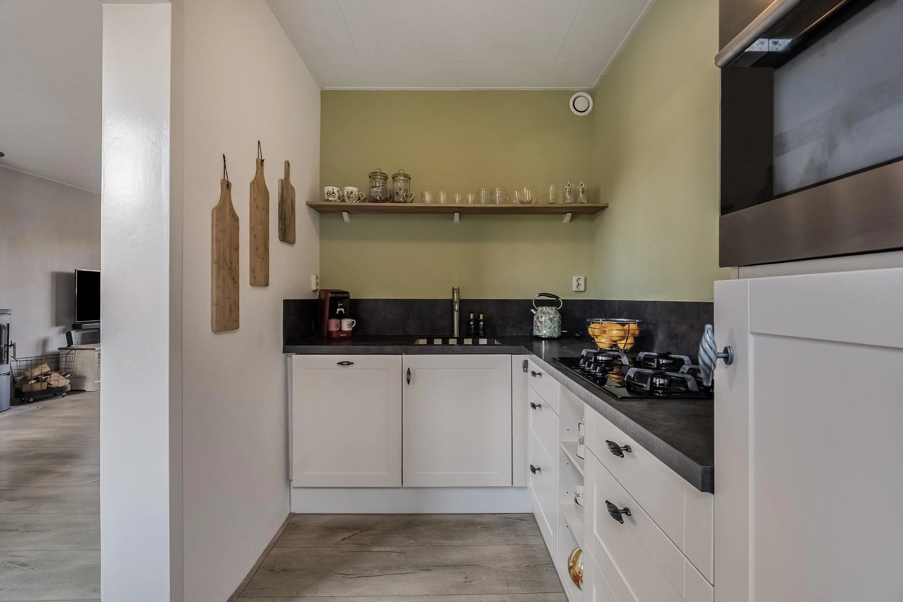 De halfopen keuken (ca. 5 m2) is gelegen aan de achterzijde van de woning en is uitgevoerd in een L-opstelling. De keuken is voorzien van een enkele spoelbak, koelkast, 4-pits gaskookplaat, RVS afzuigkap, combimagnetron en een vaatwasser. Het geheel is uitgevoerd in houtkleur en afgewerkt met een kunststof aanrechtblad en laminaatvloer. Via de keuken bereikt u de bijkeuken.