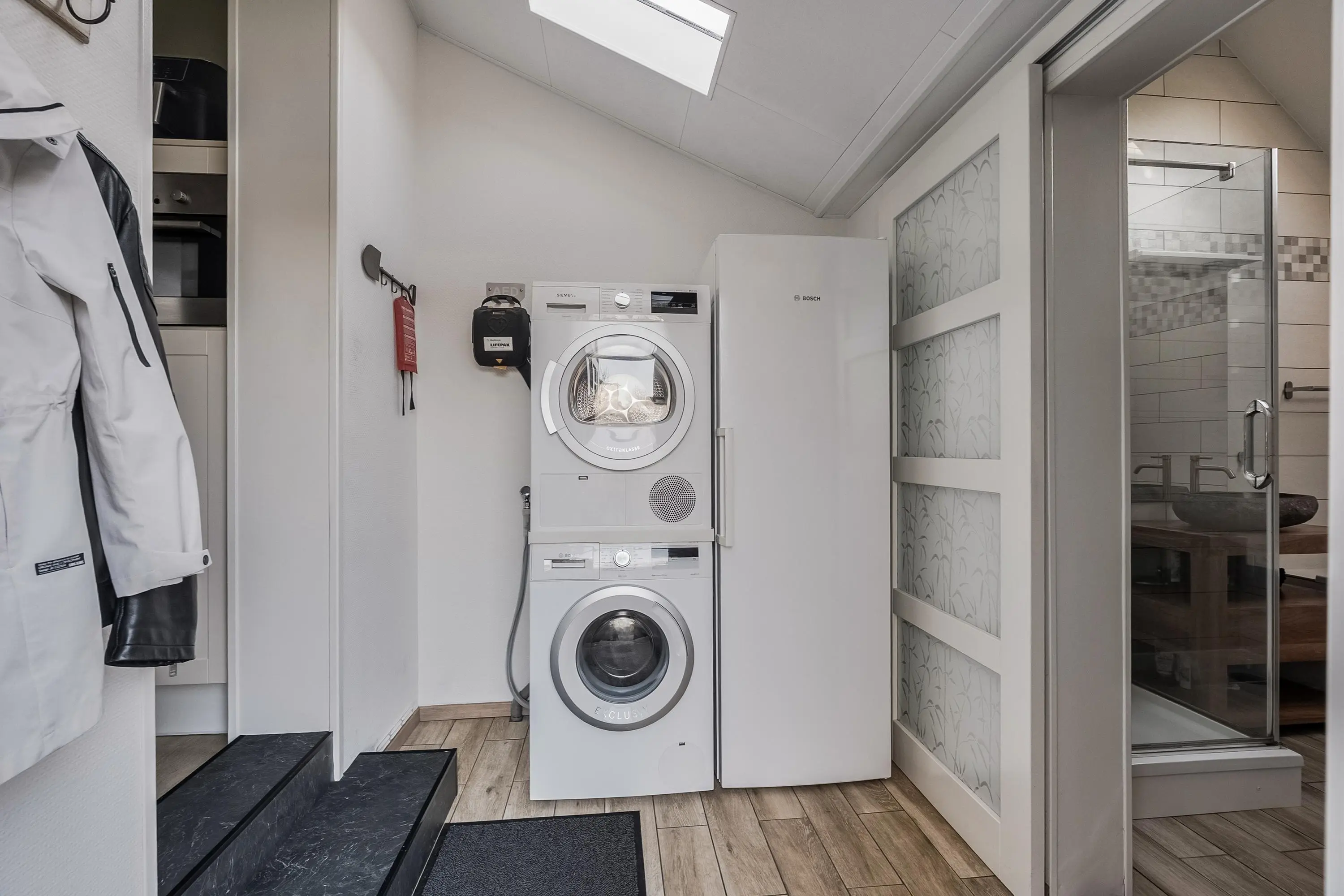 Bijkeuken (ca. 4 m2) met de wasmachine- en drogeraansluiting. De twee dakramen bieden voldoende natuurlijke lichtinval. De bijkeuken is verder voorzien van tegelvloer en wandtegels. De badkamer is via een schuifdeur bereikbaar. Via de bijkeuken heeft u toegang tot de achtertuin.