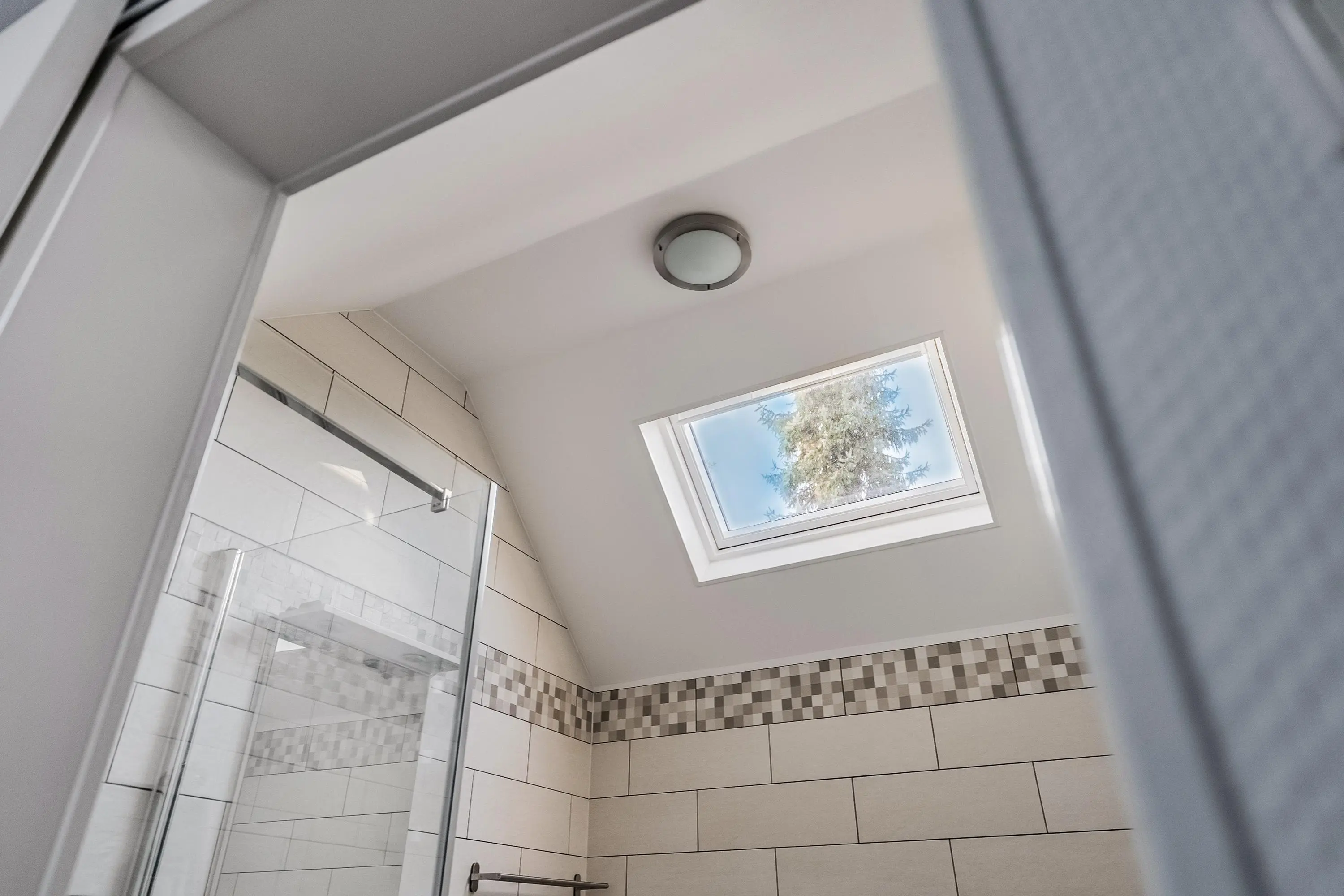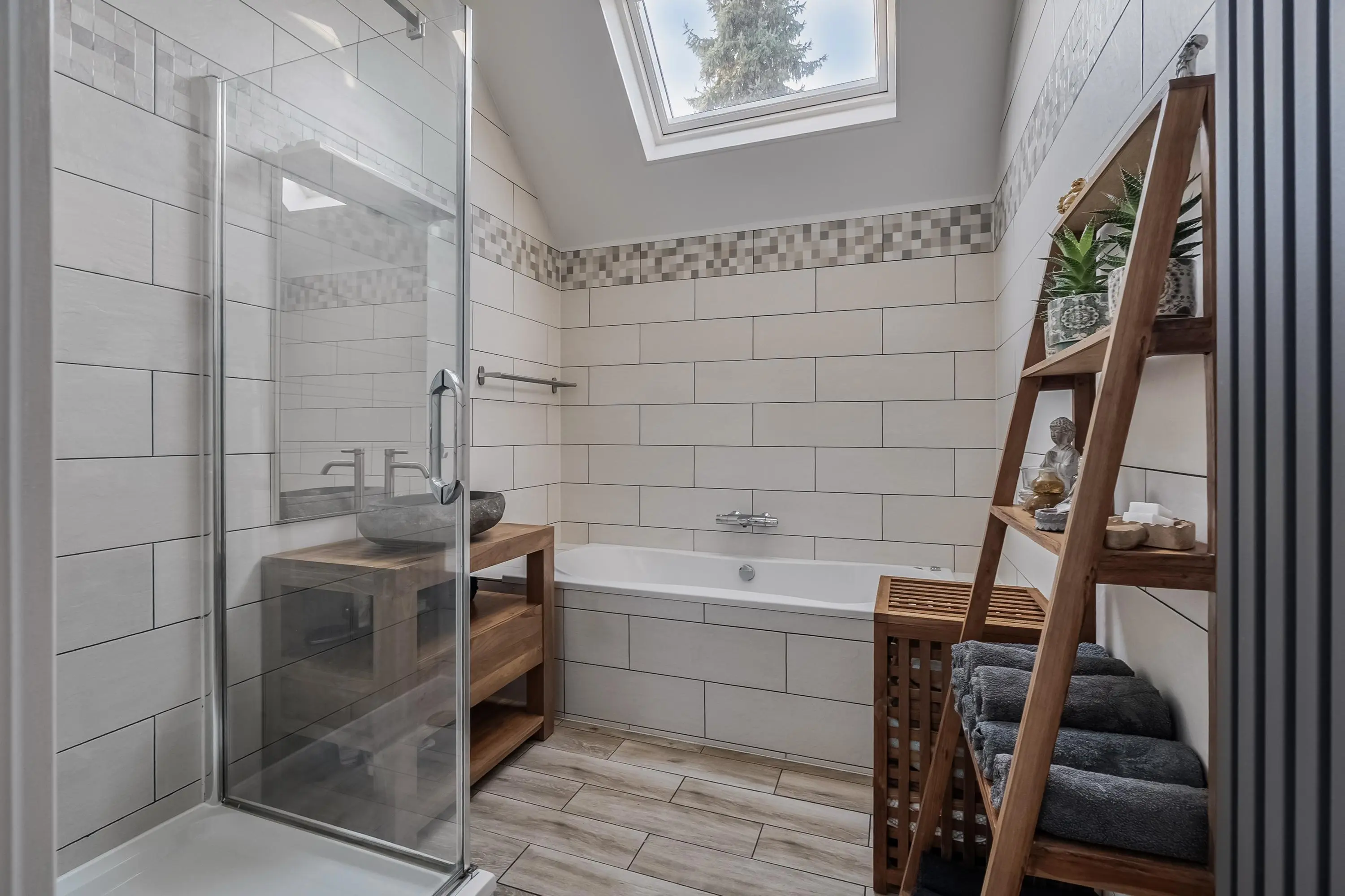 Moderne badkamer (ca. 6 m2) met sanitaire voorzieningen zoals een bubbelbad, een wastafel met wastafelmeubel, spiegel, verlichting, douchecabine met douche en designradiator. De badkamer is geheel betegeld en afgewerkt met houtlook tegelvloer. Het grote dakraam zorgt voor voldoende natuurlijk daglicht in de badkamer.