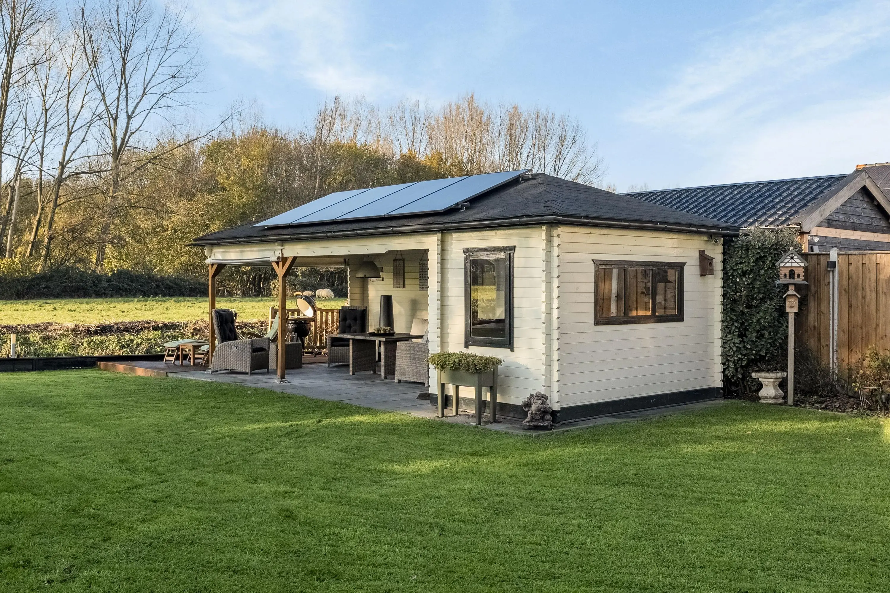 Overkapping (ca. 15 m2) voorzien van elektra, stopcontacten en een elektrische terrasverwarming.