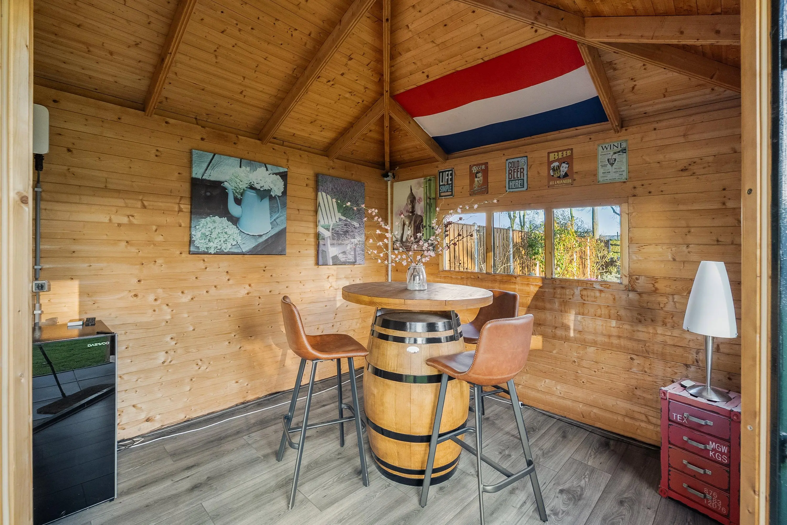 Houten schuur (ca. 13 m2) voorzien van elektra en stopcontacten.