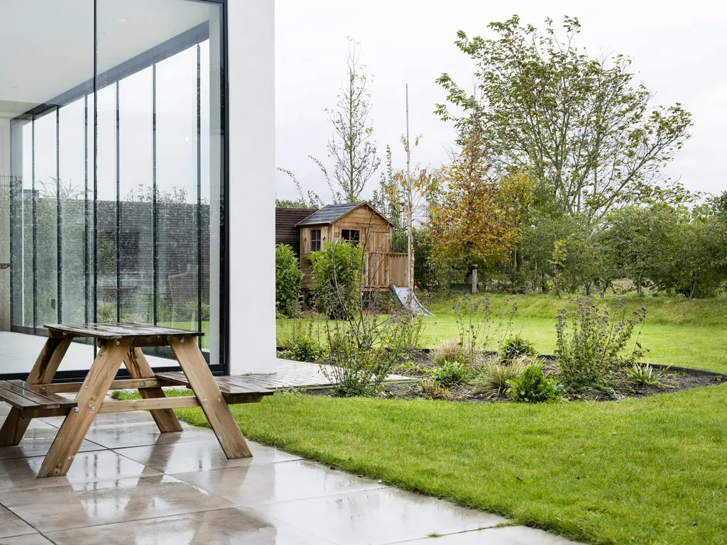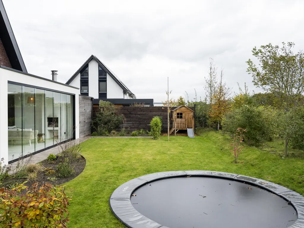 Buiten vind je een goed onderhouden tuin met zowel een achtertuin, voortuin als een zijtuin. De achtertuin met vrij uitzicht is voorzien van een tuinhuis, zandbak, trampoline en een kippenren. Tevens is de er een Rainbird bewateringsysteem in zowel de voor- en achtertuin.