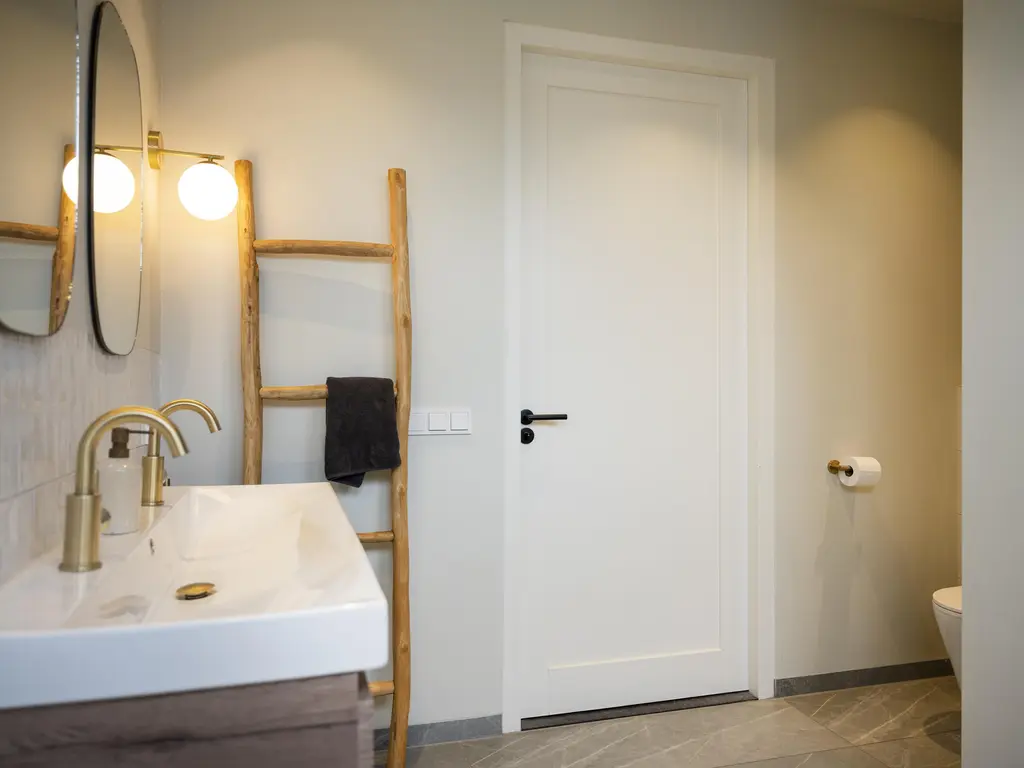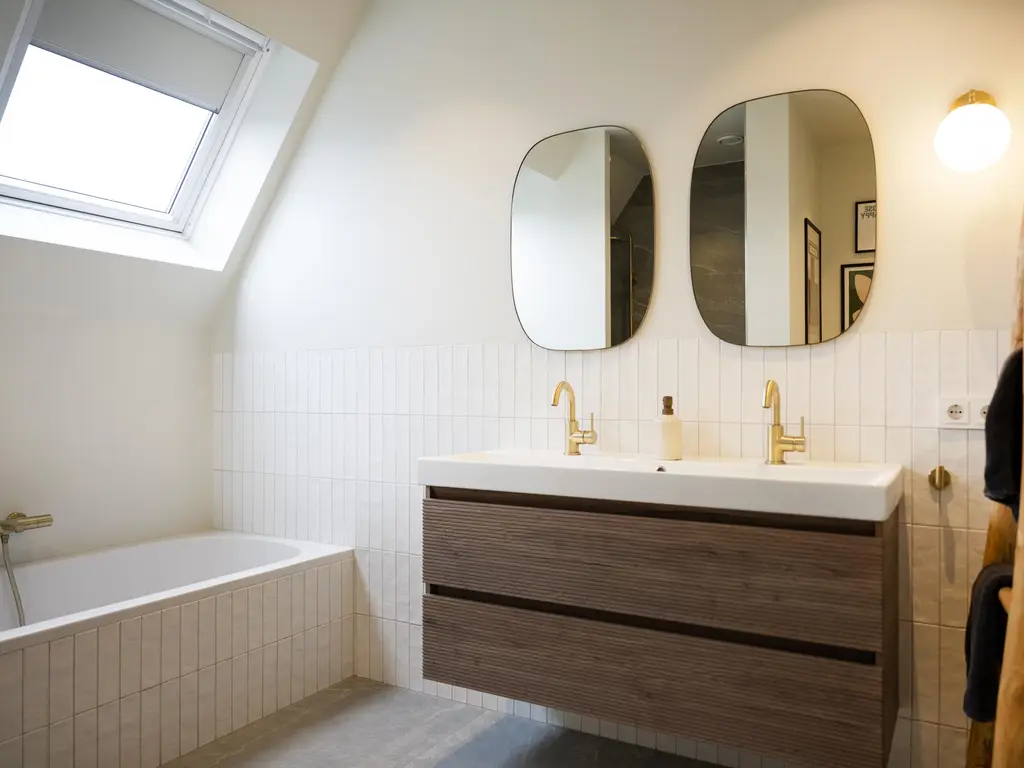 Op de eerste verdieping vinden we een viertal kamers welke allen zijn voorzien van een praktische inbouwkast, tevens biedt een van de slaapkamer ook toegang tot de stookruimte. De badkamer (2023) is voorzien van een hangend closet, dubbel wastafelmeubel, ligbad en inloopdouche met hand- en regendouche.