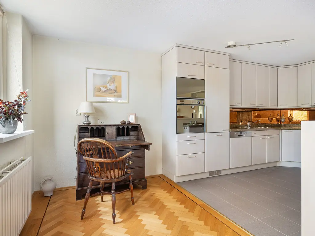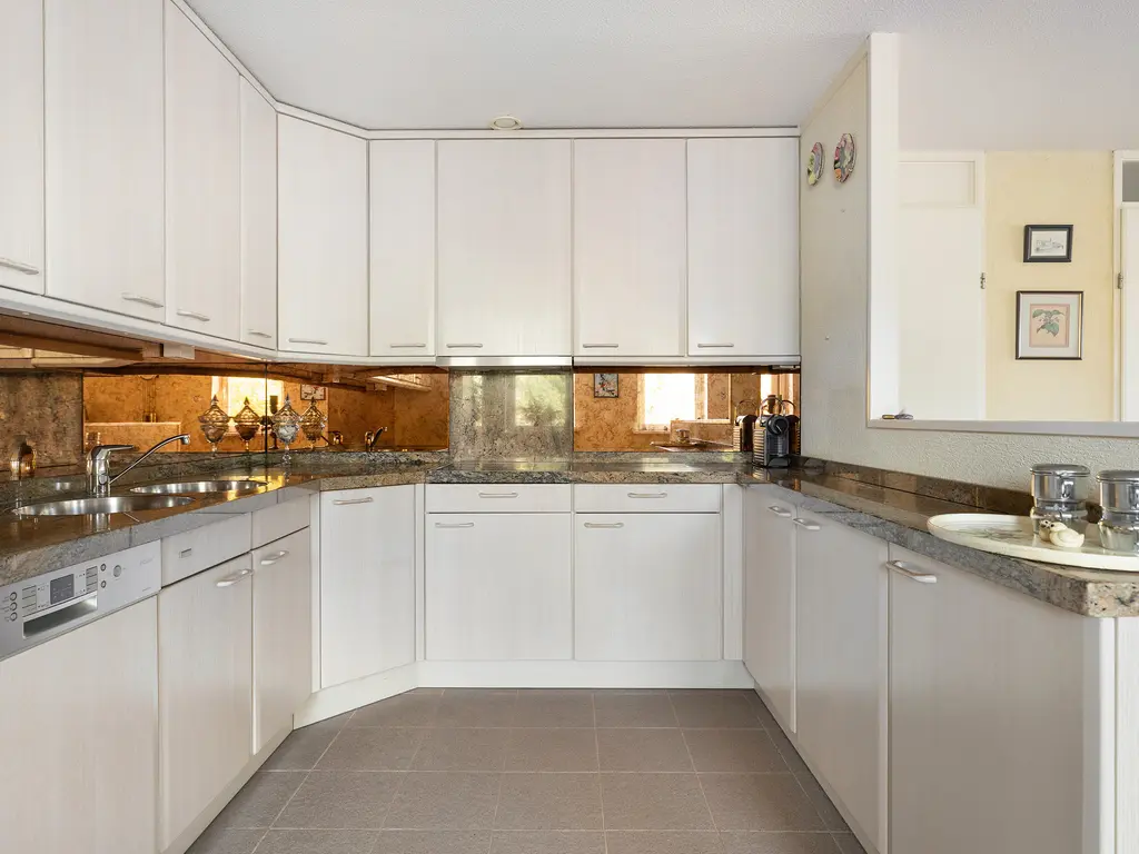 De open keuken heeft een moderne U-opstelling en is halfopen door een laag muurtje dat zorgt voor een prettige verbinding tussen koken en wonen. De keuken is compleet uitgevoerd met hoogwaardige inbouwapparatuur zoals een oven en magnetron van Gaggenau, een 4-pits keramische kookplaat met vlakschermafzuigkap, een vaatwasser, koelkast en vrieskast. De vloer is afgewerkt met stijlvolle plavuizen.