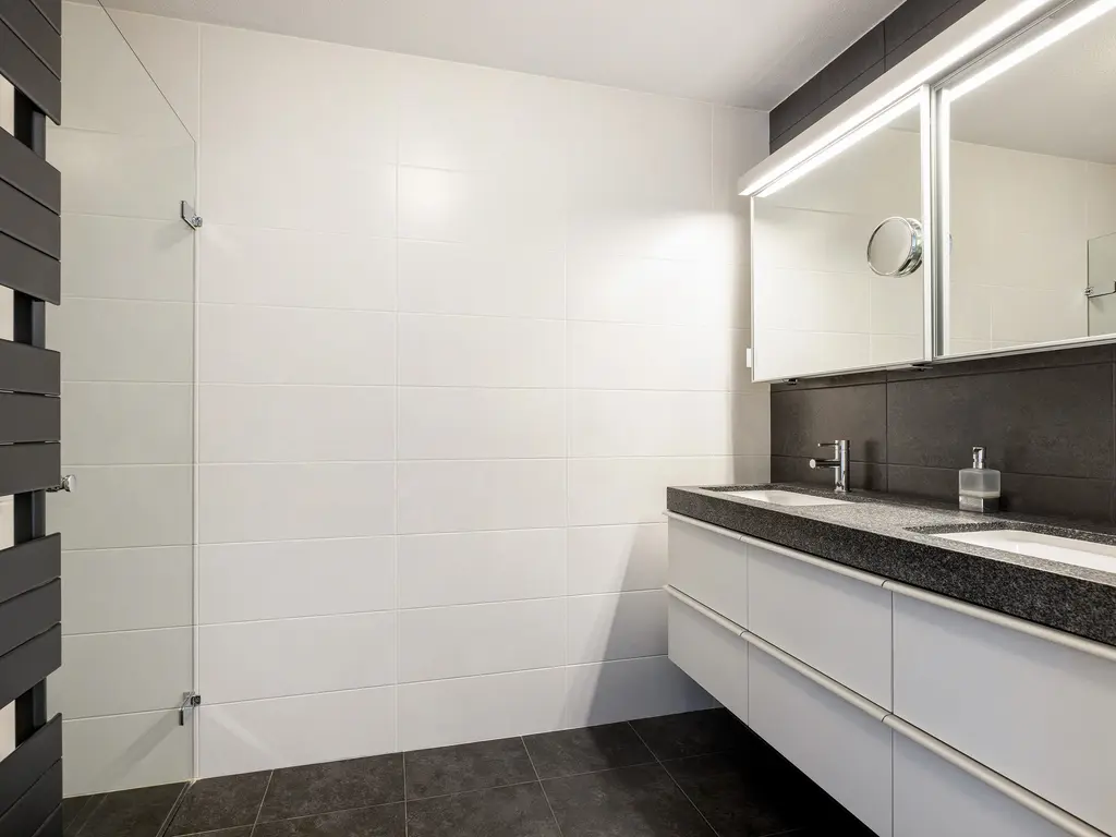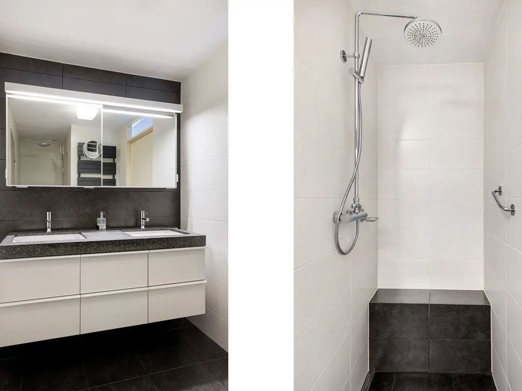 De badkamer is geheel betegeld in een lichte kleurstelling en beschikt over een inloopdouche met regendouche, een dubbel wastafelmeubel met veel bergruimte, een verlichte spiegelkast en een designradiator in matzwart.