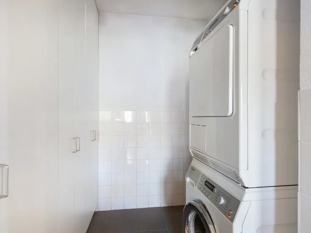 Vanuit de woonkamer heeft u toegang tot de bijkeuken, met de aansluitingen voor de wasmachine en droger – praktisch en netjes uit het zicht.