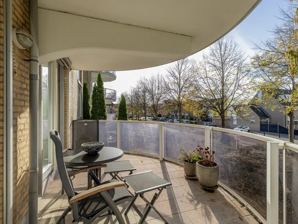 Het terras ligt op het westen en biedt een prachtig uitzicht over de groenstrook en het water voor het complex. Dankzij de ligging op de hoek heeft u een vrij uitzicht over de omgeving. Vanuit zowel de woonkamer als de hoofdslaapkamer is het terras direct toegankelijk via schuifpuien.