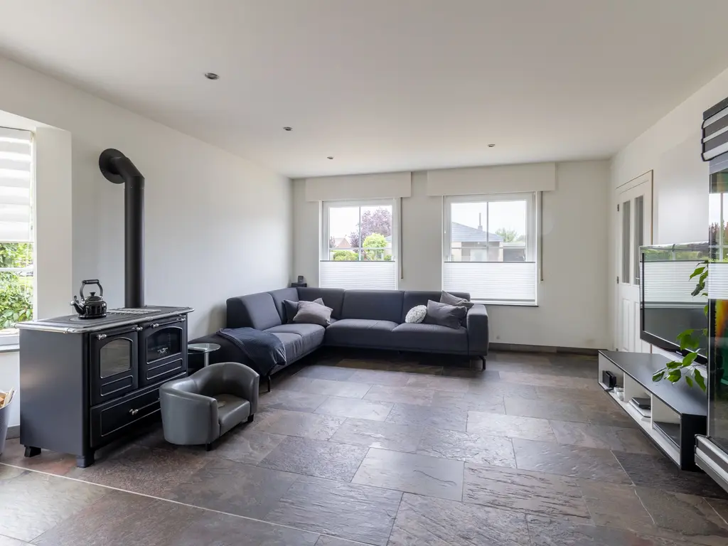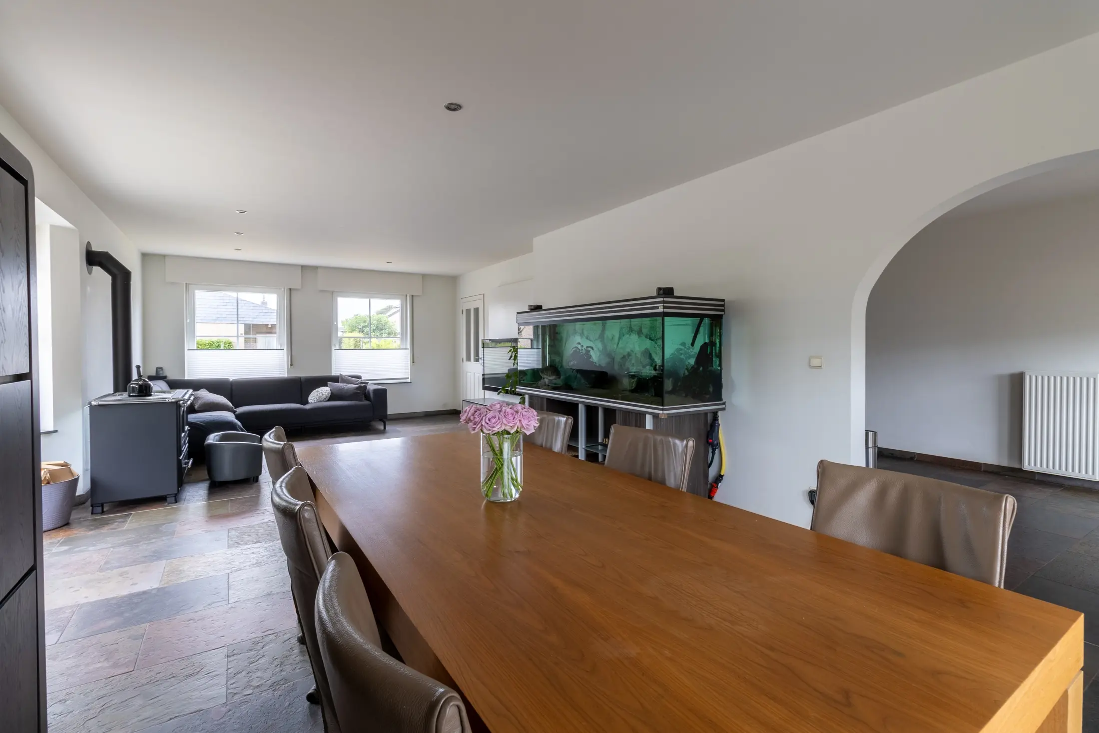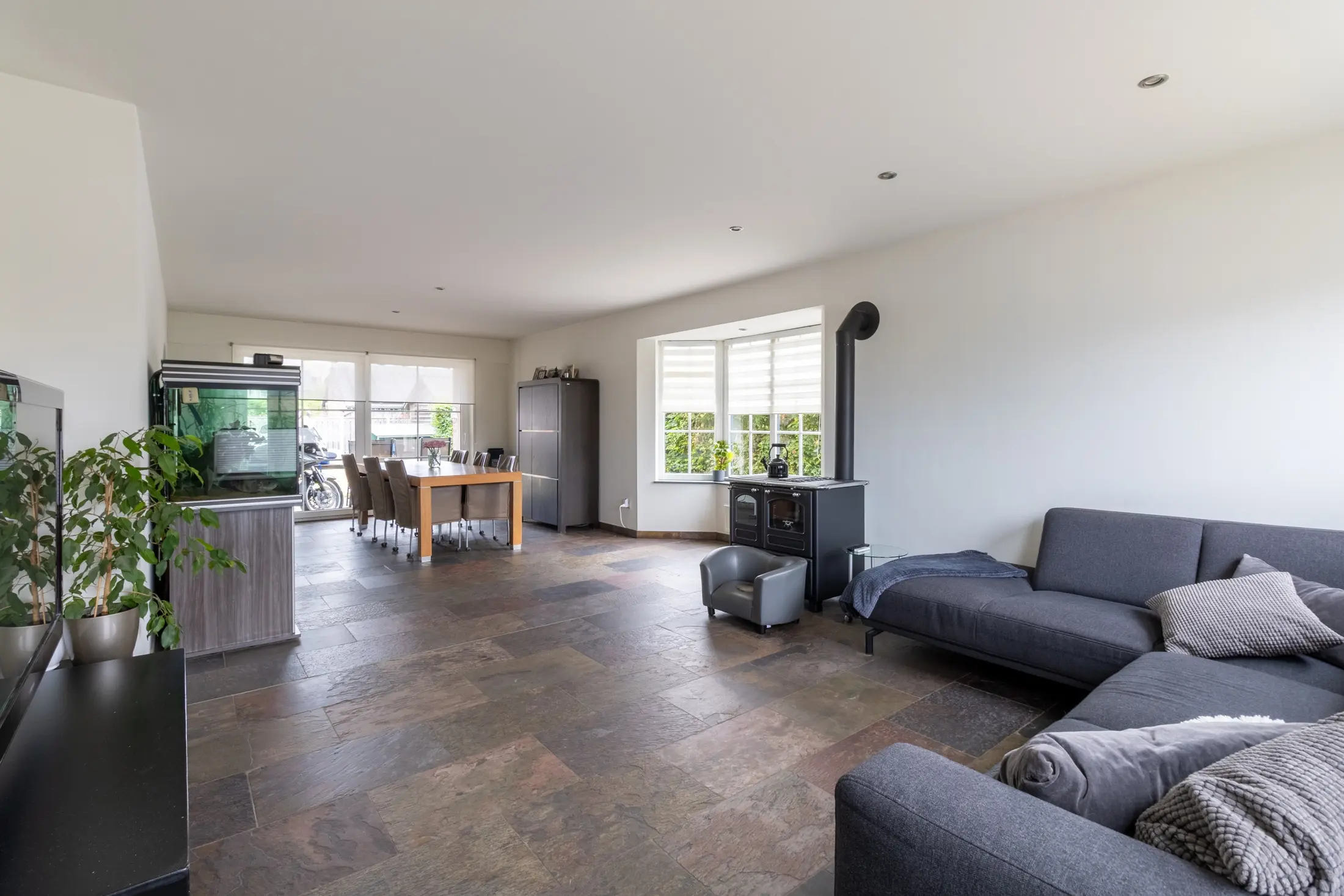 De woonkamer en eetkamer vormen één doorlopende leefruimte op stijlvolle natuursteen, baad in het natuurlijk licht en worden extra gezellig gemaakt door een houtkachel.