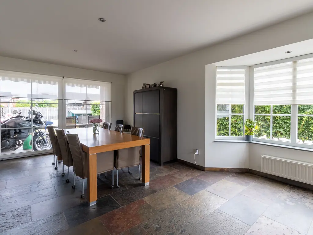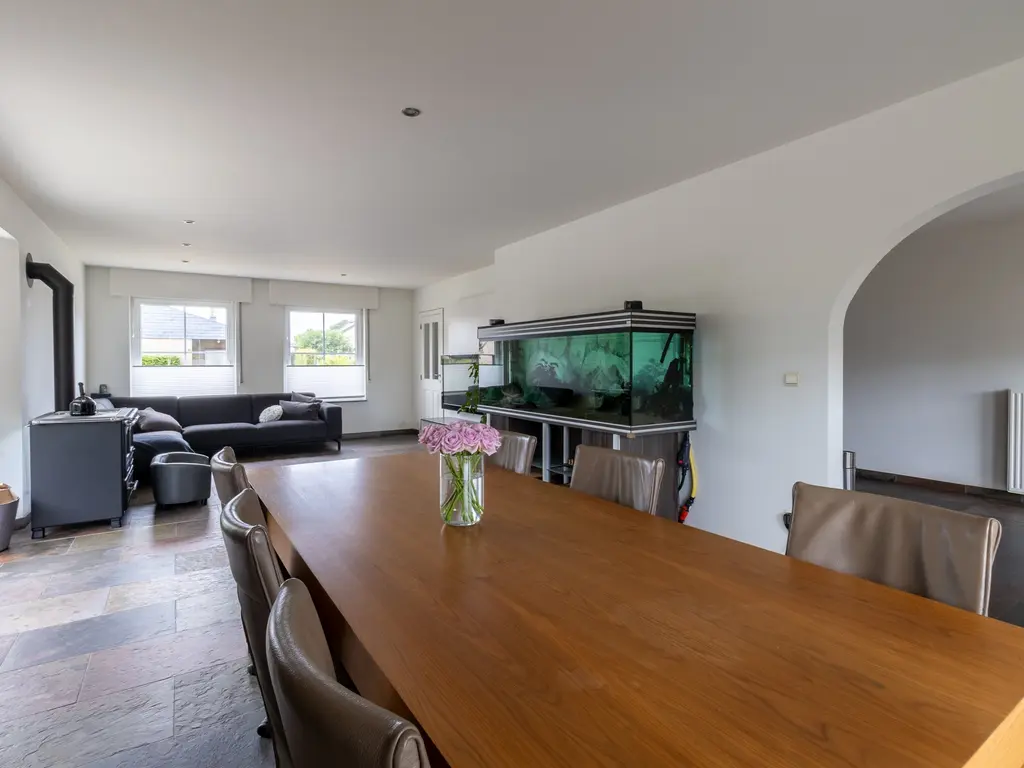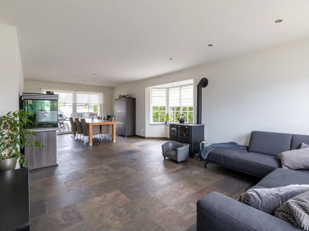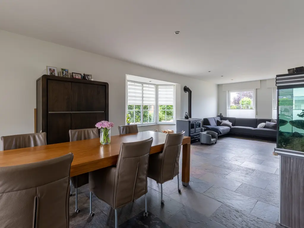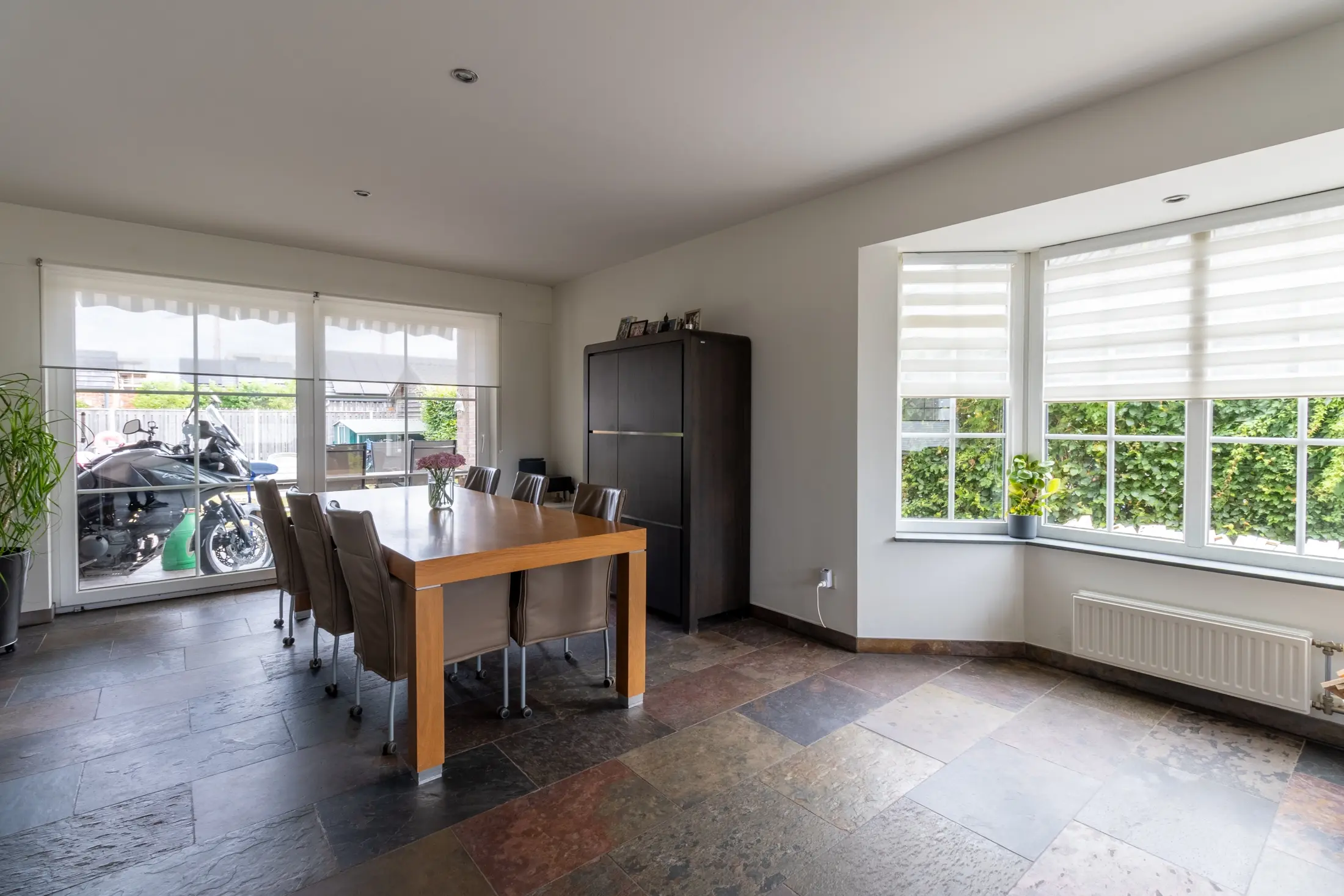 De woonkamer en eetkamer vormen één doorlopende leefruimte op stijlvolle natuursteen, baad in het natuurlijk licht en worden extra gezellig gemaakt door een houtkachel.