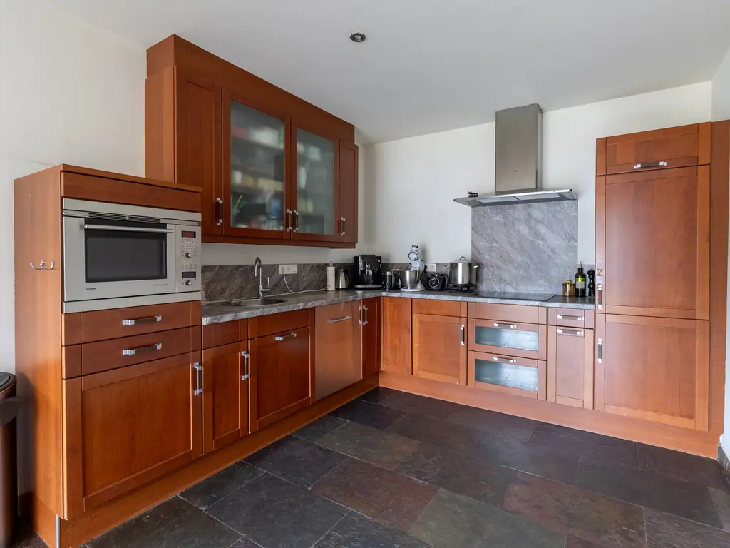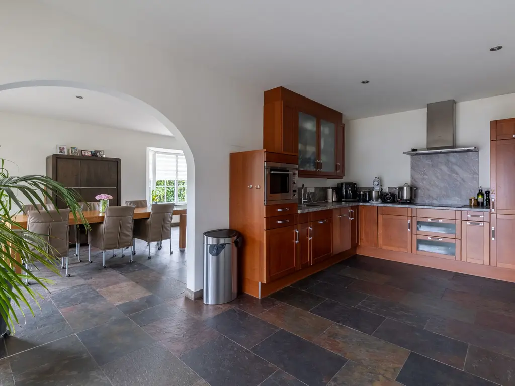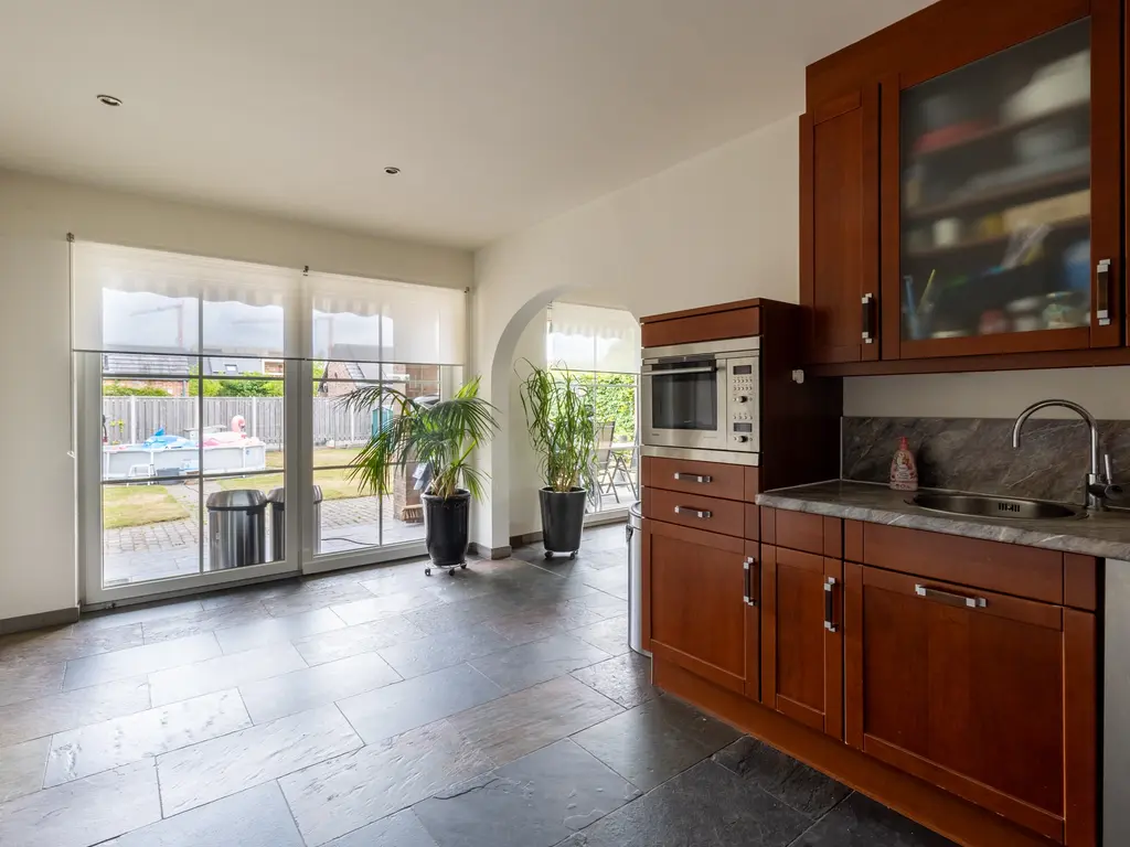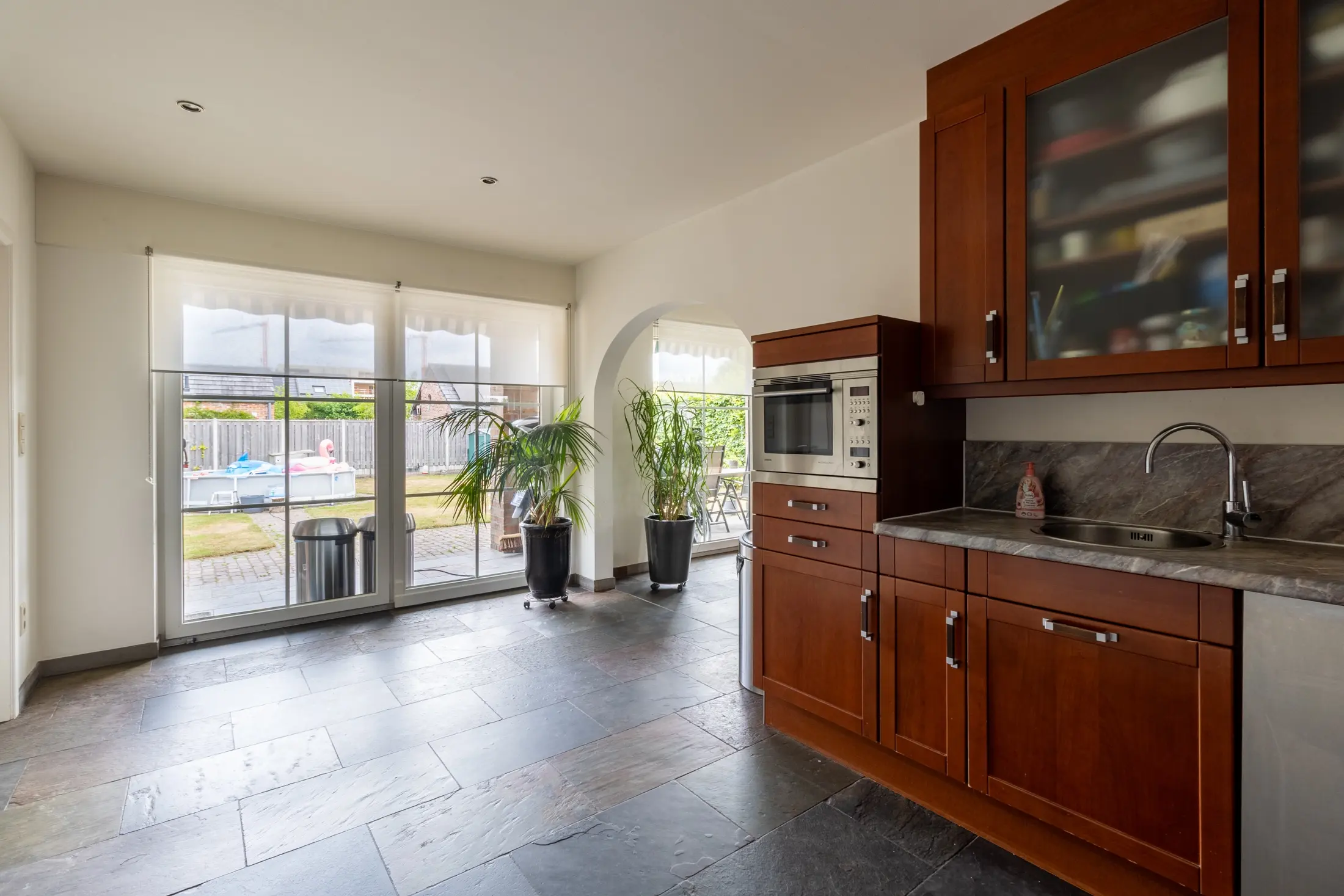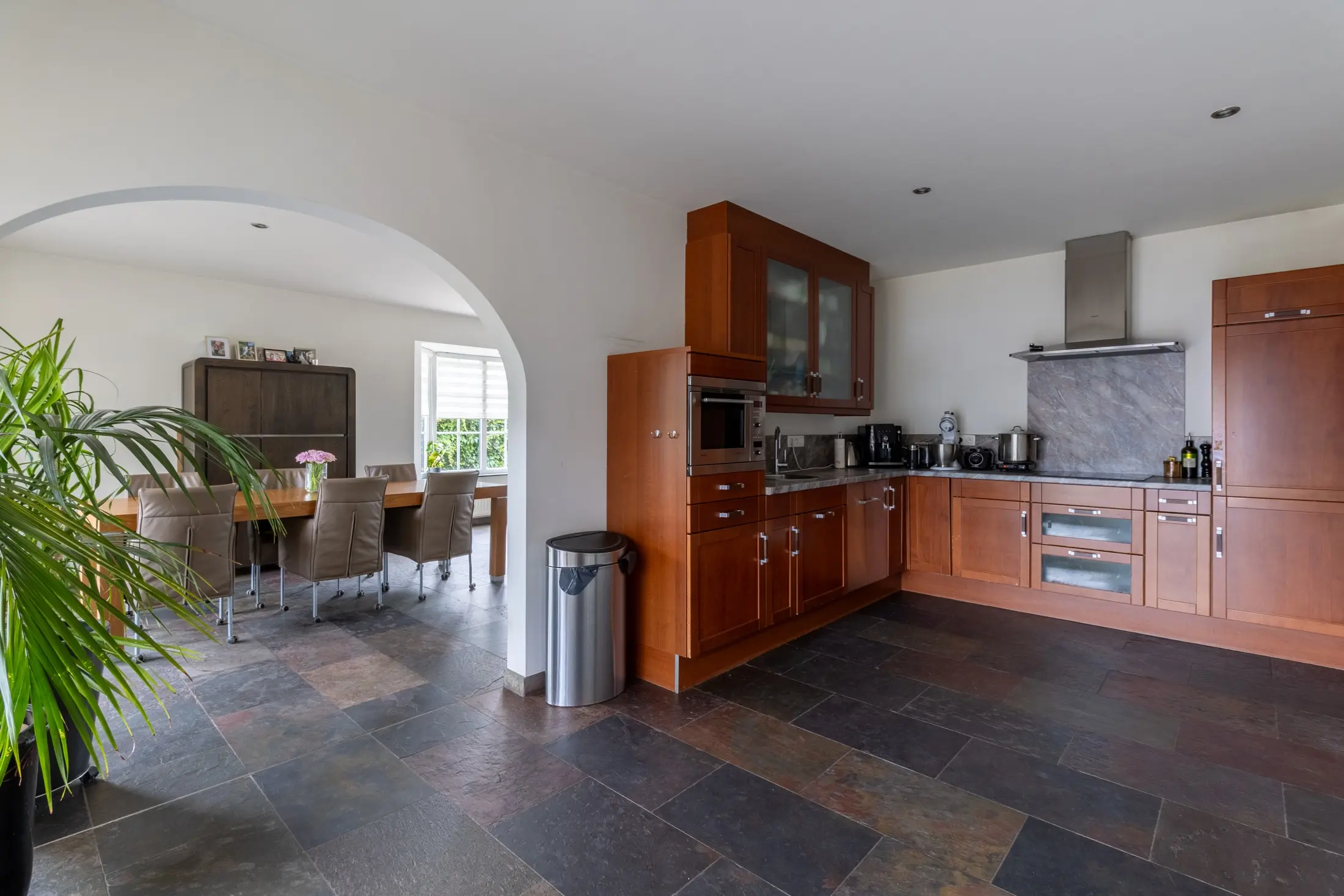 Aansluitend vind je de volledig uitgeruste keuken met massief-houten kasten, natuurstenen werkblad en ingebouwde apparatuur – ideaal voor wie graag kookt.