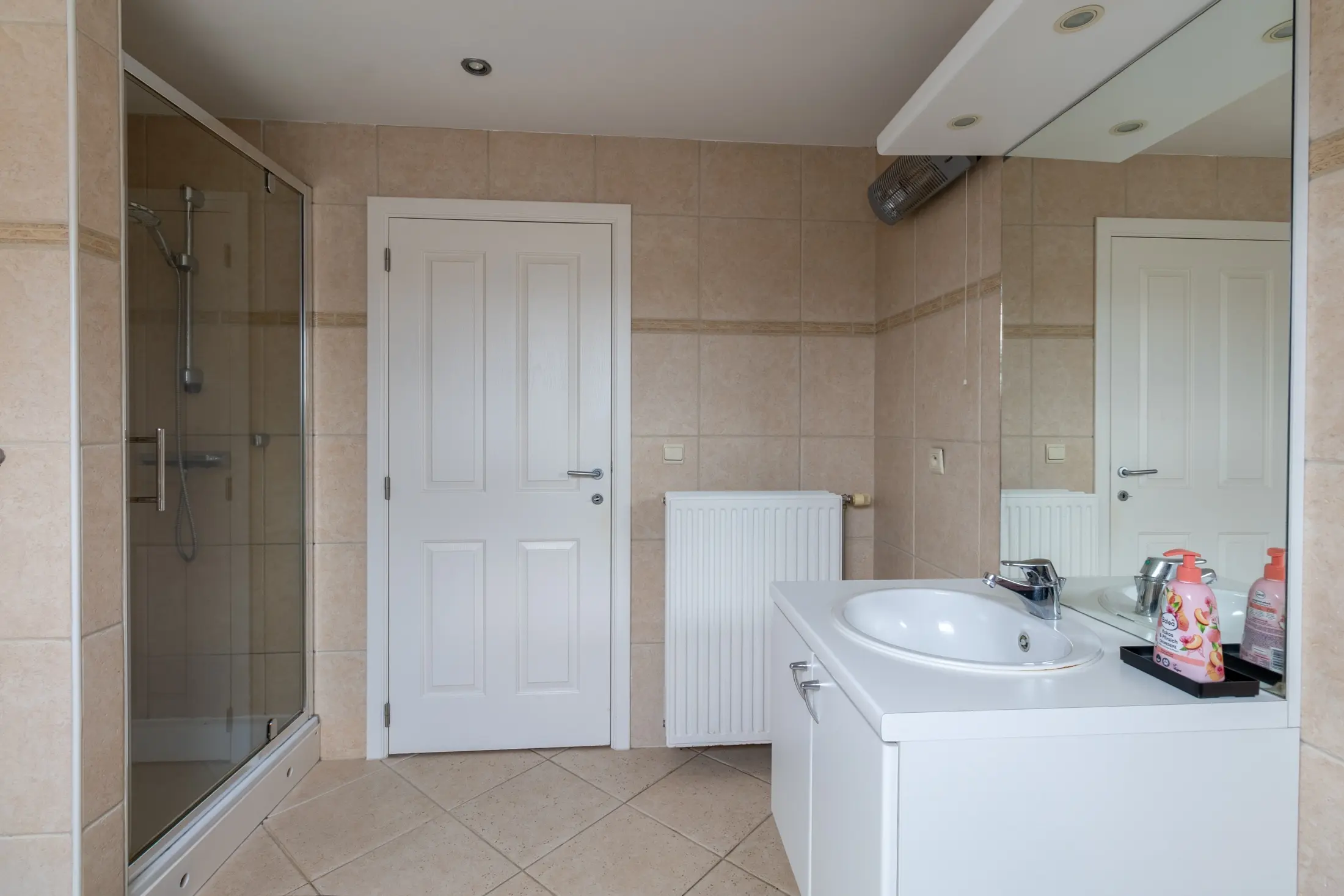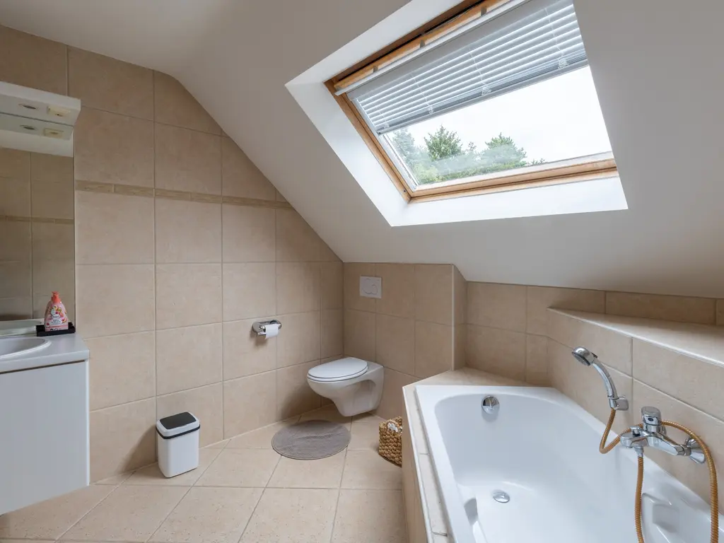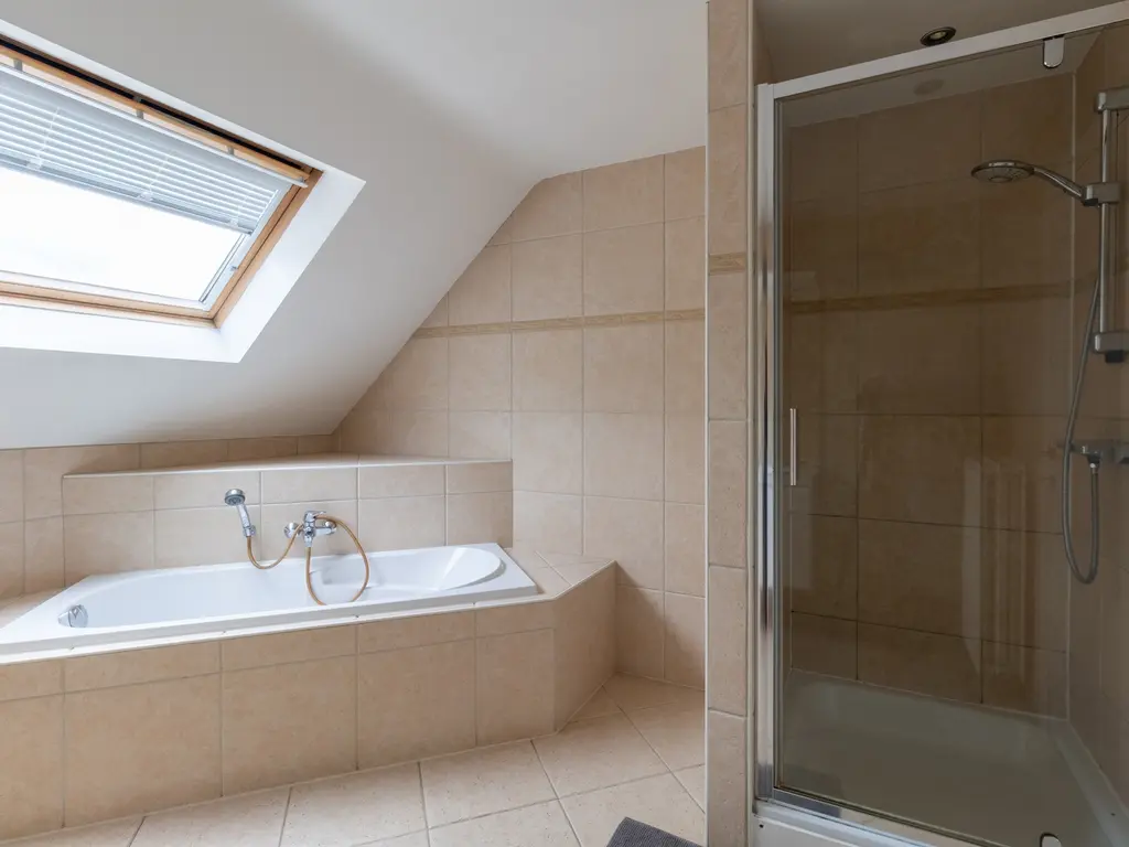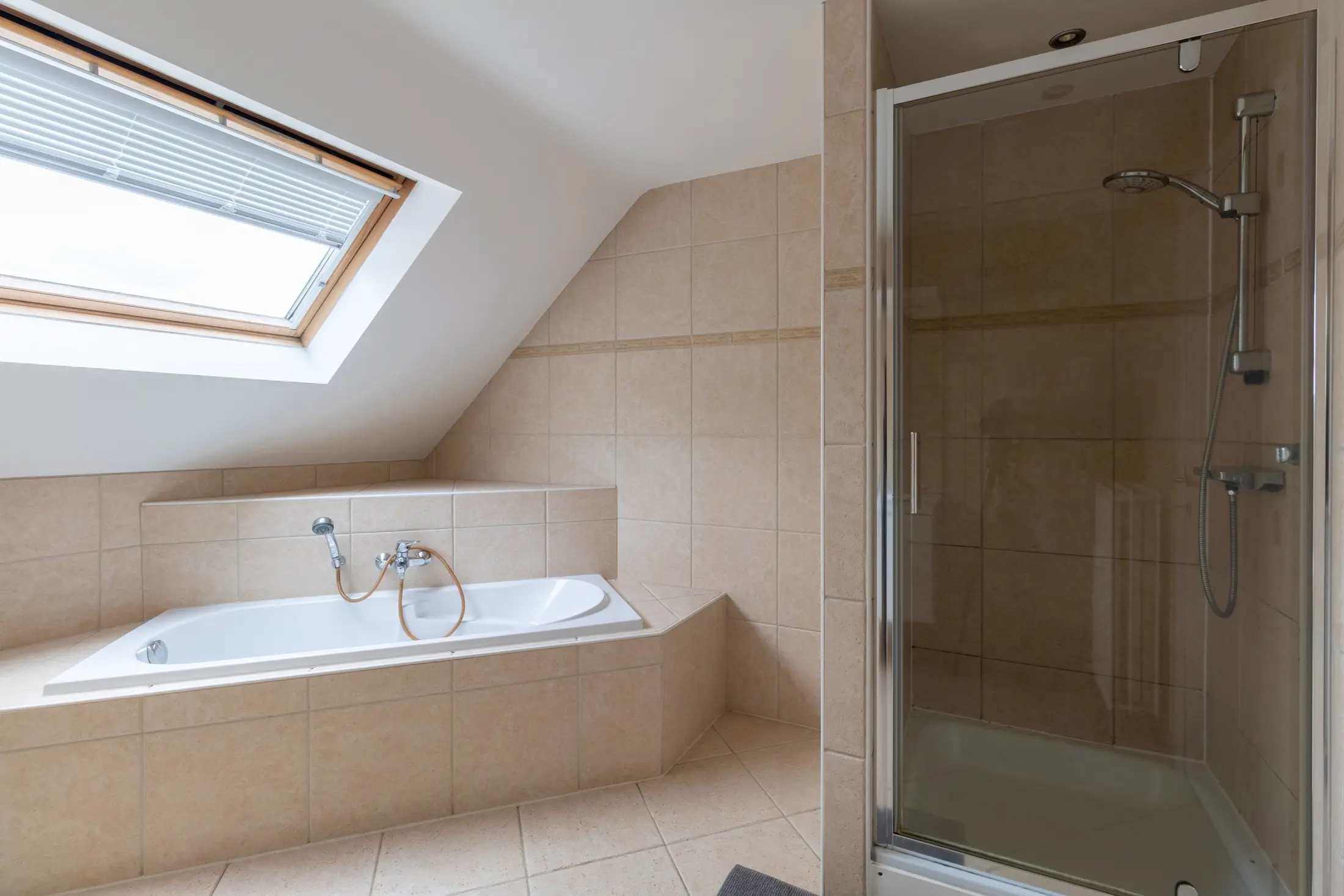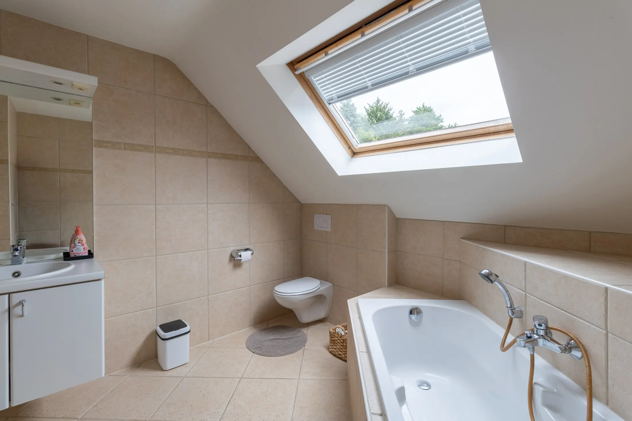 De volledig betegelde badkamer combineert een ligbad onder een dakraam met aparte douche en modern wastafelmeubel.