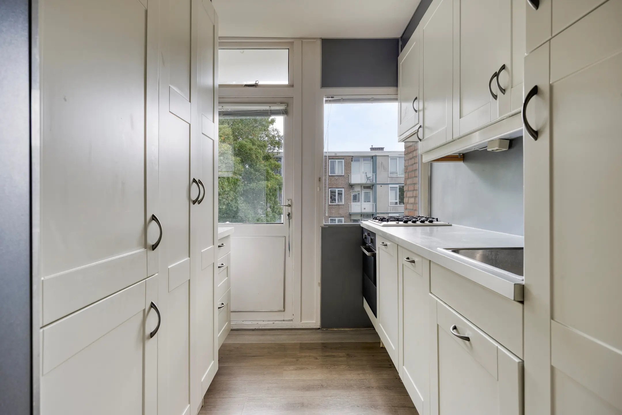 Bij binnenkomst tref je een ruime hal die toegang biedt tot vrijwel alle vertrekken. De lichte woonkamer heeft grote ramen en veel natuurlijke lichtinval, wat zorgt voor een prettige en open sfeer. De keuken beschikt over diverse inbouwapparatuur en geeft toegang tot het tweede balkon aan de achterzijde. Er zijn twee slaapkamers: één slaapkamer biedt toegang tot het balkon aan de voorzijde van het complex, terwijl de andere directe toegang heeft tot de badkamer.