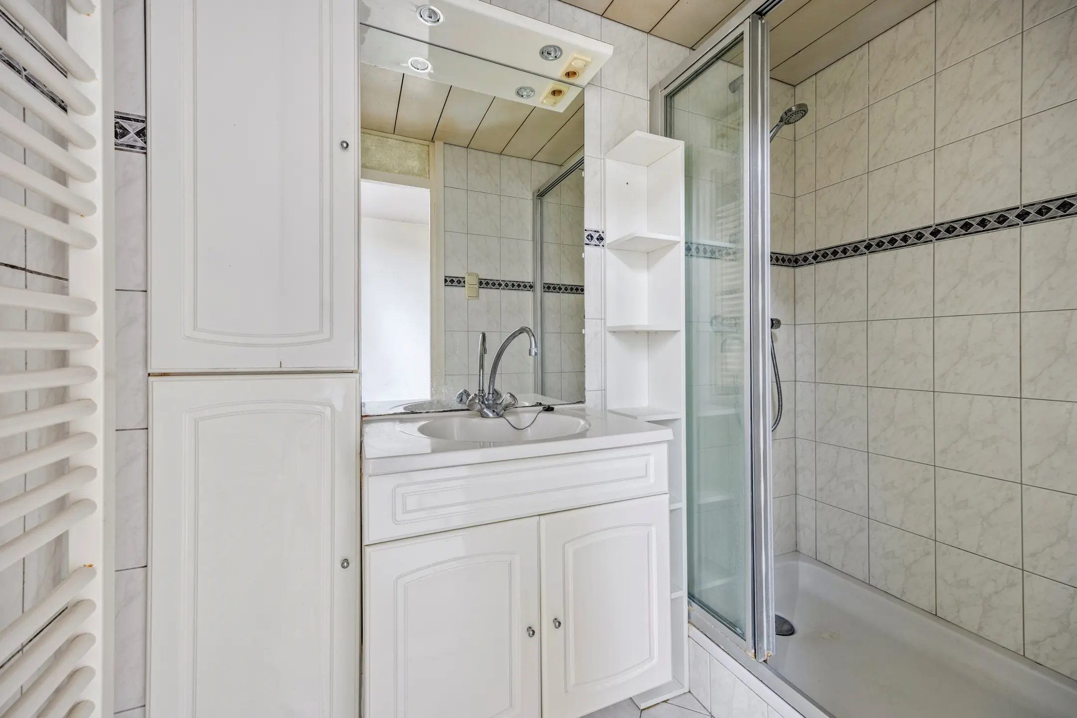The bathroom is fitted with a shower, a washbasin with furniture, enough storage and a heated towel rail. The toilet is separate.