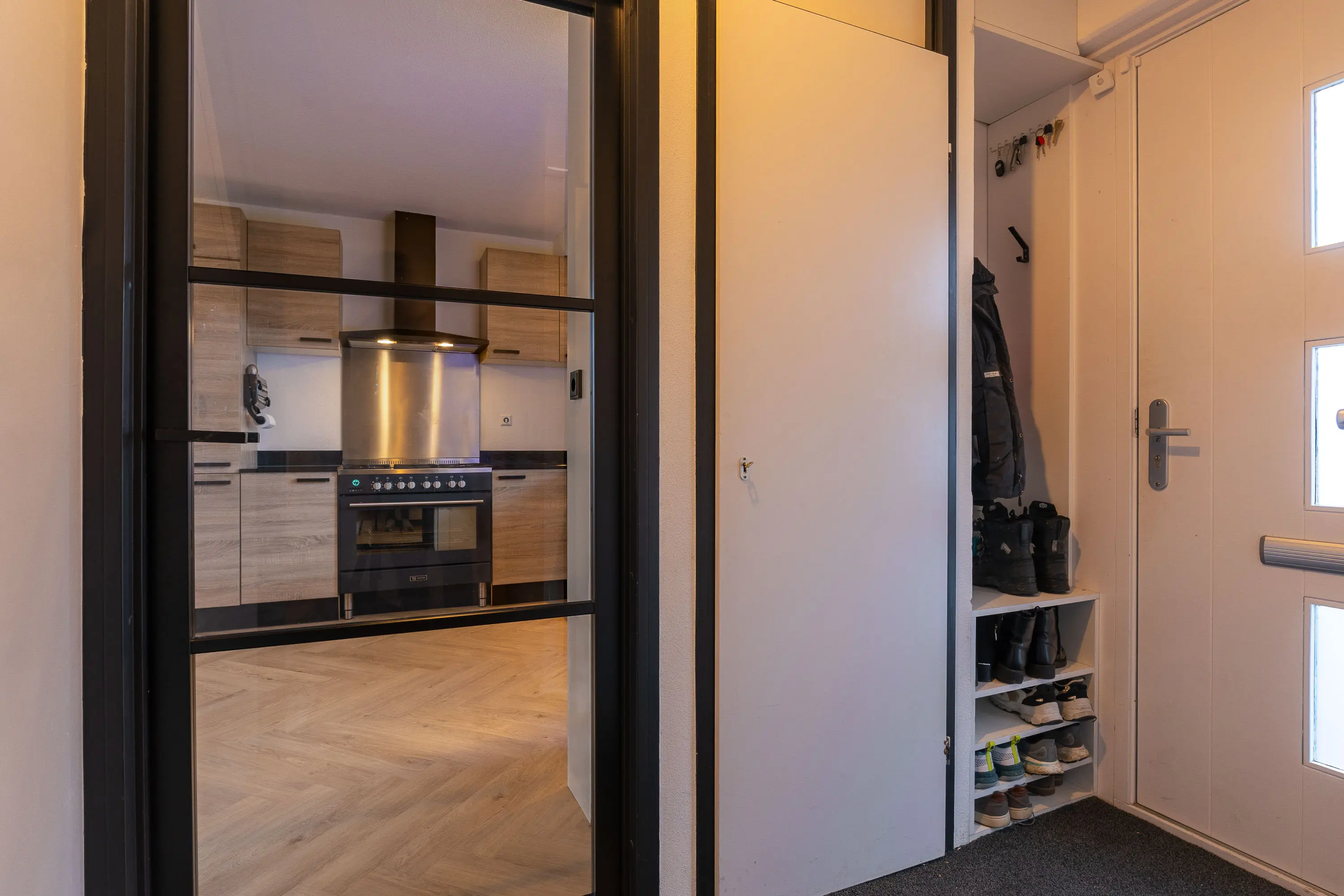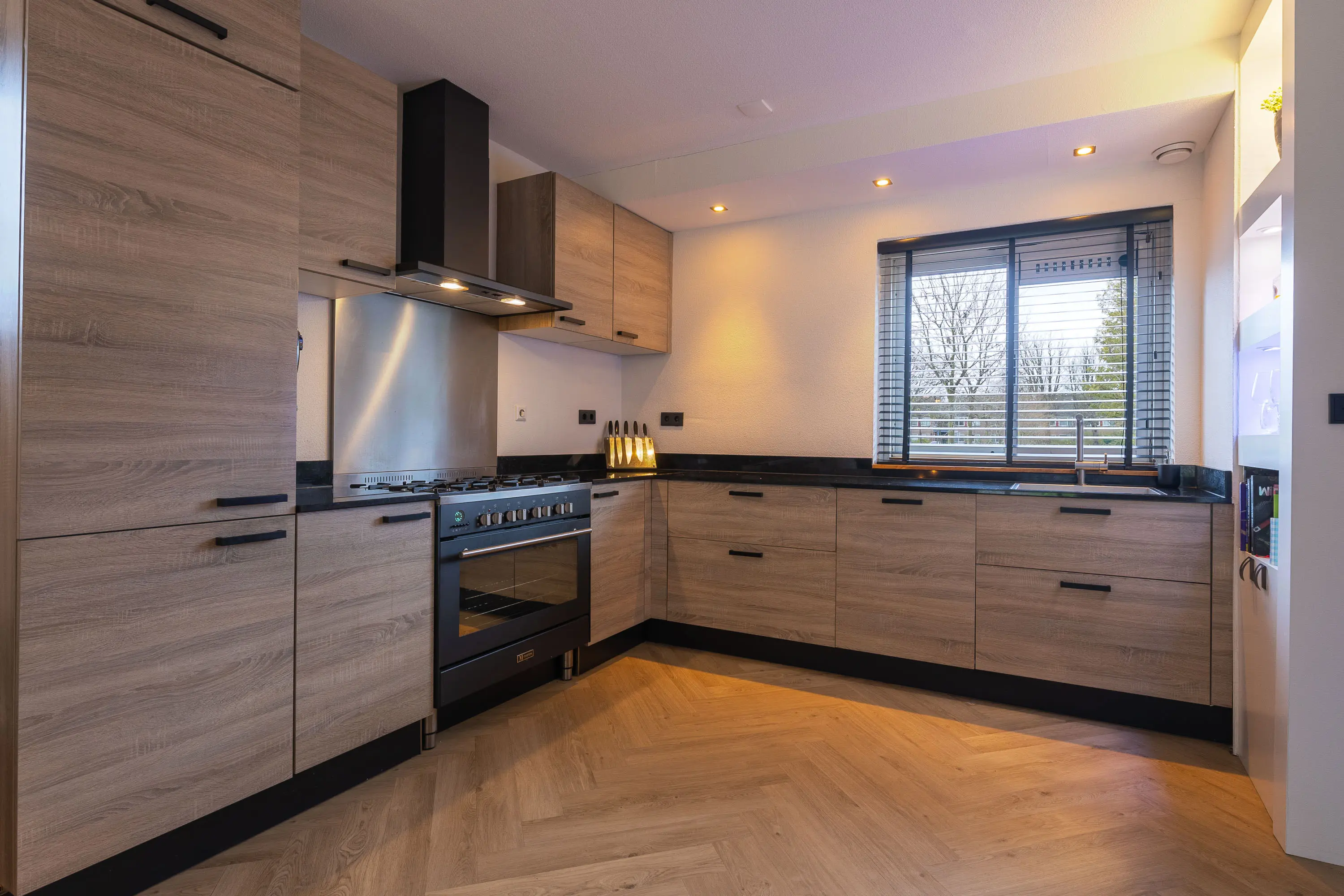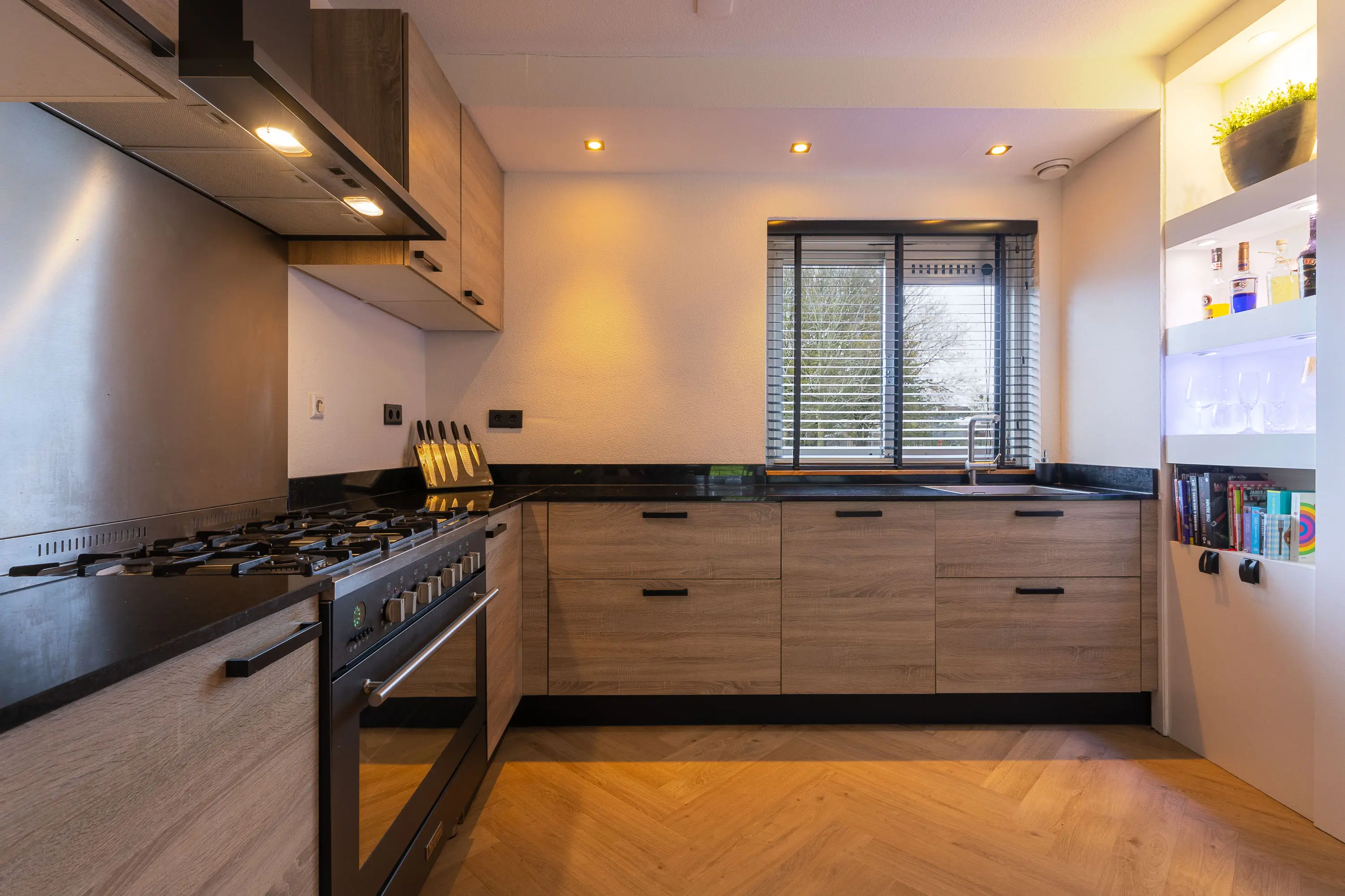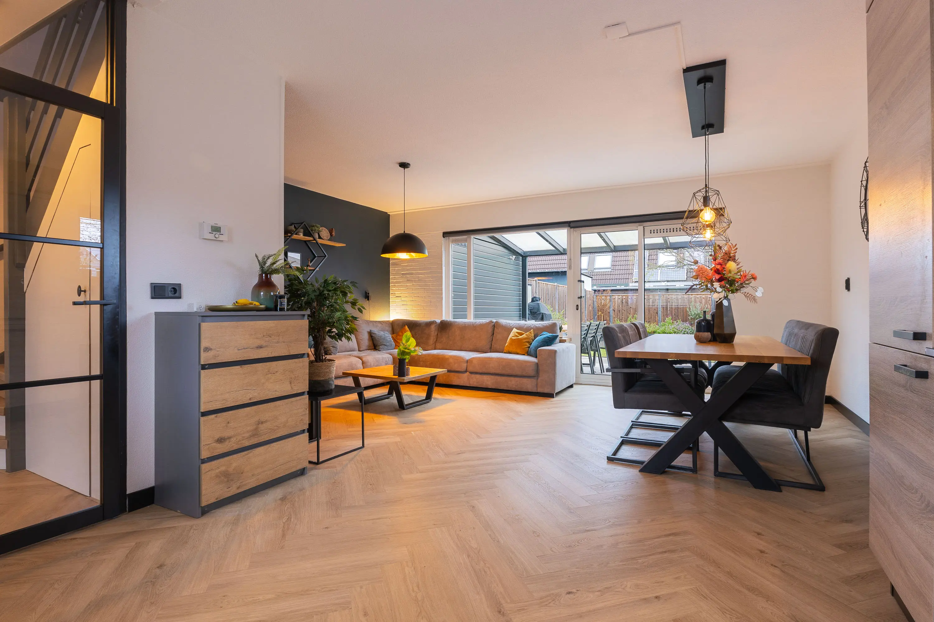Begane grond: Lichte hal met vernieuwde meterkast en modern toilet (2015). Tuingerichte woonkamer met schuifpui en visgraat PVC-vloer met vloerverwarming. Open keuken (2015) voorzien van o.a. 6-pits fornuis met oven, vaatwasser, koelkast, vriezer en stenen blad. Vanuit de woonkamer toegang tot de sfeervolle veranda met verlichting en de recent vernieuwde tuin (2024) met zonneterras, gazon, berging en fietsoverkapping.