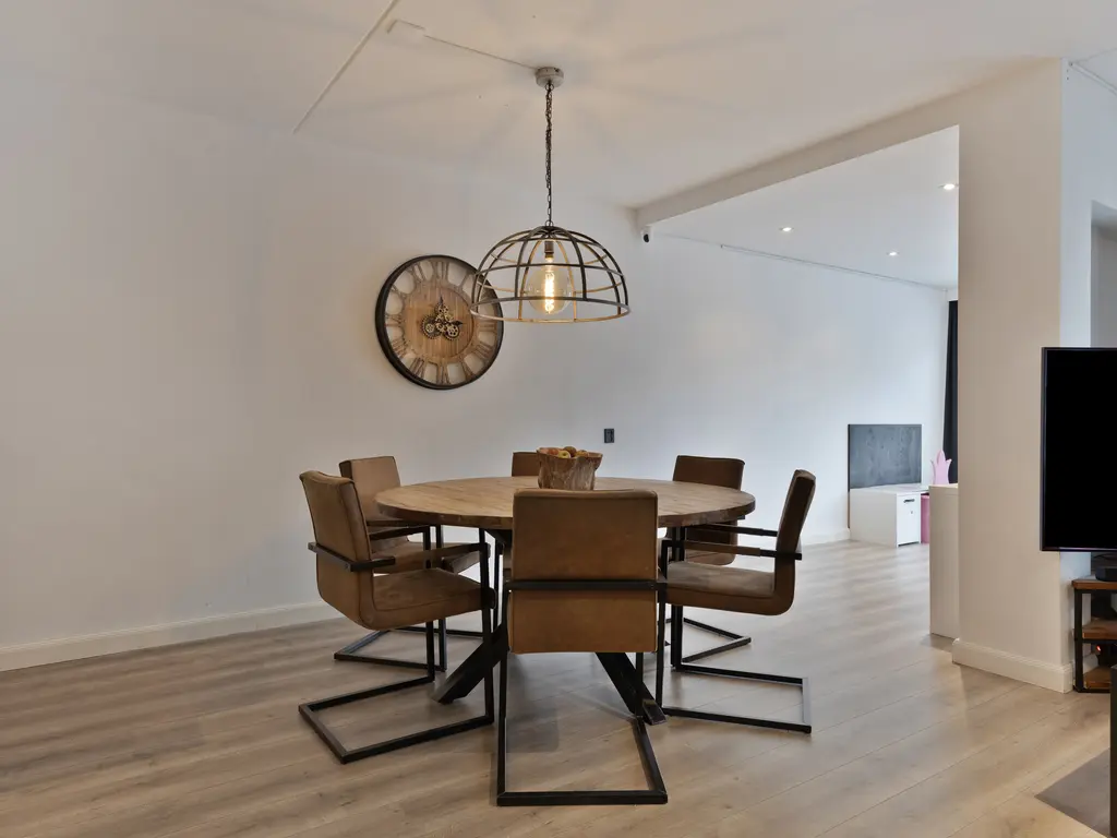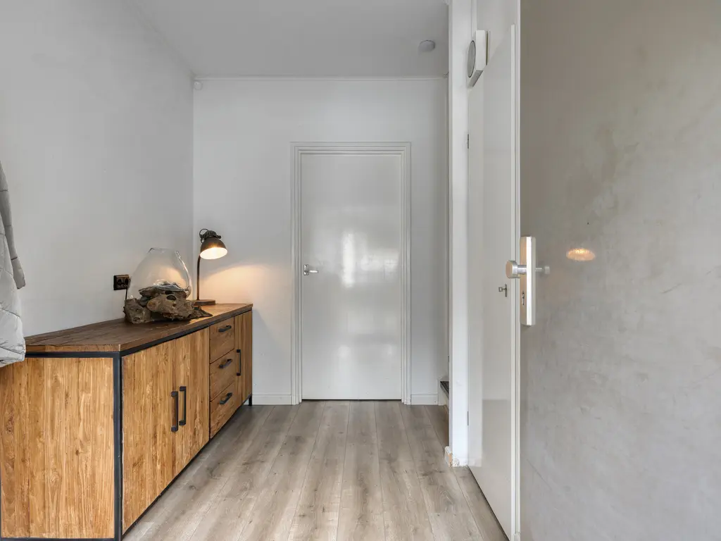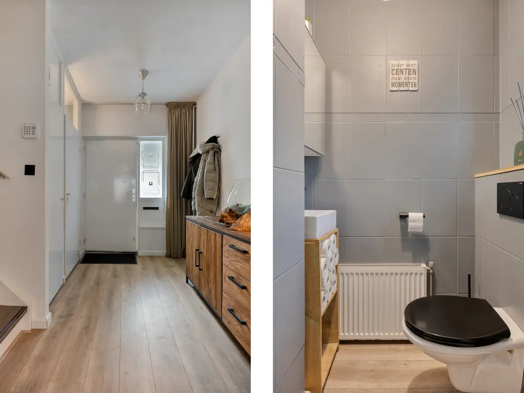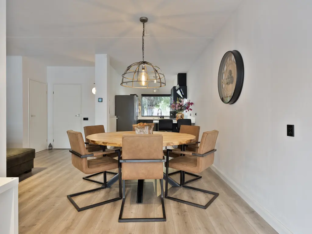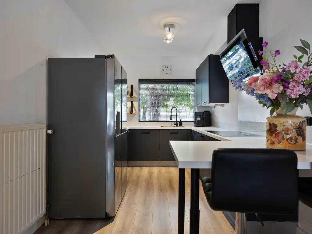 Entering through the spacious hallway with toilet, you step into the bright living room with open kitchen. Thanks to the rear extension, a generous living area has been created where light, tranquillity and comfort come together. The sleek finish, modern flooring and large windows create a pleasant, homely atmosphere. The open kitchen is both practical and stylish, equipped with built-in appliances such as an induction hob, dishwasher, oven, microwave and extractor hood. A place where cooking and being together come naturally.