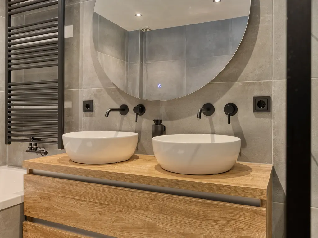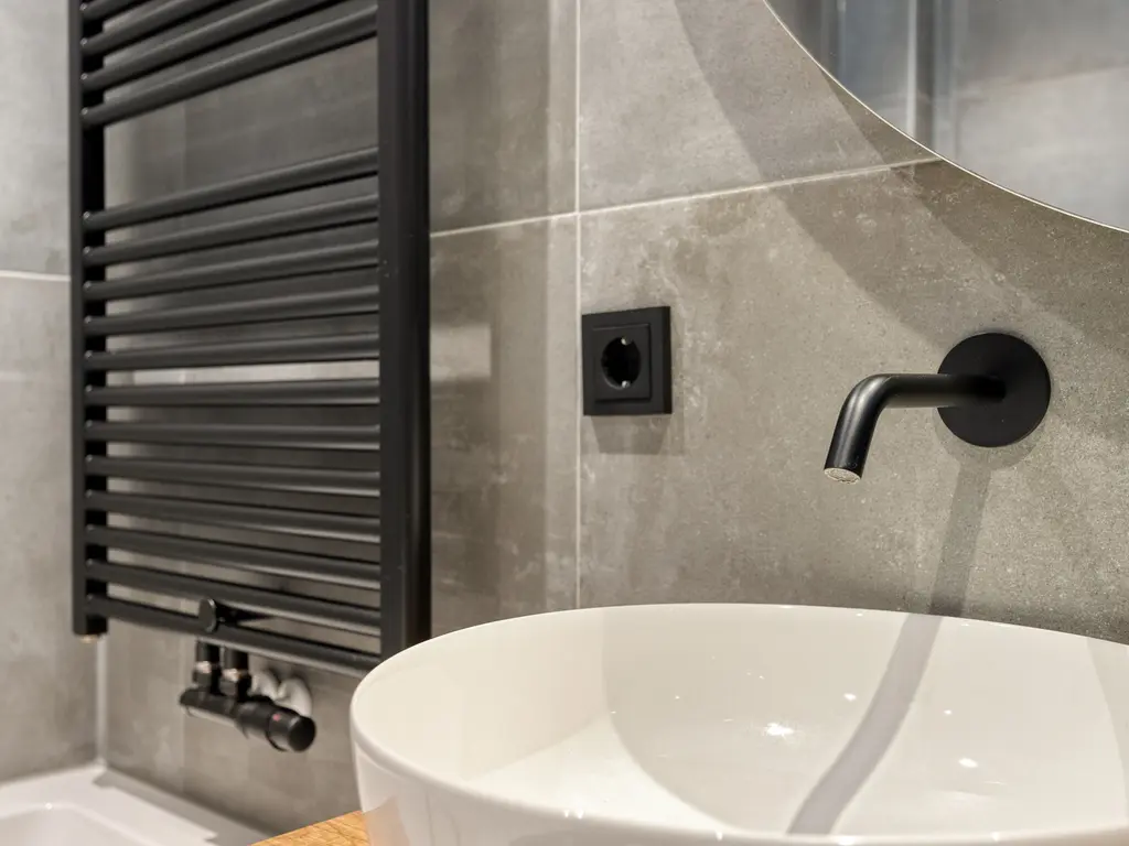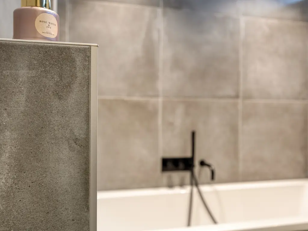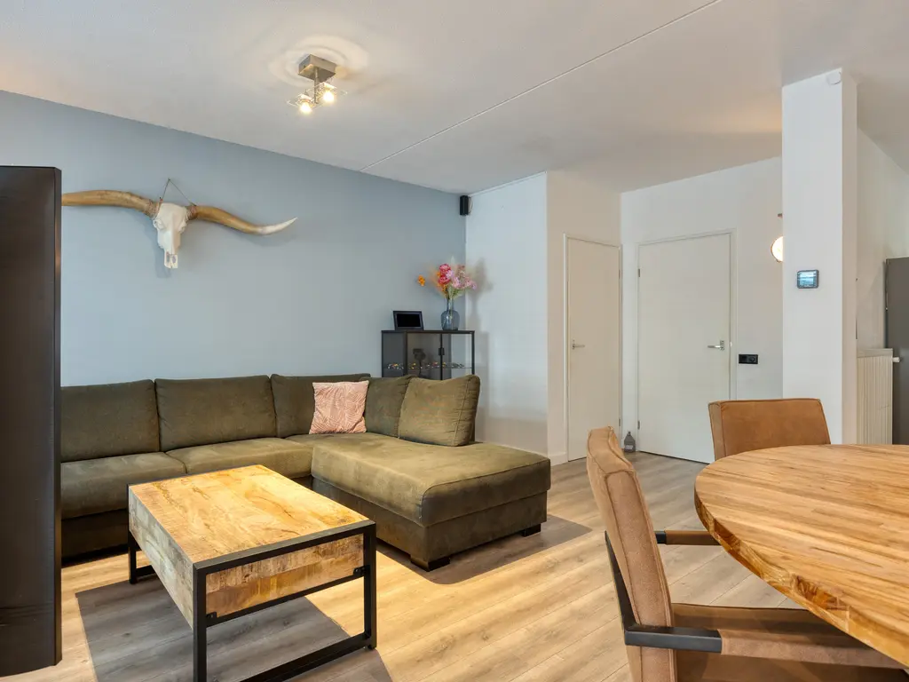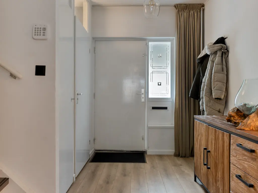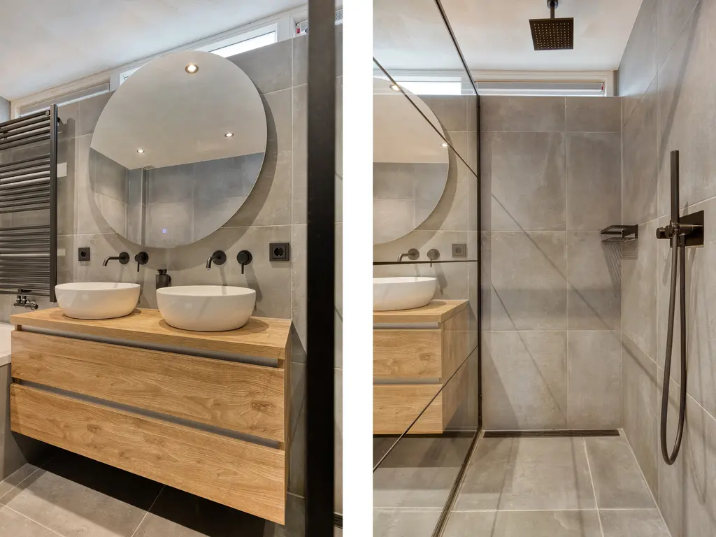 Entering through the spacious hallway with toilet, you step into the bright living room with open kitchen. Thanks to the rear extension, a generous living area has been created where light, tranquillity and comfort come together. The sleek finish, modern flooring and large windows create a pleasant, homely atmosphere. The open kitchen is both practical and stylish, equipped with built-in appliances such as an induction hob, dishwasher, oven, microwave and extractor hood. A place where cooking and being together come naturally.