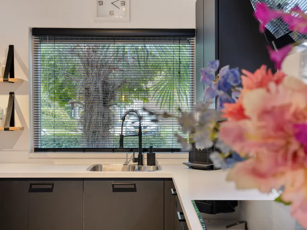 Binnenkomend via de ruime hal met toilet stap je de lichte woonkamer met open keuken binnen. Door de uitbouw aan de achterzijde is er een royale leefruimte ontstaan waar licht, rust en comfort samenkomen. De strakke afwerking, moderne vloer en grote ramen zorgen voor een prettige, huiselijke sfeer. De open keuken is praktisch en stijlvol, voorzien van inbouwapparatuur zoals een inductiekookplaat, vaatwasser, oven, magnetron en afzuigkap. Een plek waar koken en samenzijn vanzelf gaan.