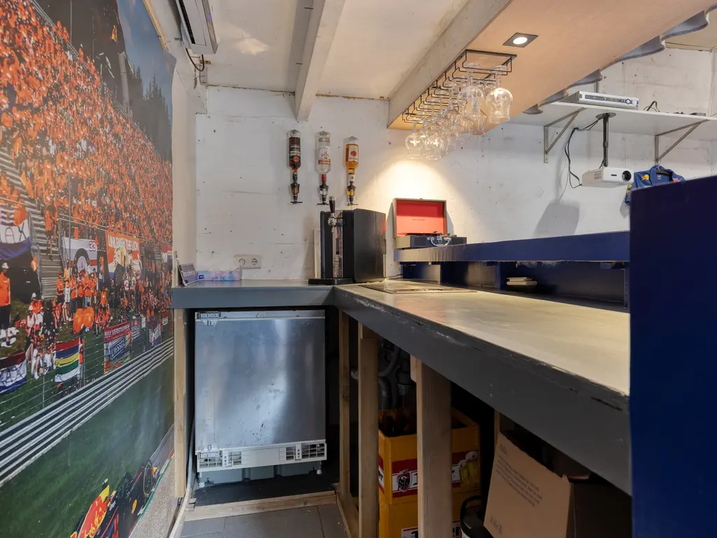 De achtertuin is strak en onderhoudsvriendelijk aangelegd. Onder de overkapping kun je het hele jaar door genieten van het buitenleven, van lange zomeravonden tot knusse herfstborrels. Achterin de tuin wacht iets bijzonders: een stenen schuur die is omgetoverd tot mancave met eigen bar, elektra en wateraansluiting. De ideale plek om te ontspannen, een potje te darten of met vrienden de Formule 1 te kijken. De bar is eventueel ter overname.