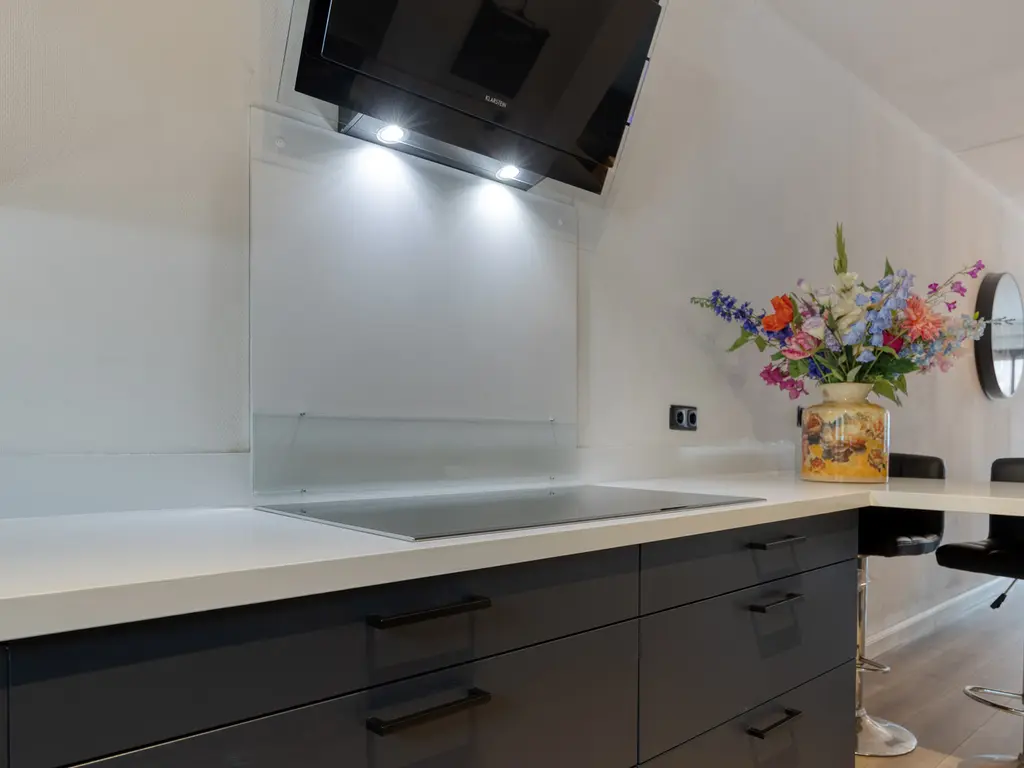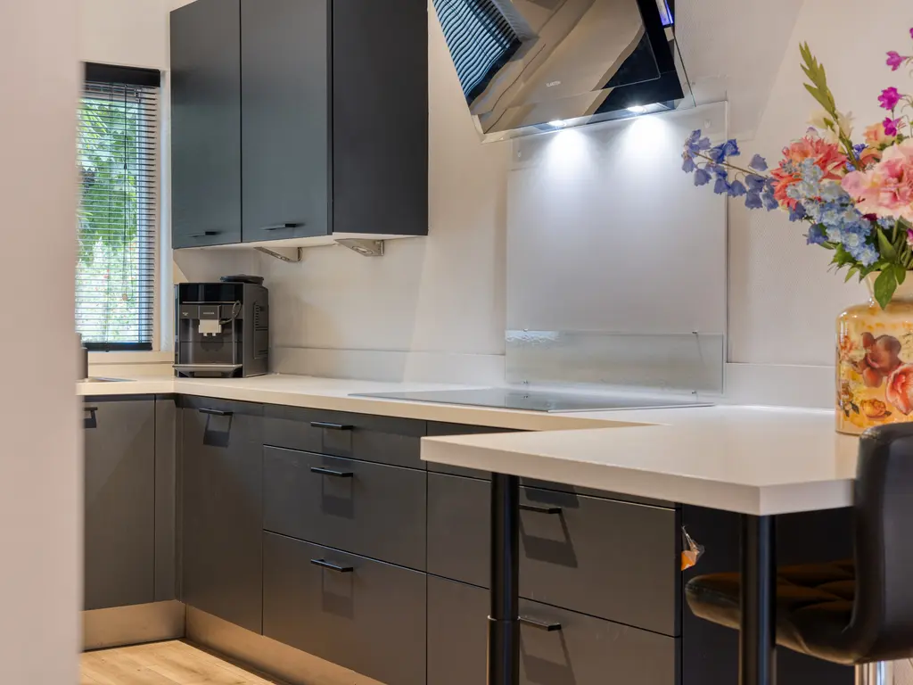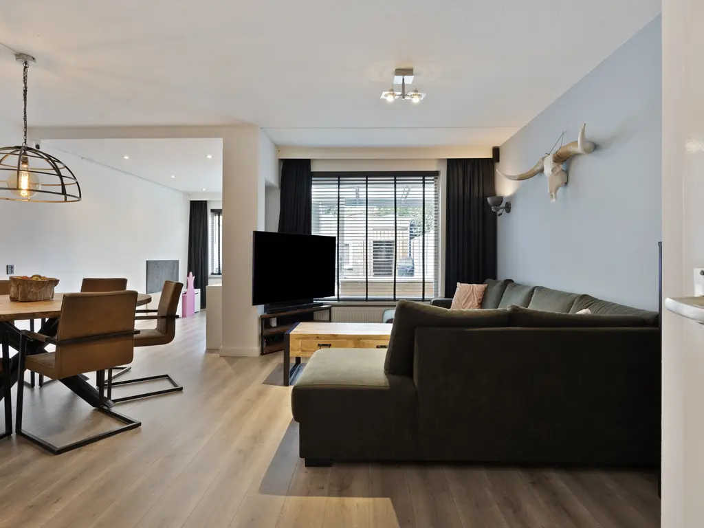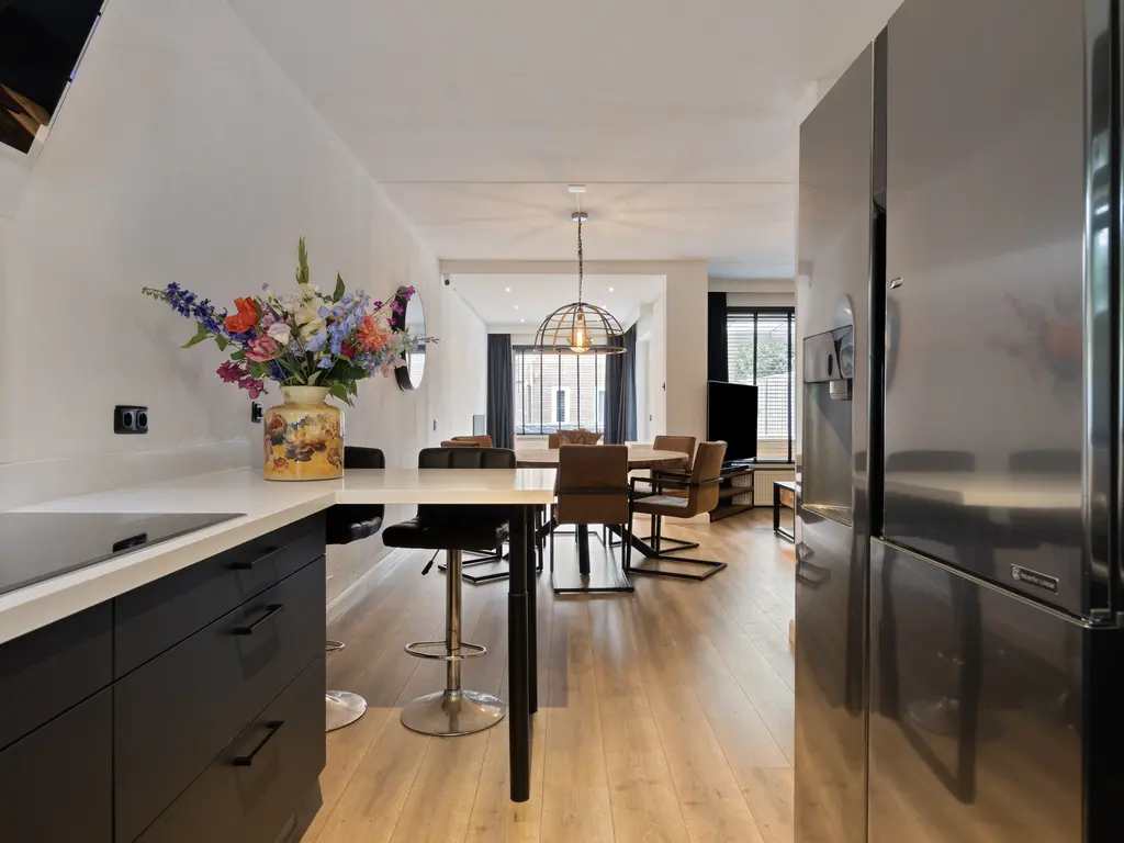 Entering through the spacious hallway with toilet, you step into the bright living room with open kitchen. Thanks to the rear extension, a generous living area has been created where light, tranquillity and comfort come together. The sleek finish, modern flooring and large windows create a pleasant, homely atmosphere. The open kitchen is both practical and stylish, equipped with built-in appliances such as an induction hob, dishwasher, oven, microwave and extractor hood. A place where cooking and being together come naturally.