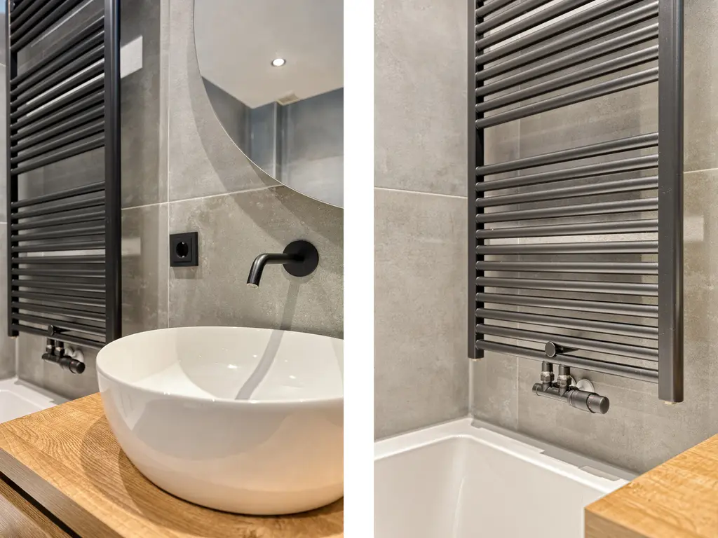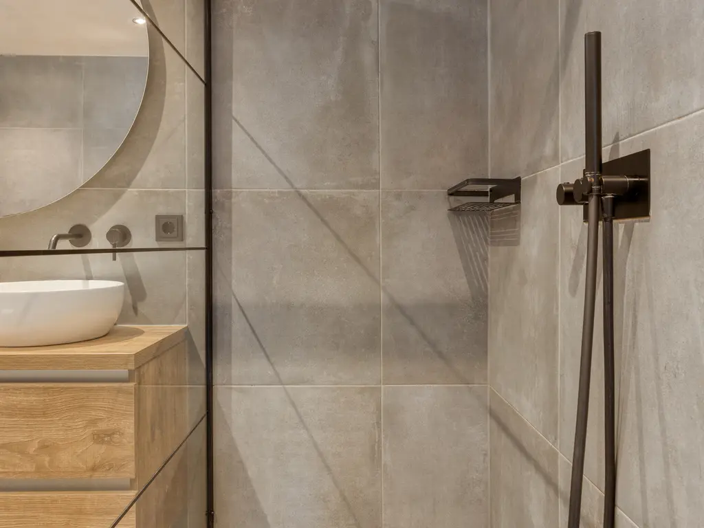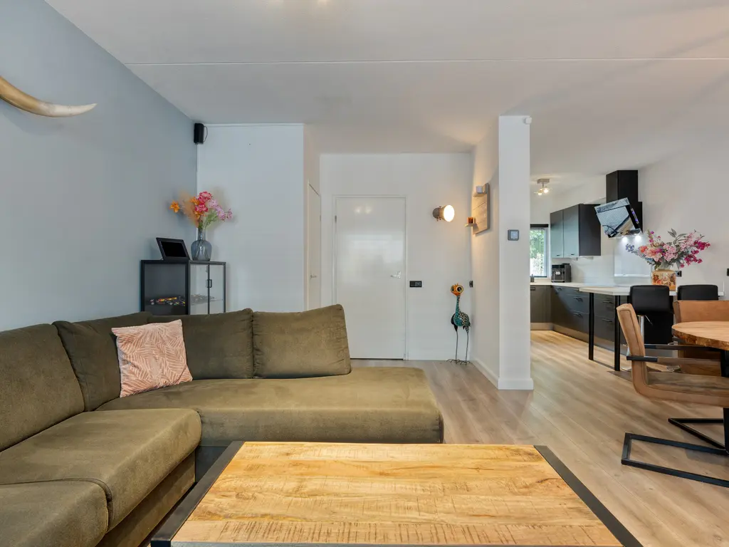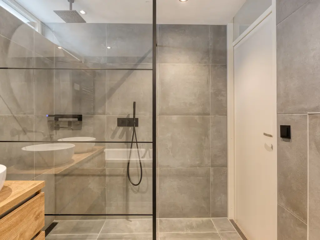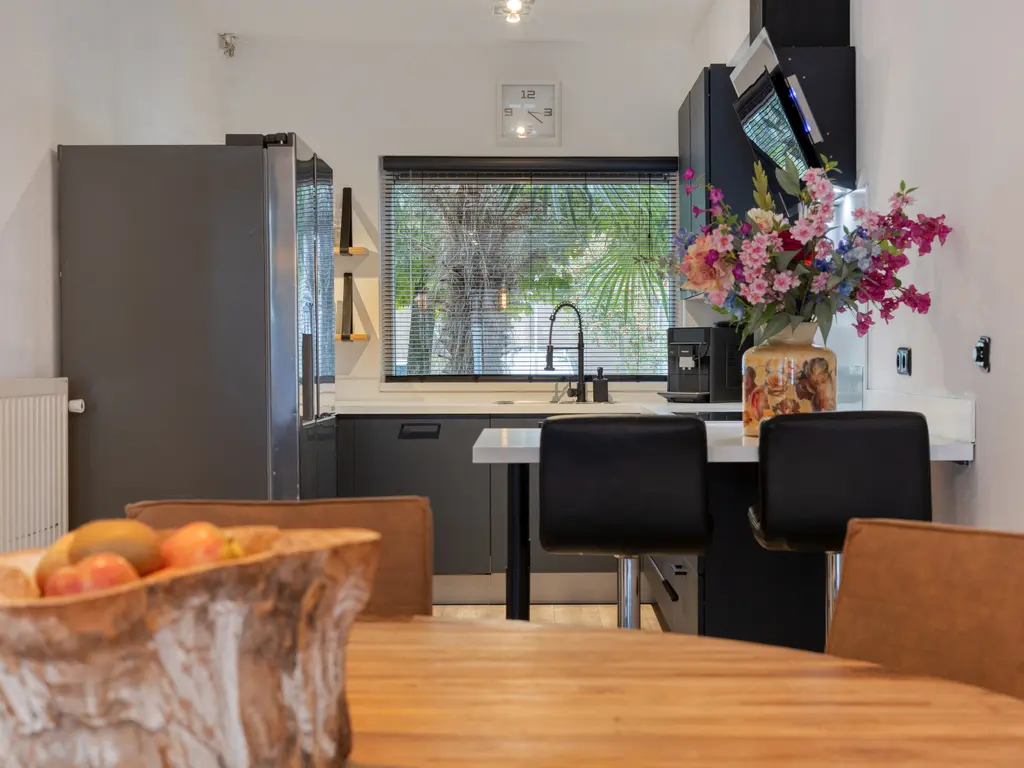 Entering through the spacious hallway with toilet, you step into the bright living room with open kitchen. Thanks to the rear extension, a generous living area has been created where light, tranquillity and comfort come together. The sleek finish, modern flooring and large windows create a pleasant, homely atmosphere. The open kitchen is both practical and stylish, equipped with built-in appliances such as an induction hob, dishwasher, oven, microwave and extractor hood. A place where cooking and being together come naturally.