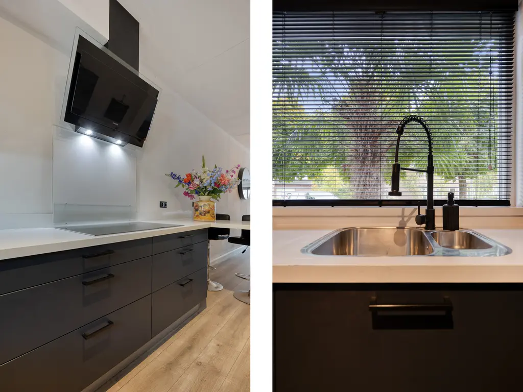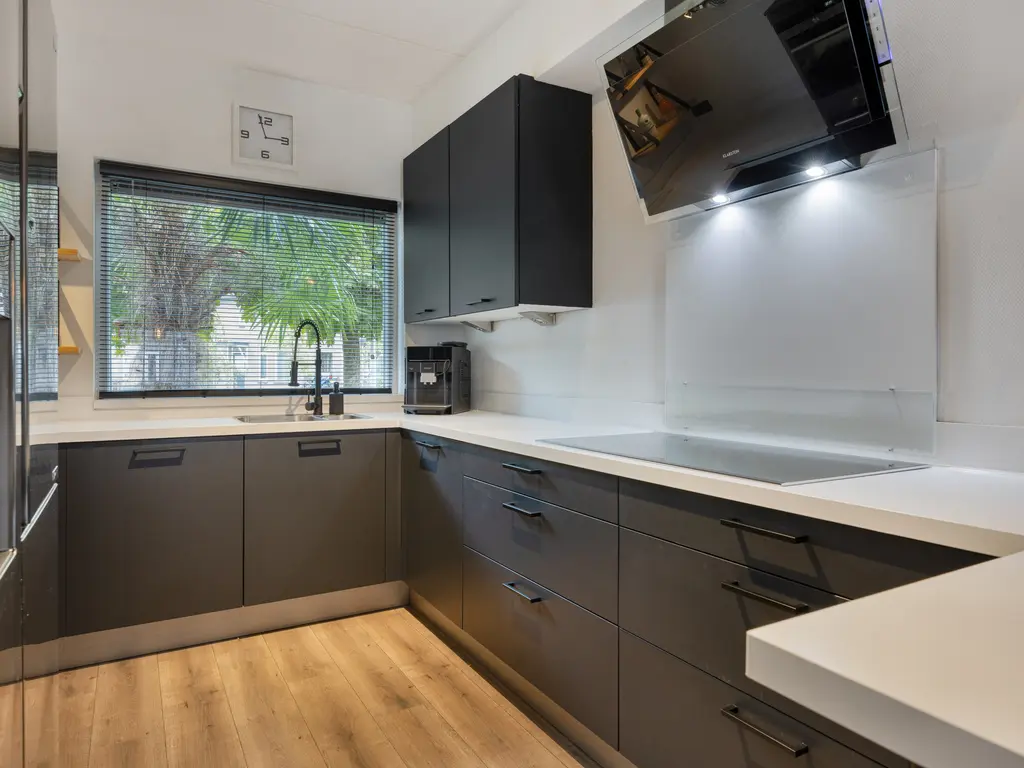 Binnenkomend via de ruime hal met toilet stap je de lichte woonkamer met open keuken binnen. Door de uitbouw aan de achterzijde is er een royale leefruimte ontstaan waar licht, rust en comfort samenkomen. De strakke afwerking, moderne vloer en grote ramen zorgen voor een prettige, huiselijke sfeer. De open keuken is praktisch en stijlvol, voorzien van inbouwapparatuur zoals een inductiekookplaat, vaatwasser, oven, magnetron en afzuigkap. Een plek waar koken en samenzijn vanzelf gaan.